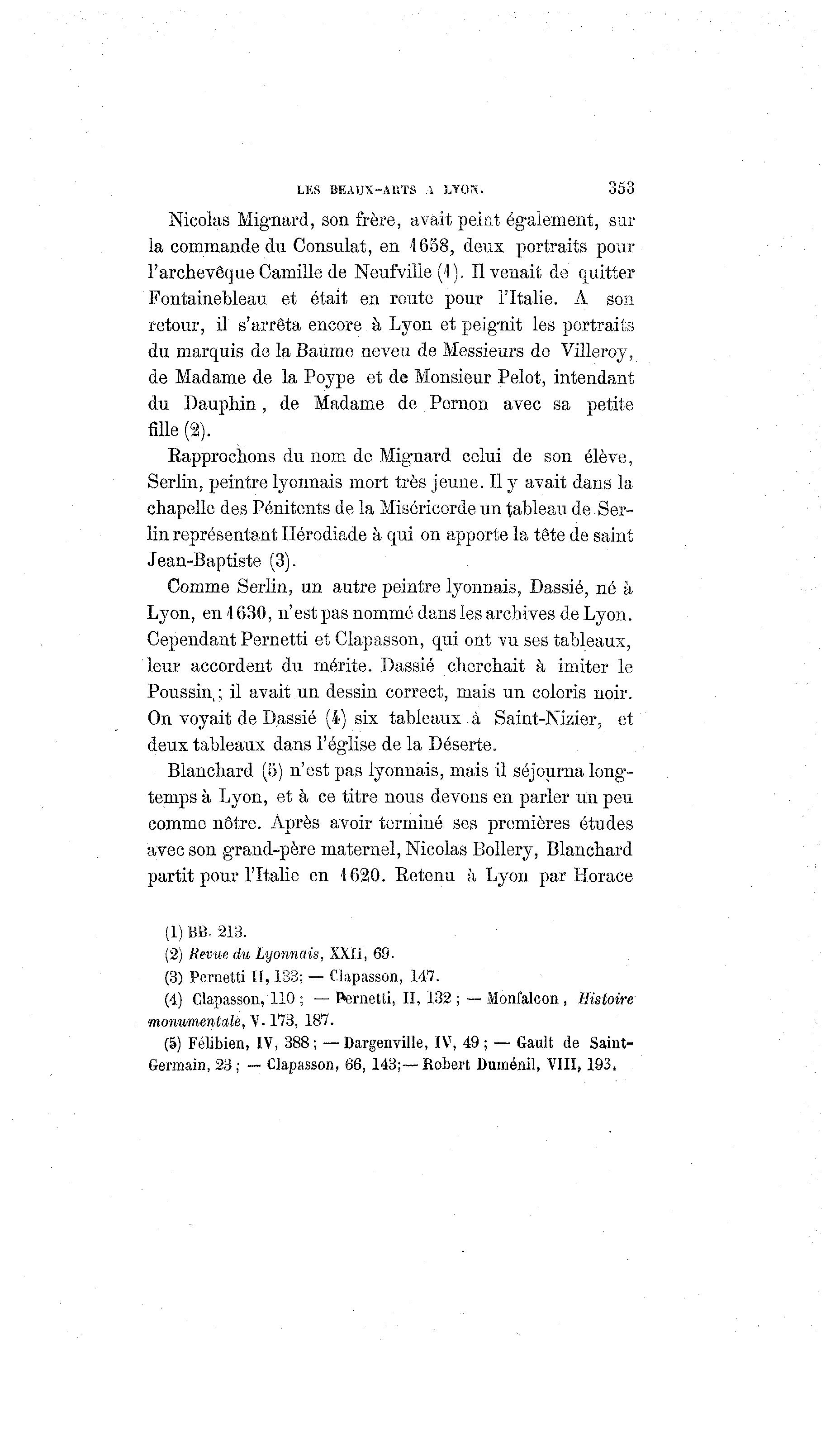 LES BEAUX-ABTS A LYON. 353 Nicolas Mignard, son frère, avait peint également, sur la commande du Consulat, en 4658, deux portraits pour l'archevêque Camille de Neufville (4). Il venait de quitter Fontainebleau et était en route pour l'Italie. A son retour, il s'arrêta encore à Lyon et peignit les portraits du marquis de la Baume neveu de Messieurs de Villeroy, de Madame de la Poype et de Monsieur Pelot, intendant du Dauphin, de Madame de Pernon avec sa petite fille (2). Rapprochons du nom de Mignard celui de son élève, Serlin, peintre lyonnais mort très jeune. Il y avait dans la chapelle des Pénitents de la Miséricorde un tableau de Ser- lin représentant Hérodiade à qui on apporte la tête de saint Jean-Baptiste (3). Comme Serlin, un autre peintre lyonnais, Dassié, né à Lyon, en 4 630, n'est pas nommé dans les archives de Lyon. Cependant Pernetti et Clapasson, qui ont vu ses tableaux, leur accordent du mérite. Dassié cherchait à imiter le Poussin, ; il avait un dessin correct, mais un coloris noir. On voyait de Dassié (4) six tableaux. à Saint-Nizier, et deux tableaux dans l'église de la Déserte. Blanchard (o) n'est pas lyonnais, mais il séjourna long- temps à Lyon, et à ce titre nous devons en parler un peu comme nôtre. Après avoir terminé ses premières études avec son grand-père maternel, Nicolas Bollery, Blanchard partit pour l'Italie en 4 620. Retenu à Lyon par Horace (1) BB. 213. (2) Revue du Lyonnais, XXII, 69. (3) Pernetti II, 133; — Clapasson, 147. (4) Clapasson, 110 ; — Pernetti, II, 132 ; — Monfalcon , Histoire monumentale, V. 173, 187. (5) Félibien, IV, 388 ; — Dargenville, IV, 49 ; — Gault de Saint- Germain, 23; — Clapasson, 66, 143;—Robert Duménil, VIII, 193,