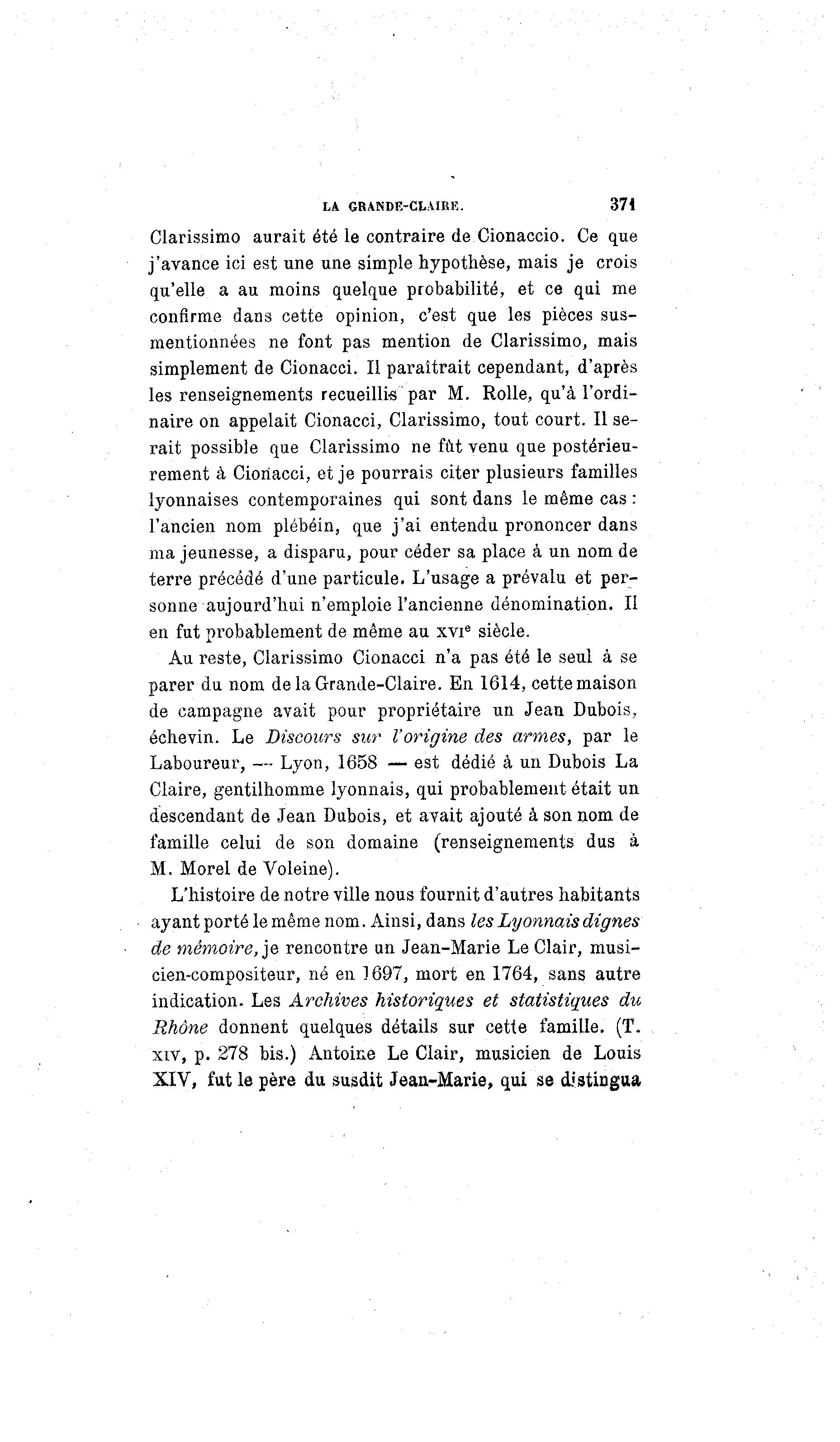 LA GRANDE-CLMRE. 371 Clarissimo aurait été le contraire de Cionaccio. Ce que j'avance ici est une une simple hypothèse, mais je crois qu'elle a au moins quelque probabilité, et ce qui me confirme dans cette opinion, c'est que les pièces sus- mentionnées ne font pas mention de Clarissimo, mais simplement de Cionacci. Il paraîtrait cependant, d'après les renseignements recueillis par M. Rolle, qu'à l'ordi- naire on appelait Cionacci, Clarissimo, tout court. Il se- rait possible que Clarissimo ne fût venu que postérieu- rement à Cionacci, et je pourrais citer plusieurs familles lyonnaises contemporaines qui sont dans le même cas : l'ancien nom plébéin, que j'ai entendu prononcer dans ma jeunesse, a disparu, pour céder sa place à un nom de terre précédé d'une particule. L'usage a prévalu et per- sonne aujourd'hui n'emploie l'ancienne dénomination. Il en fut probablement de même au xvie siècle. Au reste, Clarissimo Cionacci n'a pas été le seul à se parer du nom de la Grande-Claire. En 1614, cette maison de campagne avait pour propriétaire un Jean Dubois, échevin. Le Discours sur l'origine des armes, par le Laboureur, — Lyon, 1658 — est dédié à un Dubois La Claire, gentilhomme lyonnais, qui probablement était un descendant de Jean Dubois, et avait ajouté à son nom de famille celui de son domaine (renseignements dus à M. Morel de Voleine). L'histoire de notre ville nous fournit d'autres habitants ayant porté le même nom. Ainsi, dans les Lyonnais dignes de mémoire, je rencontre un Jean-Marie Le Clair, musi- cien-compositeur, né en 1697, mort en 1764, sans autre indication. Les Archives historiques et statistiques du Rhône donnent quelques détails sur cette famille. (T. xiv, p. 278 bis.) Antoine Le Clair, musicien de Louis XIV, fut le père du susdit Jean-Marie, qui se distingua