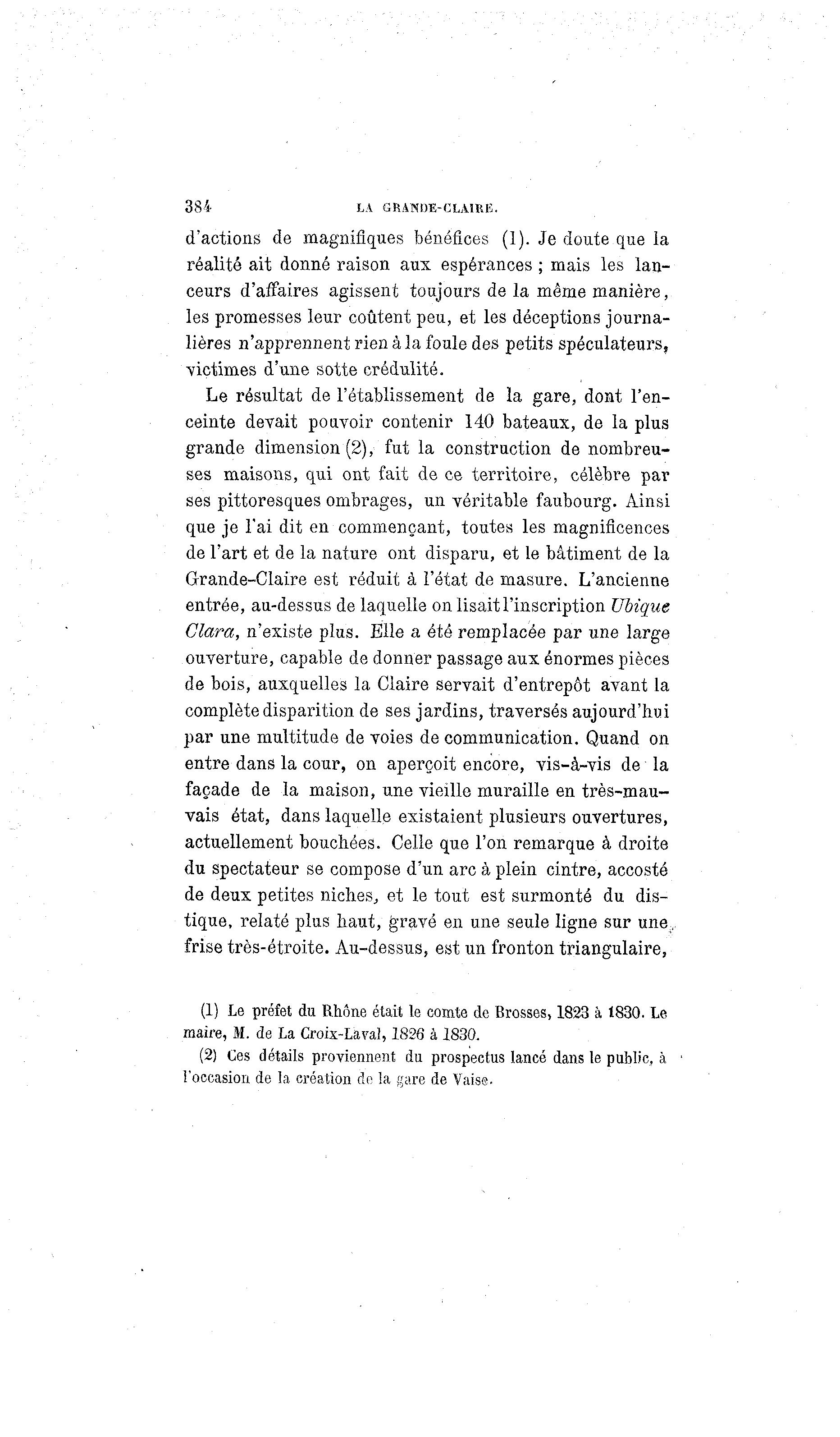 384 LA GRANDE-CLAIRE. d'actions de magnifiques bénéfices (1). Je doute que la réalité ait donné raison aux espérances ; mais les lan- ceurs d'affaires agissent toujours de la même manière, les promesses leur coûtent peu, et les déceptions journa- lières n'apprennent rien à la foule des petits spéculateurs, victimes d'une sotte crédulité. Le résultat de l'établissement de la gare, dont l'en- ceinte devait pouvoir contenir 140 bateaux, de la plus grande dimension (2), fut la construction de nombreu- ses maisons, qui ont fait de ce territoire, célèbre par ses pittoresques ombrages, un véritable faubourg. Ainsi que je l'ai dit en commençant, toutes les magnificences de l'art et de la nature ont disparu, et le bâtiment de la Grande-Claire est réduit à l'état de masure. L'ancienne entrée, au-dessus de laquelle on lisait l'inscription Ubique Clara, n'existe plus. Elle a été remplacée par une large ouverture, capable de donner passage aux énormes pièces de bois, auxquelles la Claire servait d'entrepôt avant la complète disparition de ses jardins, traversés aujourd'hui par une multitude de voies de communication. Quand on entre dans la cour, on aperçoit encore, vis-à -vis de la façade de la maison, une vieille muraille en très-mau- vais état, dans laquelle existaient plusieurs ouvertures, actuellement boucliées. Celle que l'on remarque à droite du spectateur se compose d'un arc à plein cintre, accosté de deux petites niches., et le tout est surmonté du dis- tique, relaté plus haut, gravé en une seule ligne sur une., frise très-étroite. Au-dessus, est un fronton triangulaire, (1) Le préfet du Rhône était le comte de Brosses, 1823 à 1830. Le maire, M. de La Croix-Laval, 1826 à 1830. (2) Ces détails proviennent du prospectus lancé dans le public, à l'occasion de la création de la gare de Vaise.