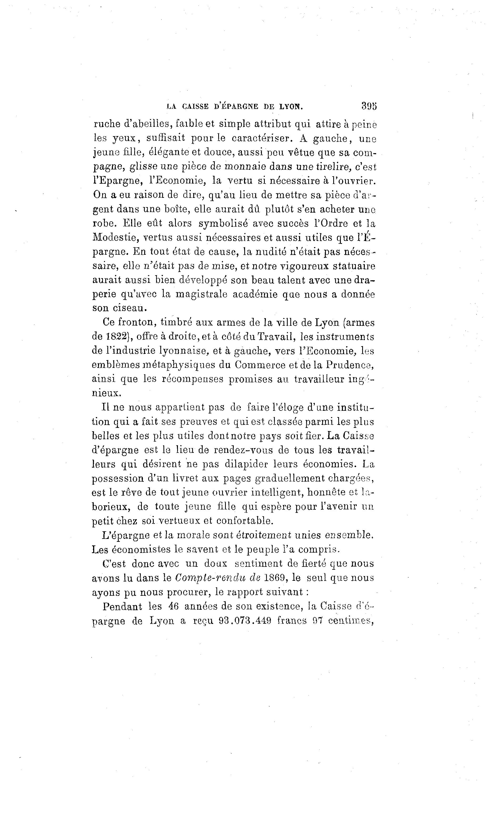 LA CAISSE D'ÉPARGNE DE LYON. 395 ruche d'abeilles, faible et simple attribut qui attire à peine les yeux, suffisait pour le caractériser. A gauche, une jeune fille, élégante et douce, aussi peu vêtue que sa com- pagne, glisse une pièce de monnaie dans une tirelire, c'est l'Epargne, l'Economie, la vertu si nécessaire à l'ouvrier. On a eu raison de dire, qu'au lieu de mettre sa pièce d'ar- gent dans une boîte, elle aurait dû plutôt s'en acheter une robe. Elle eût alors symbolisé avec succès l'Ordre et la Modestie, vertus aussi nécessaires et aussi utiles que l'E- pargne. En tout état de cause, la nudité n'était pas néces- saire, elle n'était pas de mise, et notre vigoureux statuaire aurait aussi bien développé son beau talent avec une dra- perie qu'avec la magistrale académie que nous a donnée son ciseau. Ce fronton, timbré aux armes de la ville de Lyon (armes de 1822), offre à droite, et à côté du Travail, les instruments de l'industrie lyonnaise, et à gauche, vers l'Economie, les emblèmes métaphysiques du Commerce et de la Prudence, ainsi que les récompenses promises au travailleur ingé- nieux. Il ne nous appartient pas de faire l'éloge d'une institu- tion qui a fait ses preuves et qui est classée parmi les plus belles et les plus utiles dont notre pays soit fier. La Caisse d'épargne est le lieu de rendez-vous de tous les travail- leurs qui désirent ne pas dilapider leurs économies. La possession d'un livret aux pages graduellement chargées, est le rêve de tout jeune ouvrier intelligent, honnête et la- borieux, de toute jeune fille qui espère pour l'avenir un petit chez soi vertueux et confortable. L'épargne et la morale sont étroitement unies ensemble. Les économistes le savent et le peuple l'a compris. C'est donc avec un doux sentiment de fierté que nous avons lu dans le Compte-rendu de 1869, le seul que nous ayons pu nous procurer, le rapport suivant : Pendant les 46 années de son existence, la Caisse d'é- pargne de Lyon a reçu 93.073.449 francs 97 centimes,