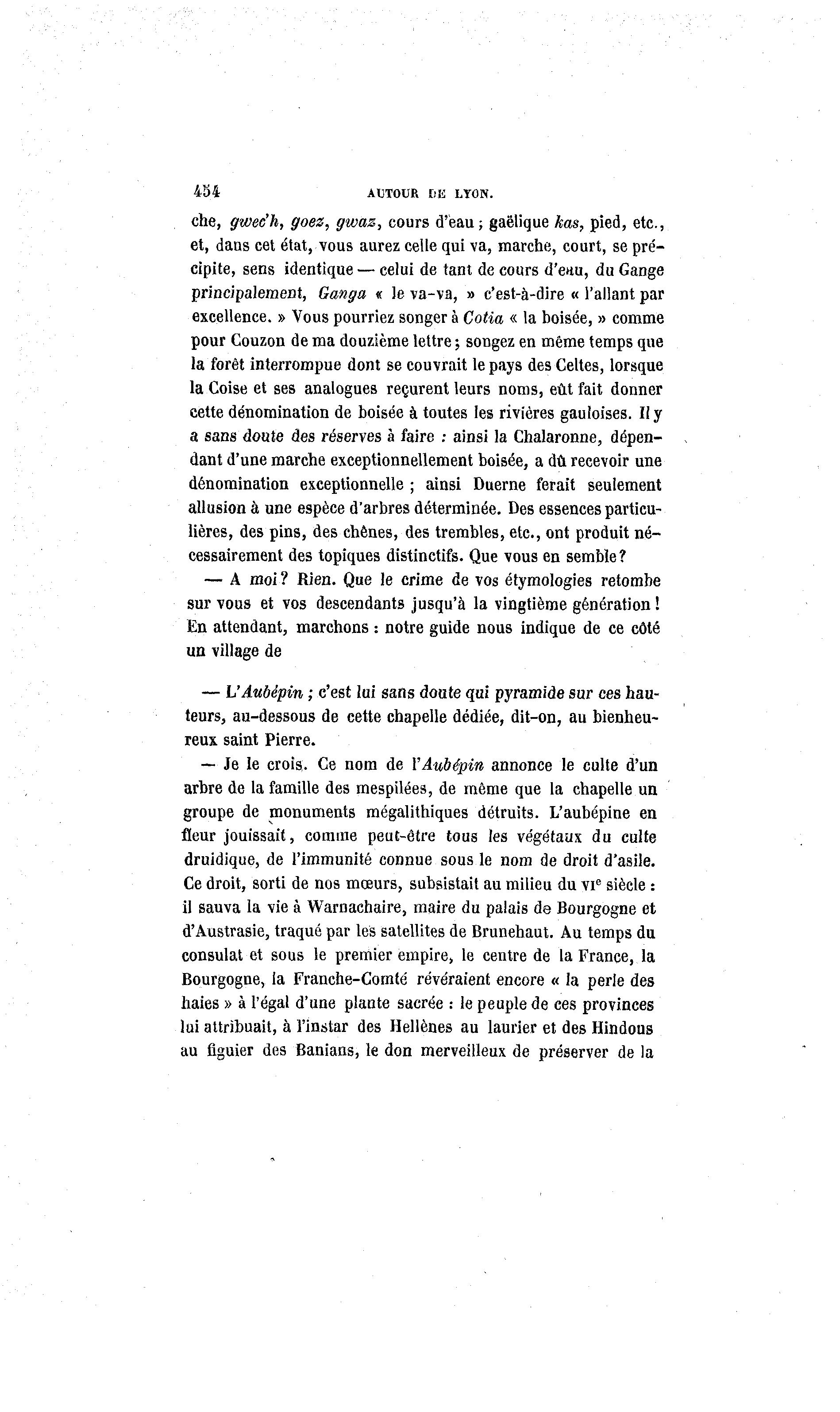 434 AUTOUR DE LYON. che, gwec'h, goez, gwaz, cours d'eau; gaélique kas, pied, etc., et, dans cet état, vous aurez celle qui va, marche, court, se pré- cipite, sens identique — celui de tant de cours d'enu, du Gange principalement, Ganga « le va-va, » c'est-à -dire « l'allant par excellence. » Vous pourriez songer à Cotia « la boisée, » comme pour Couzon de ma douzième lettre ; songez en même temps que la forêt interrompue dont se couvrait le pays des Celtes, lorsque la Coise et ses analogues reçurent leurs noms, eût fait donner cette dénomination de boisée à toutes les rivières gauloises. Il y a sans doute des réserves à faire : ainsi la Chalaronne, dépen- dant d'une marche exceptionnellement boisée, a dû recevoir une dénomination exceptionnelle ; ainsi Duerne ferait seulement allusion à une espèce d'arbres déterminée. Des essences particu- lières, des pins, des chênes, des trembles, etc., ont produit né- cessairement des topiques distinctifs. Que vous en semble? — A moi ? Rien. Que le crime de vos étymologies retombe sur vous et vos descendants jusqu'à la vingtième génération ! En attendant, marchons : notre guide nous indique de ce côté un village de — L'Aubépin ; c'est lui sans doute qui pyramide sur ces hau- teurs, au-dessous de cette chapelle dédiée, dit-on, au bienheu- reux saint Pierre. — Je le crois. Ce nom de YAubépin annonce le culte d'un arbre de la famille des mespilées, de même que la chapelle un groupe de monuments mégalithiques détruits. L'aubépine en fleur jouissait, comme peut-être tous les végétaux du culte druidique, de l'immunité connue sous le nom de droit d'asile. Ce droit, sorti de nos mœurs, subsistait au milieu du vie siècle : il sauva la vie à Warnachaire, maire du palais de Bourgogne et d'Austrasie, traqué par les satellites de Brunehaut. Au temps du consulat et sous le premier empire, le centre de la France, la Bourgogne, la Franche-Comté révéraient encore « la perle des haies » à l'égal d'une plante sacrée : le peuple de ces provinces lui attribuait, à l'instar des Hellènes au laurier et des Hindous au figuier des Banians, le don merveilleux de préserver de la