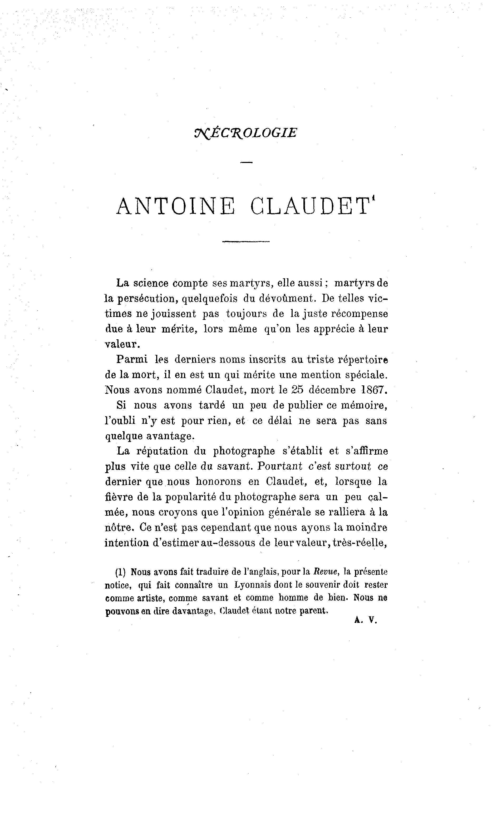 C^ÊC%0L0GIE ANTOINE CLAUDET' La science compte ses martyrs, elle aussi; martyrs de la persécution, quelquefois du dévoûment. De telles vic- times ne jouissent pas toujours de la juste récompense due à leur mérite, lors même qu'on les apprécie à leur valeur. Parmi les derniers noms inscrits au triste répertoire de la mort, il en est un qui mérite une mention spéciale. Nous avons nommé Claudet, mort le 25 décembre 1867. Si nous avons tardé un peu de publier ce mémoire, l'oubli n'y est pour rien, et ce délai ne sera pas sans quelque avantage. La réputation du photographe s'établit et s'affirme plus vite que celle du savant. Pourtant c'est surtout ce dernier que nous honorons en Claudet, et, lorsque la fièvre de la popularité du photographe sera un peu cal- mée, nous croyons que l'opinion générale se ralliera à la nôtre. Ce n'est pas cependant que nous ayons la moindre intention d'estimer au-dessous de leur valeur, très-réelle, (1) Nous avons fait traduire de l'anglais, pour la Revue, la présente notice, qui fait connaître un Lyonnais dont le souvenir doit rester comme artiste, comme savant et comme homme de bien. Nous ne pouvons en dire davantage, Claudet étant notre parent.
