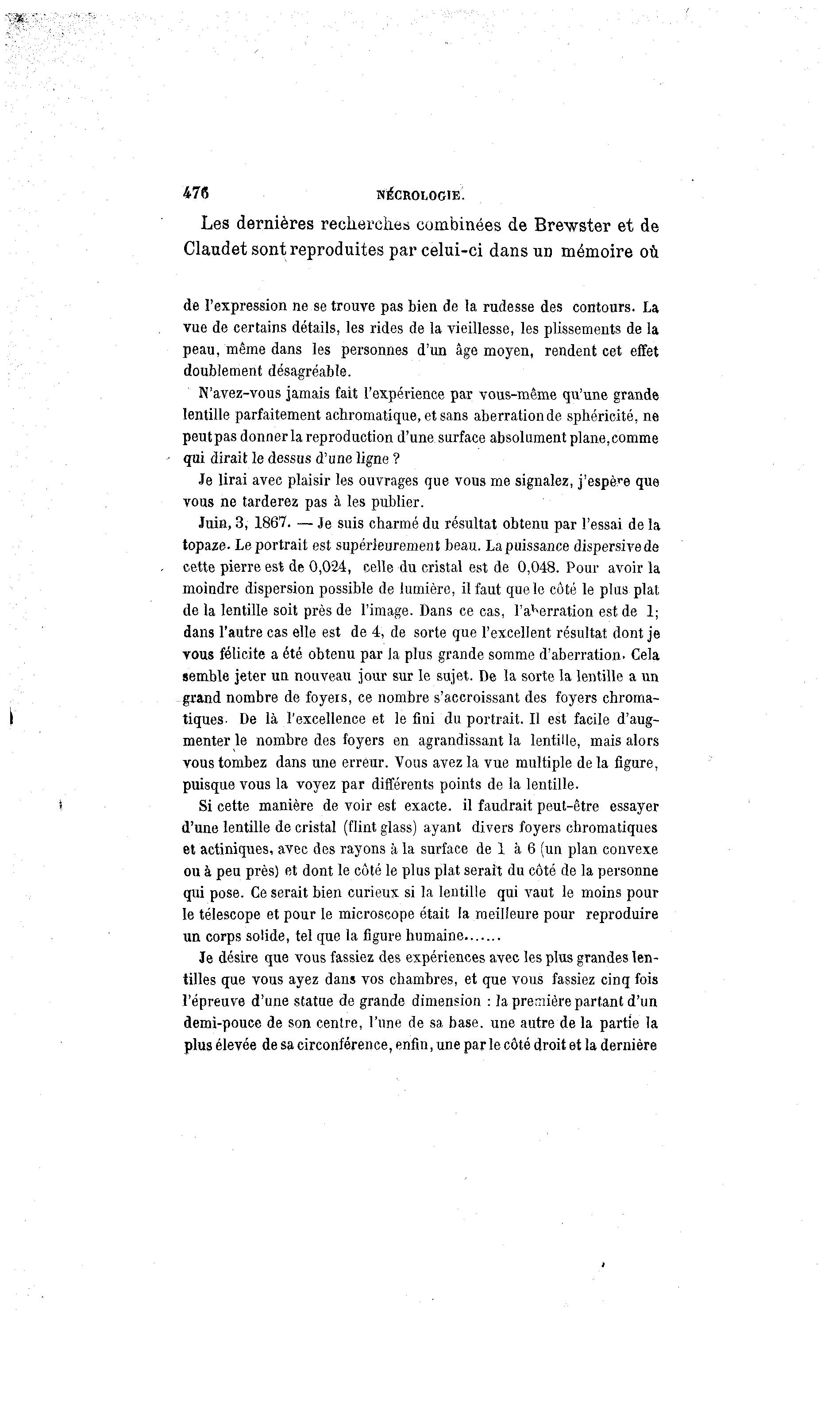 476 NÉCROLOGIE. Les dernières recherches combinées de Brewster et de Claudet sont reproduites par celui-ci dansuD mémoire où de l'expression ne se trouve pas bien de la rudesse des contours. La vue de certains détails, les rides de la vieillesse, les plissements de la peau, même dans les personnes d'un âge moyen, rendent cet effet doublement désagréable. N'avez-vous jamais fait l'expérience par vous-même qu'une grande lentille parfaitement achromatique, et sans aberration de sphéricité, ne peut pas donner la reproduction d'une surface absolument plane, comme qui dirait le dessus d'une ligne ? Je lirai avec plaisir les ouvrages que vous me signalez, j'espère que vous ne tarderez pas à les publier. Juin, 3, 1867. — Je suis charmé du résultat obtenu par l'essai de la topaze. Le portrait est supérieurement beau. La puissance dispersivede cette pierre est de 0,024, celle du cristal est de 0,048. Pour avoir la moindre dispersion possible de lumière, il faut que le côté le plus plat de la lentille soit près de l'image. Dans ce cas, l'aberration est de 1; dans l'autre cas elle est de 4, de sorte que l'excellent résultat dont je vous félicite a été obtenu par la plus grande somme d'aberration. Cela semble jeter un nouveau jour sur le sujet. De la sorte la lentille a un grand nombre de foyers, ce nombre s'accroissant des foyers chroma- tiques- De là l'excellence et le fini du portrait. Il est facile d'aug- menter le nombre des foyers en agrandissant la lentille, mais alors vous tombez dans une erreur. Vous avez la vue multiple de la figure, puisque vous la voyez par différents points de la lentille. Si cette manière de voir est exacte, il faudrait peut-être essayer d'une lentille de cristal (flint glass) ayant divers foyers chromatiques et aetiniques, avec des rayons à la surface de 1 à 6 (un plan convexe ou à peu près) et dont le côté le plus plat serait du côté de la personne qui pose. Ce serait bien curieux si la lentille qui vaut le moins pour le télescope et pour le microscope était la meilleure pour reproduire un corps solide, tel que la figure humaine Je désire que vous fassiez des expériences avec les plus grandes len- tilles que vous ayez dans vos chambres, et que vous fassiez cinq fois l'épreuve d'une statue de grande dimension : la première partant d'un demi-pouce de son centre, l'une de sa base, une autre de la partie la plus élevée de sa circonférence, enfin, une par le côté droit et la dernière
