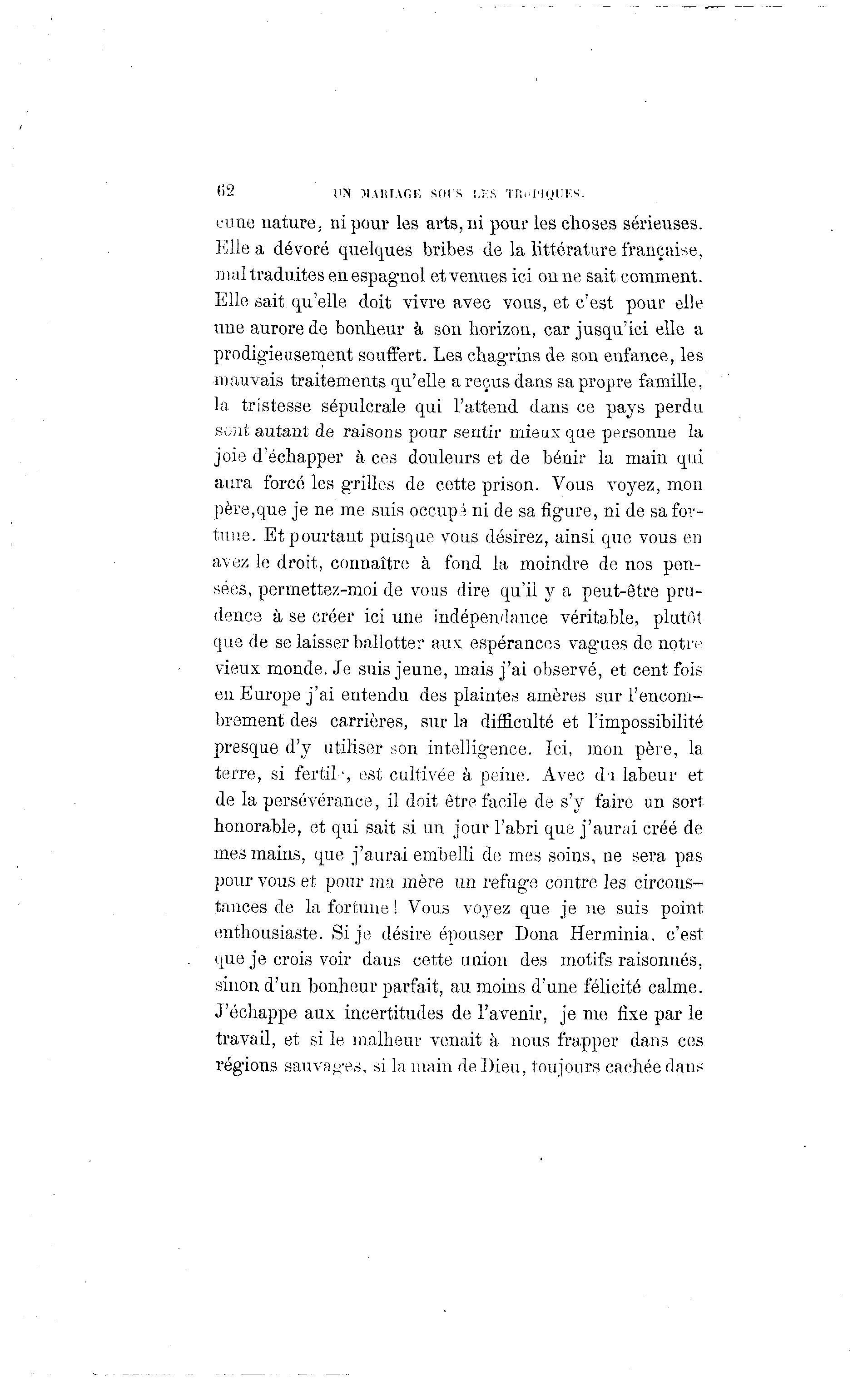 (12 UN MAnr.vGK s o r s i.;:s TR.'I'IOUFS. cime nature, ni pour les arts, ni pour les choses sérieuses. Elle a dévoré quelques bribes de la littérature française, mal traduites en espagnol et venues ici on ne sait comment. Elle sait qu'elle doit vivre avec vous, et c'est pour elle une aurore de bonheur à son horizon, car jusqu'ici elle a prodigieusement souffert. Les chagrins de son enfance, les mauvais traitements qu'elle a reçus dans sa propre famille, la tristesse sépulcrale qui l'attend dans ce pays perdu sont autant de raisons pour sentir mieux que personne la joie d'échapper à ces douleurs et de bénir la main qui aura forcé les grilles de cette prison. Vous voyez, mon père,que je ne me suis occupé ni de sa figure, ni de sa for- tune. Et pourtant puisque vous désirez, ainsi que vous eu avez le droit, connaître à fond la moindre de nos pen- sées, permettez-moi de vous dire qu'il y a peut-être pru- dence à se créer ici une indépendance véritable, plutôt que de se laisser ballotter aux espérances vagues de notre vieux monde. Je suis jeune, mais j'ai observé, et cent fois en Europe j ' a i entendu des plaintes amères sur l'encom- brement des carrières, sur la difficulté et l'impossibilité presque d'y utiliser son intelligence. Ici, mon père, la terre, si fertil-, est cultivée à peine. Avec d'i labeur et de la persévérance, il doit être facile de s'y faire un sort honorable, et qui sait si un jour l'abri que j'aurai créé de mes mains, que j'aurai embelli de mes soins, ne sera pas pour vous et pour ma mère un refuge contre les circons- tances de la fortune ! Vous voyez que je ne suis point enthousiaste. Si je désire épouser Dona Herminia, c'est que je crois voir dans cette union des motifs raisonnes, sinon d'un bonheur parfait, au moins d'une félicité calme. J'échappe aux incertitudes de l'avenir, je me fixe par le travail, et si le malheur venait à nous frapper dans ces régions sauvages, si la main de Dieu, toujours cachée dans