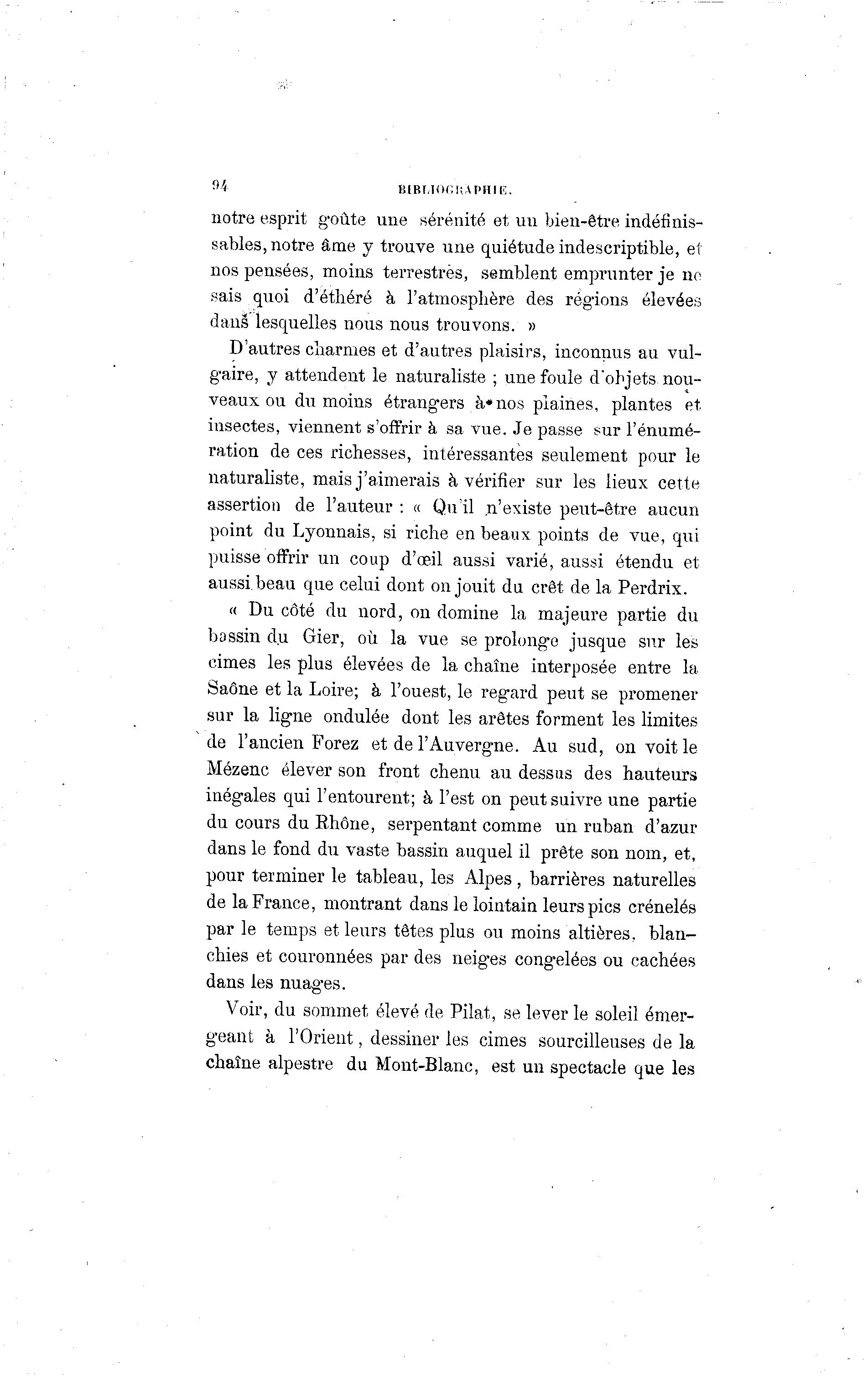 94 BIBUOGKAPHIK. notre esprit goûte une sérénité et un bien-être indéfinis- sables, notre âme y trouve une quiétude indescriptible, et nos pensées, moins terrestres, semblent emprunter je no sais quoi d'éthéré à l'atmosphère des régions élevées dans lesquelles nous nous trouvons. » D'autres charmes et d'autres plaisirs, inconnus au vul- gaire, y attendent le naturaliste ; une foule d'objets nou- veaux ou du moins étrangers à *nos piaines, plantes et insectes, viennent s'offrir à sa vue. Je passe sur l'énumé- ration de ces richesses, intéressantes seulement pour le naturaliste, mais j'aimerais à vérifier sur les lieux cette assertion de l'auteur : « Qu'il n'existe peut-être aucun point du Lyonnais, si riche en beaux points de vue, qui puisse offrir un coup d'oeil aussi varié, aussi étendu et aussi beau que celui dont on jouit du crêt de la Perdrix. « Du côté du nord, on domine la majeure partie du bassin du Gier, où la vue se prolonge jusque sur les cimes les plus élevées de la chaîne interposée entre la Saône et la Loire; à l'ouest, le regard peut se promener sur la ligne ondulée dont les arêtes forment les limites de l'ancien Forez et de l'Auvergne. Au sud, on voit le Mézenc élever son front chenu au dessus des hauteurs inégales qui l'entourent; à l'est on peut suivre une partie du cours du Rhône, serpentant comme un ruban d'azur dans le fond du vaste bassin auquel il prête son nom, et, pour terminer le tableau, les Alpes , barrières naturelles de la France, montrant dans le lointain leurs pics crénelés par le temps et leurs têtes plus ou moins altières, blan- chies et couronnées par des neiges congelées ou cachées dans les nuag-es. Voir, du sommet élevé de Pilât, se lever le soleil émer- geant à l'Orient, dessiner les cimes sourcilleuses de la chaîne alpestre du Mont-Blanc, est un spectacle que les