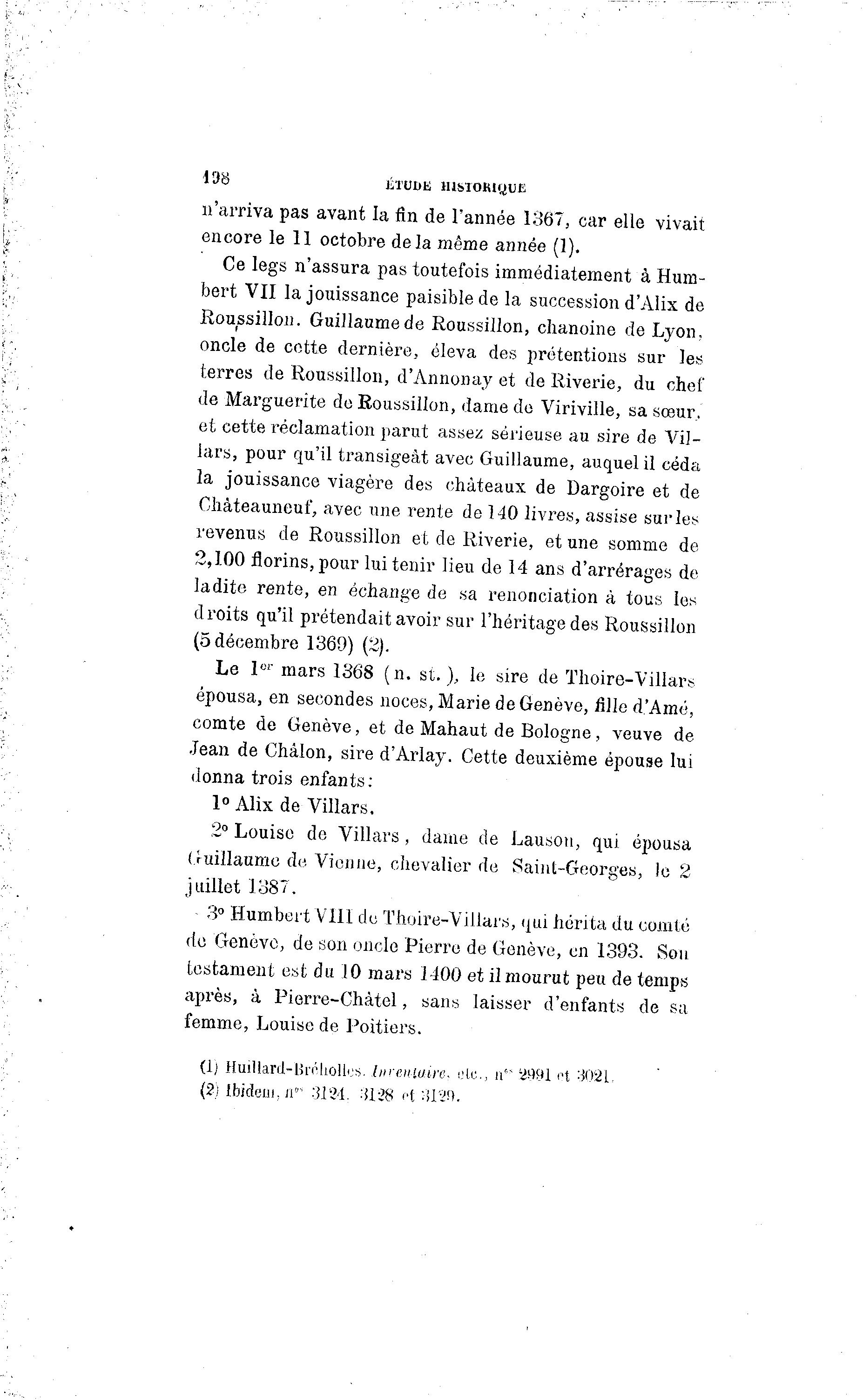 43S ÉTUDE HISTORIQUE n'arriva pas avant la fin de l'année 1367, car elle vivait encore le 11 octobre delà même année (1). Ce legs n'assura pas toutefois immédiatement à Hum- bert VII la jouissance paisible de la succession d'Alix de Roussillon. Guillaume de Roussillon, chanoine cle Lyon, oncle de cette dernière, éleva des prétentions sur les terres de Roussillon, d'Annonay et de Riverie, du chef de Marguerite de Roussillon, dame de Viriville, sa sœur, et cette réclamation parut assez sérieuse au sire de Vil- lars, pour qu'il transigeât avec Guillaume, auquel il céda la jouissance viagère des châteaux de Dargoire et de Chà teauneuf, avec une rente de 140 livres, assise sur les revenus de Roussillon et de Riverie, et une somme de 2,100 florins, pour lui tenir lieu de 14 ans d'arrérages de ladite rente, en échange de sa renonciation à tous les droits qu'il prétendait avoir sur l'héritage des Roussillon (5 décembre 1369) (2). Le 1 er mars 1368 (n. st.), le sire de Thoire-Villars épousa, en secondes noces, Marie de Genève, fille d'Aîné, comte de Genève, et de Mahaut de Bologne, veuve de Jean de Châlon, sire d'Arlay. Cette deuxième épouse lui donna trois enfants: 1° Alix de Villars. 2° Louise de Villars, dame de Lauson, qui épousa Guillaume de Vienne, chevalier de Saint-Georges, le 2 juillet 1387. 3° Humbert VIII du Thoire-Villars, qui hérita du comté de Genève, de son oncle Pierre de Genève, en 1393. Sou testament est du 10 mars 1-100 et il mourut peu de temps après, à Pierre-Chà tel, sans laisser d'enfants de sa femme, Louise de Poitiers. (lj Huillard-Urnhollus. ImeiUuuv. d e , u"~ '8 <•[ WW.