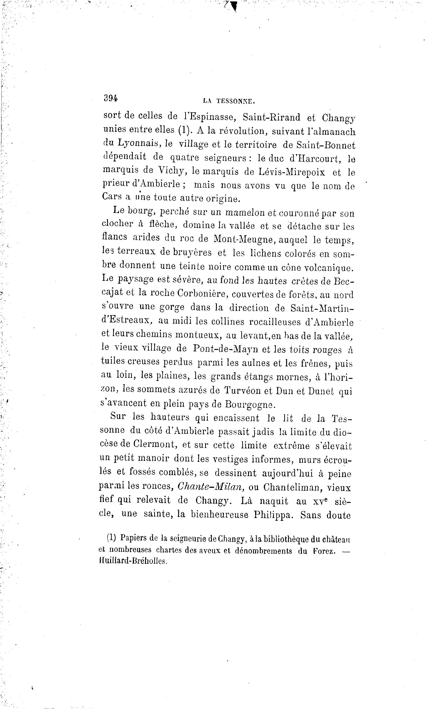 •7J 394 LA TESSONKE, sort de celles de l'Espinasse, Saint-Rirand et Change- unies entre elles (1). A la révolution, suivant l'almanach du Lyonnais, le village et le territoire de Saint-Bonnet dépendait de quatre seigneurs : le duc d'Harcourt, le marquis de Vichy, le marquis de Lévis-Mirepoix et le prieur d'Ambierle ; mais nous avons vu que le nom de Cars a une toute autre origine. Le bourg, perché sur un mamelon et couronné par son clocher à flèche, domine la vallée et se détache sur les flancs arides du roc de Mont-Meugne, auquel le temps, les terreaux de bruyères et les lichens colorés en som- bre donnent une teinte noire comme un cône volcanique. Le paysage est sévère, au fond les hautes crêtes de Bec- cajat et la roche Corbonière, couvertes de forêts, au nord s'ouvre une gorge dans la direction de Saint-Martin- d'EstreauXj au midi les collines rocailleuses d'Ambierle et leurs chemins montueux, au levant,en bas de la vallée, le vieux village de Poni-de-Mayn et les toits rouges à tuiles creuses perdus parmi les aulnes et les frênes, puis au loin, les plaines, les grands étangs mornes, à l'hori- zon, les sommets azurés de ïurvéon et Dun et Dunet qui s'avancent en plein pays de Bourgogne. Sur les hauteurs qui encaissent le lit de la Tes- sonne du côté d'Ambierle passait jadis la limite du dio- cèse de Clermont, et sur cette limite extrême s'élevait un petit manoir dont les vestiges informes, murs écrou- lés et fossés comblés, se dessinent aujourd'hui à peine parmi les ronces, Chante-Milan, ou Chanteliman, vieux fief qui relevait de Changy. Là naquit au xv e siè- cle, une sainte, la bienheureuse Philippa. Sans doute (1) Papiers de la seigneurie de Changy, à la bibliothèque du château et nombreuses chartes des aveux et dénombrements du Forez. — Huiliard-Bréholles.