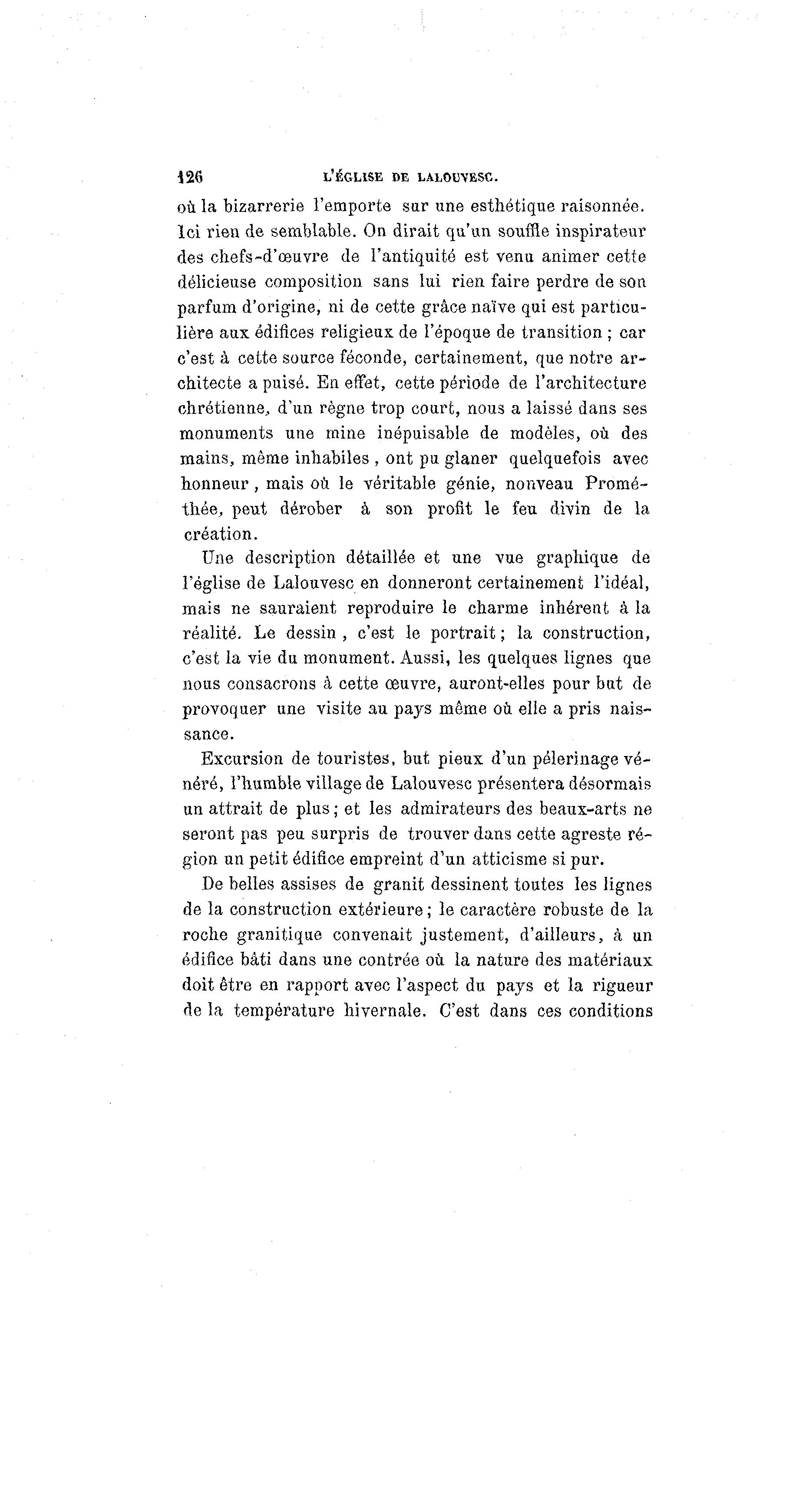 126 L'ÉGLISE DE LALOUVESC. où la bizarrerie l'emporte sur une esthétique raisonnée. Ici rien de semblable. On dirait qu'un souffle inspirateur des chefs-d'œuvre de l'antiquité est venu animer cette délicieuse composition sans lui rien faire perdre de son parfum d'origine, ni de cette grâce naïve qui est particu- lière aux édifices religieux de l'époque de transition ; car c'est à cette source féconde, certainement, que notre ar- chitecte a puisé. En effet, cette période de l'architecture chrétienne, d'un règne trop court, nous a laissé dans ses monuments une mine inépuisable de modèles, où des mains, même inhabiles , ont pu glaner quelquefois avec honneur, mais où le véritable génie, nonveau Promé- thée, peut dérober à son profit le feu divin de la création. Une description détaillée et une vue graphique de l'église de Lalouvesc en donneront certainement l'idéal, mais ne sauraient reproduire le charme inhérent à la réalité. Le dessin , c'est le portrait ; la construction, c'est la vie du monument. Aussi, les quelques lignes que nous consacrons à cette œuvre, auront-elles pour but de provoquer une visite au pays même où elle a pris nais- sance. Excursion de touristes, but pieux d'un pèlerinage vé- néré, l'humble village de Lalouvesc présentera désormais un attrait de plus ; et les admirateurs des beaux-arts ne seront pas peu surpris de trouver dans cette agreste ré- gion un petit édifice empreint d'un atticisme si pur. De belles assises de granit dessinent toutes les lignes de la construction extérieure ; le caractère robuste de la roche granitique convenait justement, d'ailleurs, à un édifice bâti dans une contrée où la nature des matériaux doit être en rapport avec l'aspect du pays et la rigueur de la température hivernale. C'est dans ces conditions
