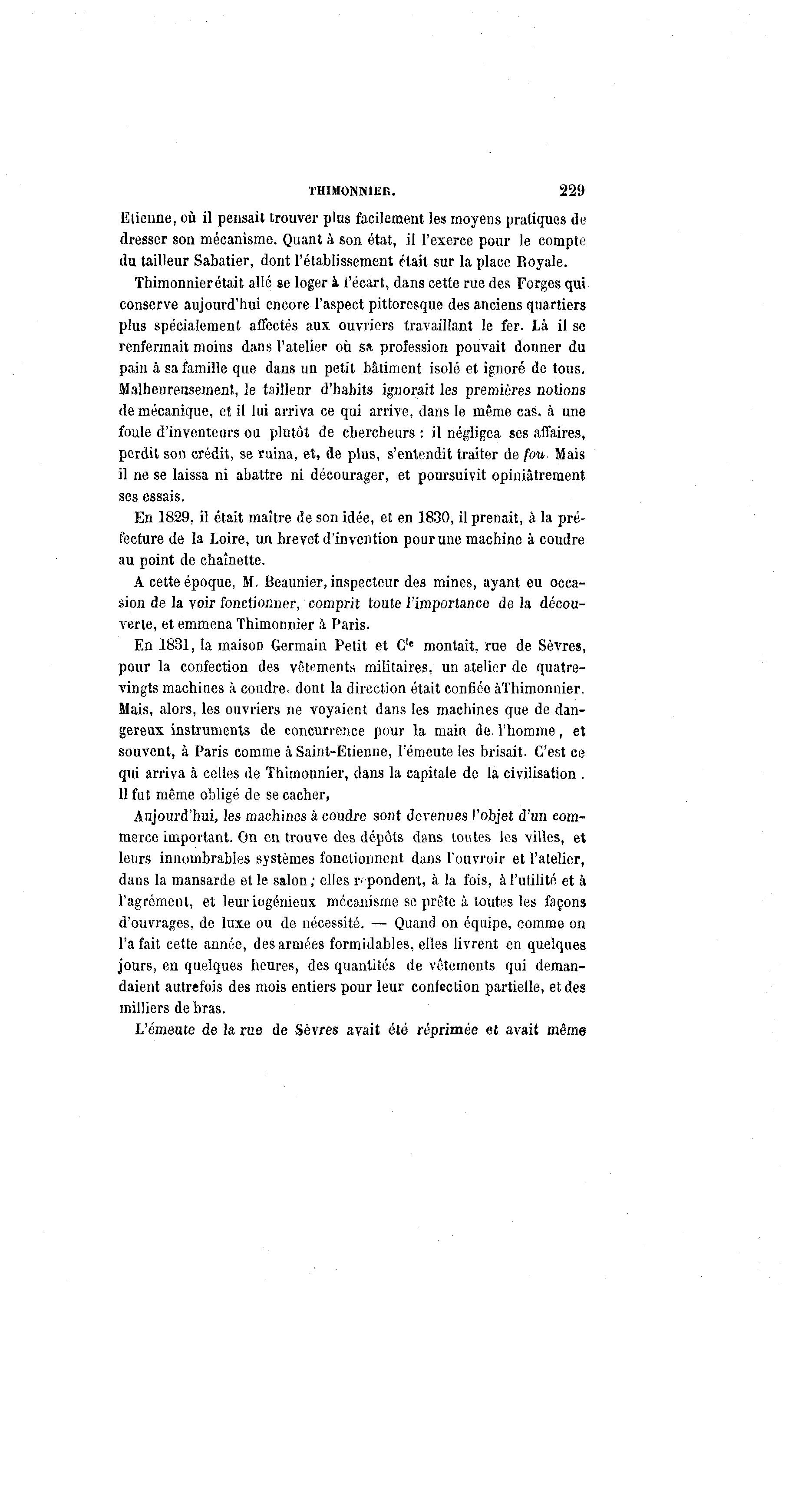 THIMONNIER. 229 Etienne, où il pensait trouver plus facilement les moyens pratiques de dresser son mécanisme. Quant à son état, il l'exerce pour le compte du tailleur Sabatier, dont l'établissement était sur la place Royale. Thimonnierétait allé se loger à l'écart, dans cette rue des Forges qui conserve aujourd'hui encore l'aspect pittoresque des anciens quartiers plus spécialement affectés aux ouvriers travaillant le fer. Là il se renfermait moins dans l'atelier où sa profession pouvait donner du pain à sa famille que dans un petit bâtiment isolé et ignoré de tous. Malheureusement, le tailleur d'habits ignorait les premières notions de mécanique, et il lui arriva ce qui arrive, dans le même cas, à une foule d'inventeurs ou plutôt de chercheurs : il négligea ses affaires, perdit son crédit, se ruina, et, de plus, s'entendit traiter de /bu Mais il ne se laissa ni abattre ni décourager, et poursuivit opiniâtrement ses essais. En 1829, il était maître de son idée, et en 1830, il prenait, à la pré- fecture de la Loire, un brevet d'invention pour une machine à coudre au point de chaînette. A cette époque, M. Beaunier, inspecteur des mines, ayant eu occa- sion de la voir fonctionner, comprit toute l'importance de la décou- verte, et emmena Thimonnier à Paris. En 1831, la maison Germain Petit et O montait, rue de Sèvres, pour la confection des vêtements militaires, un atelier de quatre- vingts machines à coudre, dont la direction était confiée à Thimonnier. Mais, alors, les ouvriers ne voyaient dans les machines que de dan- gereux instruments de concurrence pour la main de l'homme, et souvent, à Paris comme â Saint-Etienne, l'émeute les brisait. C'est ce qui arriva à celles de Thimonnier, dans la capitale de la civilisation . 11 fut même obligé de se cacher, Aujourd'hui, les machines à coudre sont devenues l'objet d'un com- merce important. On en trouve des dépôts dans toutes les villes, et leurs innombrables systèmes fonctionnent dans l'ouvroir et l'atelier, dans la mansarde et le salon ; elles répondent, à la fois, à l'utilité et à l'agrément, et leur ingénieux mécanisme se prête à toutes les façons d'ouvrages, de luxe ou de nécessité. — Quand on équipe, comme on l'a fait cette année, des armées formidables, elles livrent en quelques jours, en quelques heures, des quantités de vêtements qui deman- daient autrefois des mois entiers pour leur confection partielle, et des milliers de bras. L'émeute de la rue de Sèvres avait été réprimée et avait même