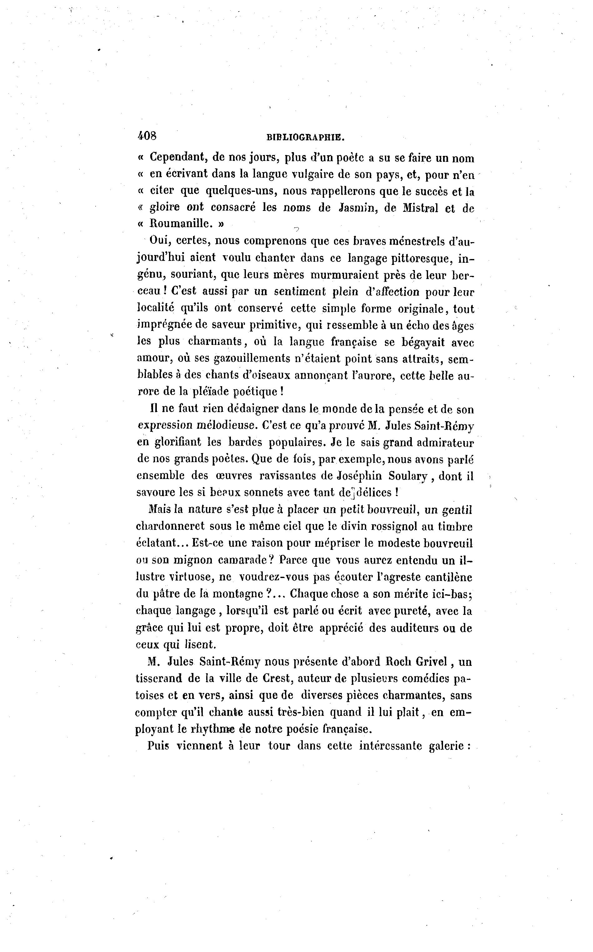 408 BIBLIOGRAPHIE. « Cependant, de nos jours, plus d'un poète a su se faire un nom « en écrivant dans la langue vulgaire de son pays, et, pour n'en « citer que quelques-uns, nous rappellerons que le succès et la « gloire ont consacré les noms de Jasmin, de Mistral et de « Roumanille. » Oui, certes, nous comprenons que ces braves ménestrels d'au- jourd'hui aient voulu chanter dans ce langage pittoresque, in- génu, souriant, que leurs mères murmuraient près de leur ber- ceau ! C'est aussi par un sentiment plein d'affection pour leur localité qu'ils ont conservé cette simple forme originale, tout imprégnée de saveur primitive, qui ressemble à un écho des âges les plus charmants, où la langue française se bégayait avec amour, où ses gazouillements n'étaient point sans attraits, sem- blables à des chants d'oiseaux annonçant l'aurore, cette belle au- rore de la pléiade poétique ! Il ne faut rien dédaigner dans le monde de la pensée et de son expression mélodieuse. C'est ce qu'a prouve M. Jules Saint-Rémy en glorifiant les bardes populaires. Je le sais grand admirateur de nos grands poètes. Que de fois, par exemple, nous avons parlé ensemble des œuvres ravissantes de Joséphin Soulary , dont il savoure les si be?ux sonnets avec tant de*jdélices ! Mais la nature s'est plue à placer un petit bouvreuil, un gentil chardonneret sous le même ciel que le divin rossignol au timbre éclatant... Est-ce une raison pour mépriser le modeste bouvreuil ou son mignon camarade? Parce que vous aurez entendu un il- lustre virtuose, ne voudrez-vous pas écouter l'agreste cantilène du pâtre de la montagne ?... Chaque chose a son mérite ici-bas; chaque langage , lorsqu'il est parlé ou écrit avec pureté, avec la grâce qui lui est propre, doit être apprécié des auditeurs ou de ceux qui lisent. M. Jules Saint-Rémy nous présente d'abord Roch Grivel, un tisserand de la ville de Crest, auteur de plusieurs comédies pa- toises et en vers, ainsi que de diverses pièces charmantes, sans compter qu'il chante aussi très-bien quand il lui plait, en em- ployant le rhythme de notre poésie française. Puis viennent à leur tour dans cette intéressante galerie :