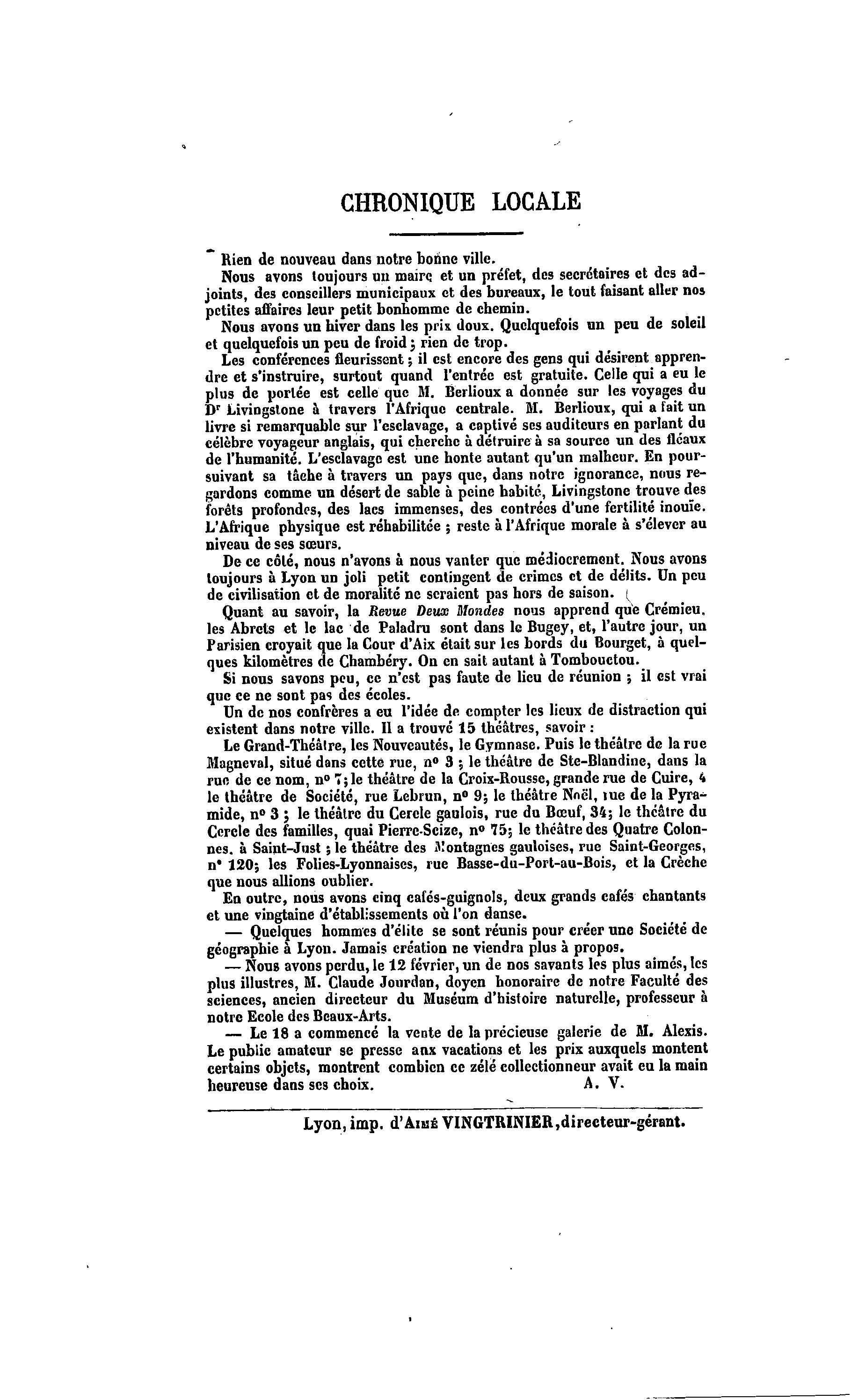 CHRONIQUE LOCALE Rien de nouveau dans notre bonne ville. Nous avons toujours un maire et un préfet, des secrétaires et des ad- joints, des conseillers municipaux et des bureaux, le tout faisant aller nos petites affaires leur petit bonhomme de chemin. Nous avons un hiver dans les prix doux. Quelquefois un peu de soleil et quelquefois un peu de froid; rien de trop. Les conférences fleurissent ; il est encore des gens qui désirent appren- dre et s'instruire, surtout quand l'entrée est gratuite. Celle qui a eu le plus de portée est celle que M. Berlioux a donnée sur les voyages du Dr Livingstone à travers l'Afrique centrale. M. Berlioux, qui a fait un livre si remarquable sur l'esclavage, a captivé ses auditeurs en parlant du célèbre voyageur anglais, qui cherche à détruire à sa source un des fléaux de l'humanité. L'esclavage est une honte autant qu'un malheur. En pour- suivant sa tâehe à travers un pays que, dans notre ignorance, nous re- gardons comme un désert de sable à peine habité, Livingstone trouve des forêts profondes, des lacs immenses, des contrées d'une fertilité inouïe. L'Afrique physique est réhabilitée ; reste à l'Afrique morale à s'élever au niveau de ses sœurs. De ce côté, nous n'avons à nous vanter que médiocrement. Nous avons toujours à Lyon un joli petit contingent de crimes et de délits. Un peu de civilisation et de moralité ne seraient pas hors de saison. Quant au savoir, la Revue Deux Mondes nous apprend que Crémieu, les Abrcts et le lac de Faladru sont dans le Bugey, et, l'autre jour, un Parisien croyait que la Cour d'Aix était sur les bords du Bourget, à quel- ques kilomètres de Chambéry. On en sait autant à Tombouctou. Si nous savons peu, ce n'est pas faute de lieu de réunion ; il est vrai que ce ne sont pas des écoles. Un de nos confrères a eu l'idée de compter les lieux de distraction qui existent dans notre ville. Il a trouvé 15 théâtres, savoir : Le Grand-Théâlre, les Nouveautés, le Gymnase. Puis le théâtre de la rue Magneval, situé dans cette rue, n° 3 ; le théâtre de Ste-Blandine, dans la rue de ce nom, n° 7; le théâtre de la Croix-Rousse, grande rue de Cuire, 4 le théâtre de Société, rue Lebrun, n° 9; le théâtre Noël, lue de la Pyra- mide, n° 3 ; le théâtre du Cercle gaulois, rue du Bœuf, 34; le théâtre du Cercle des familles, quai Pierrc-Scize, n° 75; le théâtre des Quatre Colon- nes, à Saint-Just ; le théâtre des iVontagnes gauloises, rue Saint-Georges, n* 120; les Folies-Lyonnaises, rue Basse-du-Port-au-Bois, et la Crèche que nous allions oublier. En outre, nous avons cinq cafés-guignols, deux grands cafés chantants et une vingtaine d'établissements où l'on danse. — Quelques hommes d'élite se sont réunis pour créer une Société de géographie a Lyon. Jamais création ne viendra plus à propos. — Nous avons perdu, le 12 février, un de nos savants les plus aimés, les plus illustres, M. Claude Jourdan, doyen honoraire de notre Faculté des sciences, ancien directeur du Muséum d'histoire naturelle, professeur à notre Ecole des Beaux-Arts. — Le 18 a commencé la vente de la précieuse galerie de M. Alexis. Le public amateur se presse anx vacations et les prix auxquels montent certains objets, montrent combien ce zélé collectionneur avait eu la main heureuse dans ses choix. A. V. Lyon, imp. d'Ami VINGTRINIER,directeur-gérant.