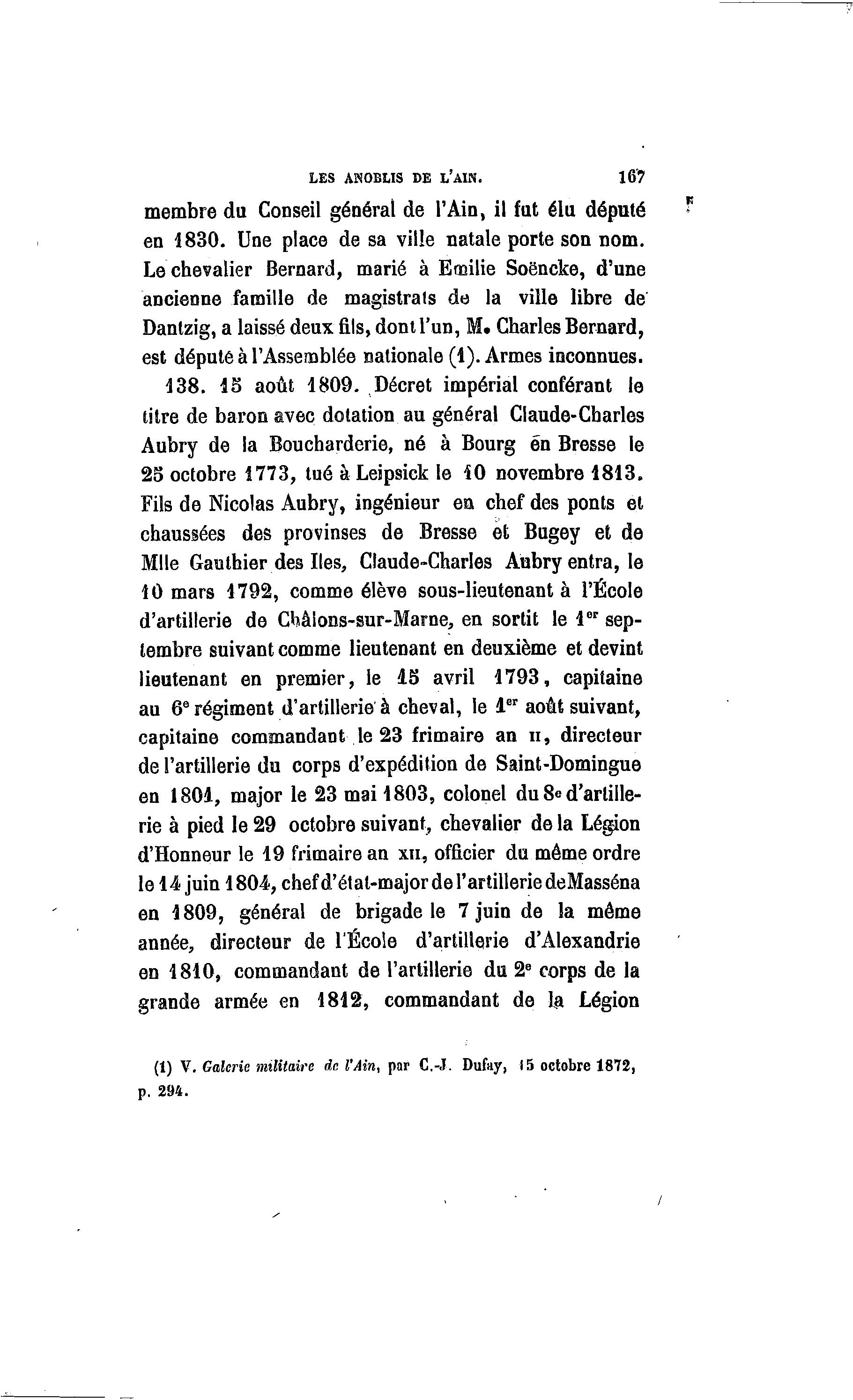 LES ANOBLIS DE L'AIN. 167 membre du Conseil générai de l'Ain, il fut élu député en 1830. Une place de sa ville natale porte son nom. Le chevalier Bernard, marié à Emilie Soëncke, d'une ancienne famille de magistrats de la ville libre de Dantzig, a laissé deux fils, dont l'un, M. Charles Bernard, est député à l'Assemblée nationale (1). Armes inconnues. 138. iS août 1809. Décret impérial conférant le titre de baron avec dotation au général Claude-Charles Aubry de la Boucharderie, né à Bourg en Bresse le 25 octobre 1773, tué à Leipsick le 10 novembre 1813. Fils de Nicolas Aubry, ingénieur ea chef des ponts et chaussées des provinses de Bresse et Bugey et de Mlle Gauthier des Iles, Claude-Charles Aubry entra, le 10 mars 1792, comme élève sous-lieutenant à l'École d'artillerie de Chà lons-sur-Marne, en sortit le 1er sep- tembre suivant comme lieutenant en deuxième et devint lieutenant en premier, le 15 avril 1793, capitaine au 6e régiment d'artillerie à cheval, le 1er août suivant, capitaine commandant le 23 frimaire an n, directeur de l'artillerie du corps d'expédition de Saint-Domingue en 1801, major le 23 mai 1803, colonel du 8« d'artille- rie à pied le 29 octobre suivant, chevalier de la Légion d'Honneur le 19 frimaire an XII, officier du même ordre le 14 juin 1804, chef d'état-major de l'artillerie deMasséna en 1809, général de brigade le 7 juin de la même année, directeur de l'École d'artillerie d'Alexandrie en 1810, commandant de l'artillerie du 2B corps de la grande armée en 1812, commandant de la Légion (1) V. Galerie militaire de l'Ain, par C.-J. Dufay, 15 octobre 1872, p. 294. /