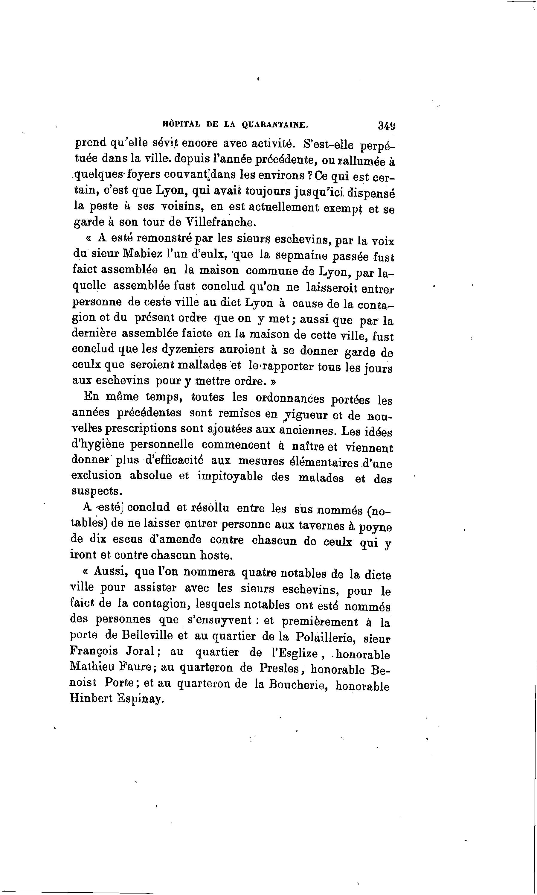 HÔPITAL DE LA QUARANTAINE. 349 prend qu'elle sévit encore avec activité. S'est-elle perpé- tuée dans la ville, depuis l'année précédente, ou rallumée à quelques-foyers couvanta"dans les environs ? Ce qui est cer- tain, c'est que Lyon, qui avait toujours jusqu'ici dispensé la peste à ses voisins, en est actuellement exempt et se garde à son tour de Villefranche. « A esté remonstré par les sieurs eschevins, par la voix du sieur Mabiez l'un d'eulx, que la sepmaine passée fust faict assemblée en la maison commune de Lyon, par la- quelle assemblée fust conclud qu'on ne laisseroit entrer personne de ceste ville au dict Lyon à cause de la conta- gion et du présent ordre que on y met; aussi que par la dernière assemblée faicte en la maison de cette ville, fust conclud que les dyzeniers auroient à se donner garde de ceulx que seroient mallades et le'rapporter tous les jours aux eschevins pour y mettre ordre. » En même temps, toutes les ordonnances portées les années précédentes sont remises en vigueur et de nou- velles prescriptions sont ajoutées aux anciennes. Les idées d'hygiène personnelle commencent à naître et viennent donner plus d'efficacité aux mesures élémentaires d'une exclusion absolue et impitoyable des malades et des suspects. A «stéj conclud et résollu entre les sus nommés (no- tables) de ne laisser entrer personne aux tavernes à poyne de dix escus d'amende contre chascun de ceulx qui y iront et contre chascun hoste. « Aussi, que l'on nommera quatre notables de la dicte ville pour assister avec les sieurs eschevins, pour le faict de la contagion, lesquels notables ont esté nommés des personnes que s'ensuyvent : et premièrement à la porte de Belleville et au quartier de la Polaillerie, sieur François Joral ; au quartier de l'Esglize, • honorable Mathieu Faure ; au quarteron de Presles, honorable Be- noist Porte ; et au quarteron de la Boucherie, honorable Hinbert Espinay.
