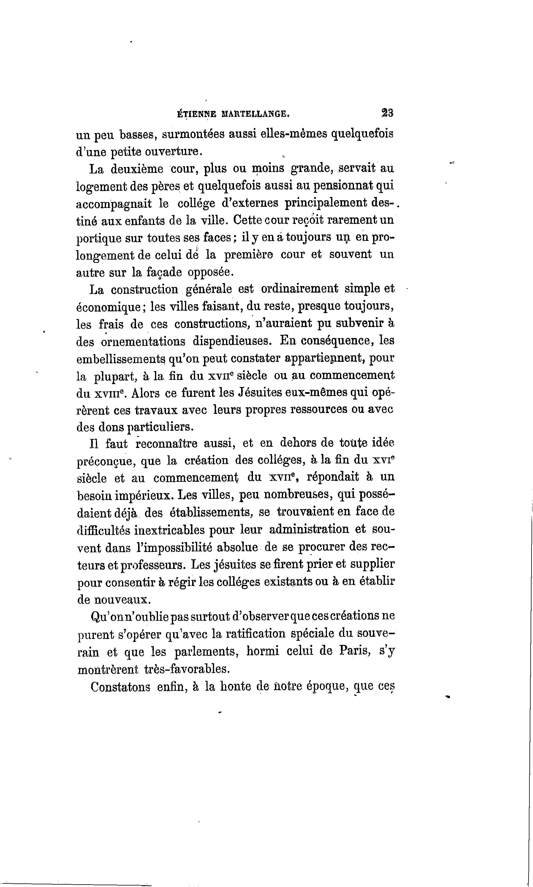 ETIENNE MAUTELLANGE. 13 un peu basses, surmontées aussi elles-mêmes quelquefois d'une petite ouverture. La deuxième cour, plus ou moins grande, servait au logement des pères et quelquefois aussi au pensionnat qui accompagnait le collège d'externes principalement des- tiné aux enfants de la ville. Cette cour reçoit rarement un portique sur toutes ses faces ; il y en â toujours un en pro- longement de celui de la première cour et souvent un autre sur la façade opposée. La construction générale est ordinairement simple et économique; les villes faisant, du reste, presque toujours, les frais de ces constructions, n'auraient pu subvenir à des ornementations dispendieuses. En conséquence, les embellissements, qu'on peut constater appartiennent, pour la plupart, à la fin du xvne siècle ou au commencement du xvme. Alors ce furent les Jésuites eux-mêmes qui opé- rèrent ces travaux avec leurs propres ressources ou avec des dons particuliers. Il faut reconnaître aussi, et en dehors de toute idée préconçue, que la création des collèges, à la fin du xvi" siècle et au commencement, du xvir\ répondait à un besoin impérieux. Les villes, peu nombreuses, qui possé- daient déjà des établissements, se trouvaient en face de difficultés inextricables pour leur administration et sou- vent dans l'impossibilité absolue de se procurer des rec- teurs et professeurs. Les jésuites se firent prier et supplier pour consentir à régir les collèges existants ou à en établir de nouveaux. Qu'onn'oubliepas surtout d'observer que ces créations ne purent s'opérer qu'avec la ratification spéciale du souve- rain et que les parlements, hormi celui de Paris, s'y montrèrent très-favorables. Constatons enfin, à la honte de notre époque, que ces