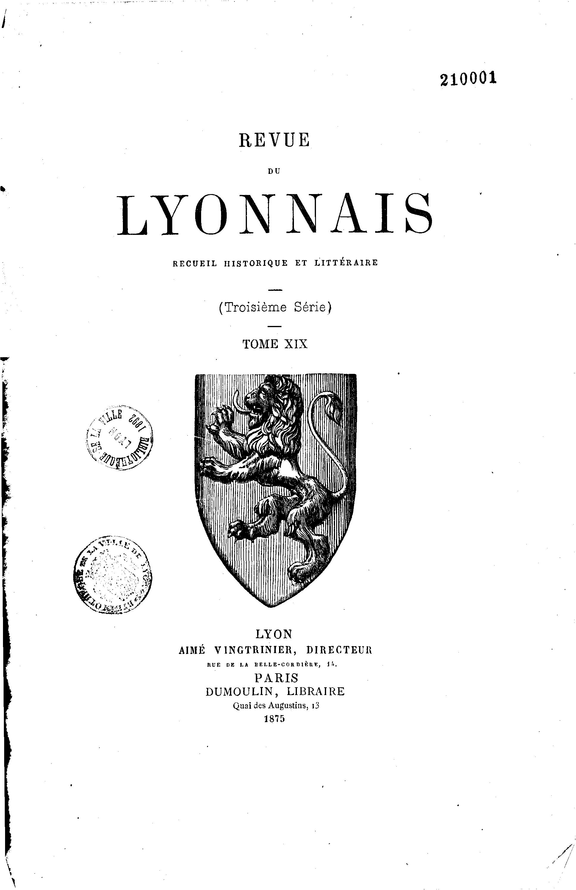 210001 REVUE LYONNAIS RECUEIL HISTORIQUE ET LITTERAIRE (Troisième Série) TOME XIX s-T.'» -'\ LYON AIMÉ VINGTRINIER, DIRECTEUR RUE DE LA BELLE-CORD1ÈUE, 14. PARIS DUMOULIN, LIBRAIRE Quai des Augustins, i3 1875