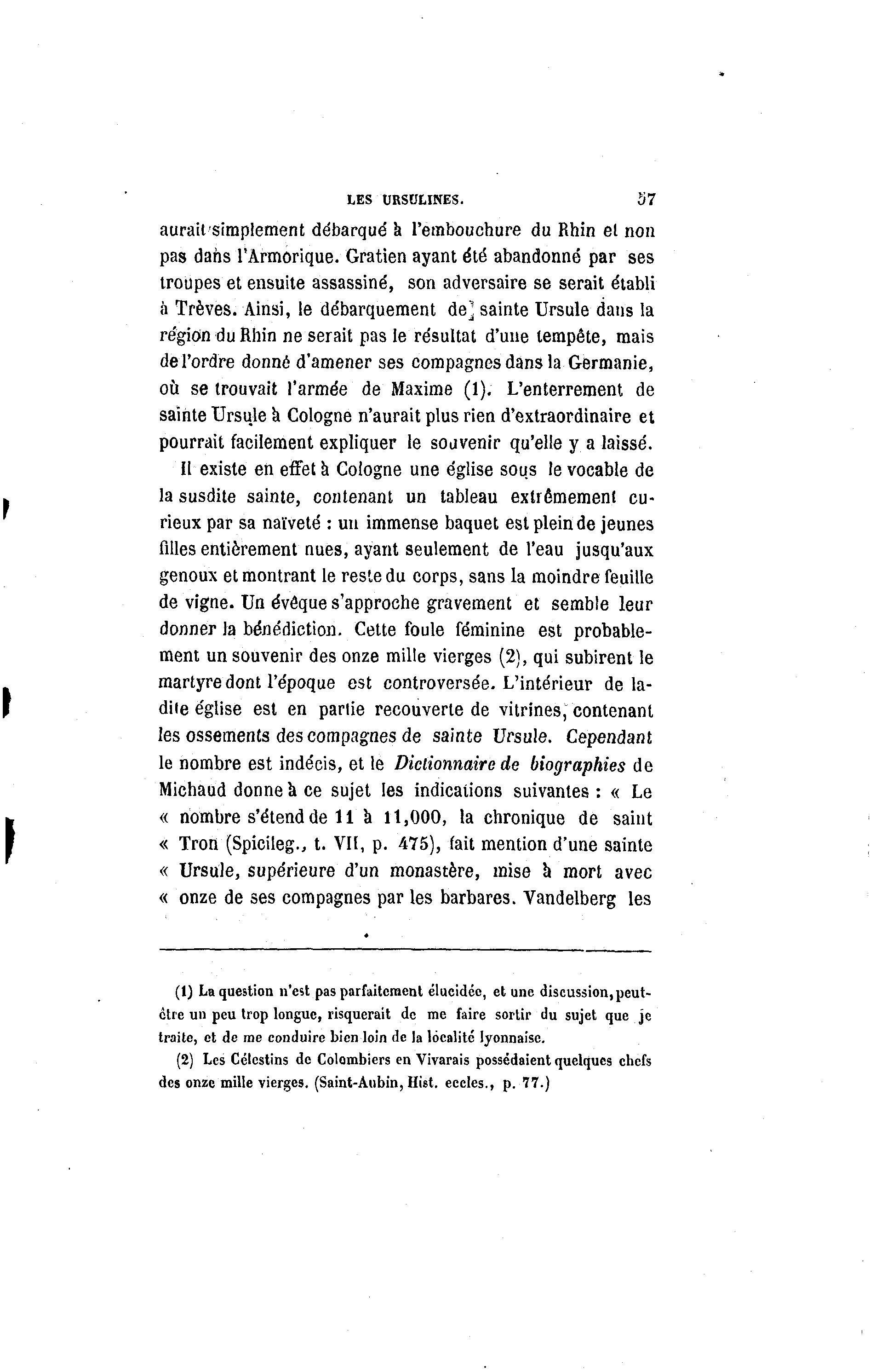 LES URSULINES. 57 aurait simplement débarqué a l'embouchure du Rhin et non pas dans l'Armorique. Gratien ayant été abandonné par ses troupes et ensuite assassiné, son adversaire se serait établi ci Trêves. Ainsi, le débarquement de] sainte Ursule dans la région'du Rhin ne serait pas le résultat d'une tempête, mais de l'ordre donné d'amener ses compagnes dans la Germanie, où se trouvait l'armée de Maxime (1). L'enterrement de sainte Ursule à Cologne n'aurait plus rien d'extraordinaire et pourrait facilement expliquer le souvenir qu'elle y a laissé. Il existe en effet à Cologne une église sous le vocable de la susdite sainte, contenant un tableau extrêmement cu- rieux par sa naïveté : un immense baquet est plein de jeunes filles entièrement nues, ayant seulement de l'eau jusqu'aux genoux et montrant le reste du corps, sans la moindre feuille de vigne. Un évoque s'approche gravement et semble leur donner la bénédiction. Cette foule féminine est probable- ment un souvenir des onze mille vierges (2), qui subirent le martyre dont l'époque est controversée. L'intérieur de la- dite église est en partie recouverte de vitrines, contenant les ossements des compagnes de sainte Ursule. Cependant le nombre est indécis, et le Dictionnaire de biographies de Michaud donne a ce sujet les indications suivantes : « Le « nombre s'étend de 1 i à 11,000, la chronique de saint « Tron (Spicileg., t. Vil, p. 475), fait mention d'une sainte « Ursule, supérieure d'un monastère, mise à mort avec « onze de ses compagnes par les barbares. Vandelberg les (1) La question n'est pas parfaitement élucidée, et une discussion, peut- être un peu trop longue, risquerait de me faire sortir du sujet que je traite, et de me conduire bien loin de la localité lyonnaise. (2) Les Célestins de Colombiers en Vivarais possédaient quelques chefs des onze mille vierges. (Saint-Aubin, Hist. eccles., p. 77.)