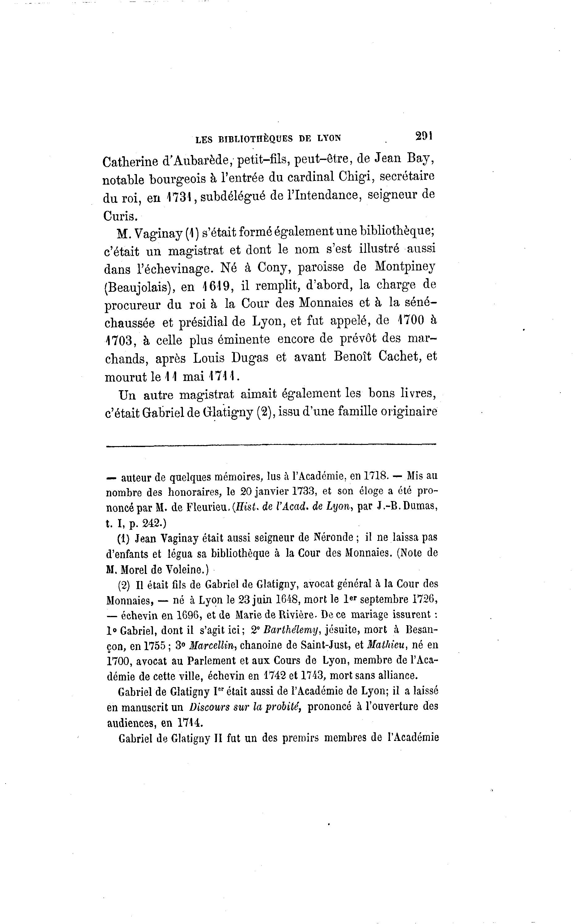 LES BIBLIOTHÈQUES DE LYON 201 Catherine d'Aubarède, petit-fils, peut-être, de Jean Bay, notable bourgeois à l'entrée du cardinal Chigi, secrétaire du roi, en 1731, subdélégué de l'Intendance, seigneur de Curis. M. Vaginay (1 ) s'était formé également une bibliothèque; c'était un magistrat et dont le nom s'est illustré aussi dans l'échevinage. Né à Cony, paroisse de Montpiney (Beaujolais), en 1619, il remplit, d'abord, la charge de procureur du roi à la Cour des Monnaies et à la séné- chaussée et présidial de Lyon, et fut appelé, de 1700 à 1703, à celle plus éminente encore de prévôt des mar- chands, après Louis Dugas et avant Benoît Cachet, et mourut le 11 mai 1711. Un autre magistrat aimait également les bons livres, c'était Gabriel de Glatigny (2), issu d'une famille originaire — auteur de quelques mémoires, lus à l'Académie, en 1718. — Mis au nombre des honoraires, le 20 janvier 1733, et son éloge a été pro- noncé par M. de Fleurieu.(ffisÉ. de l'Acad. de Lyon, par J.-B.Dumas, t. I, p. 242.) (1) Jean Vaginay était aussi seigneur de Néronde ; il ne laissa pas d'enfants et légua sa bibliothèque à la Cour des Monnaies. (Note de M. Morel de Voleine.) (2) Il était fils de Gabriel de Glatigny, avocat général à la Cour des Monnaies, — né à Lyon le 23 juin 1648, mort le 1 " septembre 1726, — échevin en 1696, et de Marie de Rivière. De ce mariage issurent •. 1° Gabriel, dont il s'agit ici ; 2° Barthélémy, jésuite, mort à Besan- çon, en 1755 ; 3° Marcellin, chanoine de Saint-Just, et Mathieu, né en 1700, avocat au Parlement et aux Cours de Lyon, membre de l'Aca- démie de cette ville, échevin en 1742 et 1743, mort sans alliance. Gabriel de Glatigny I" était aussi de l'Académie de Lyon; il a laissé en manuscrit un Discours sur la probité, prononcé à l'ouverture des audiences, en 1714. Gabriel de Glatigny II fut un des premirs membres de l'Académie