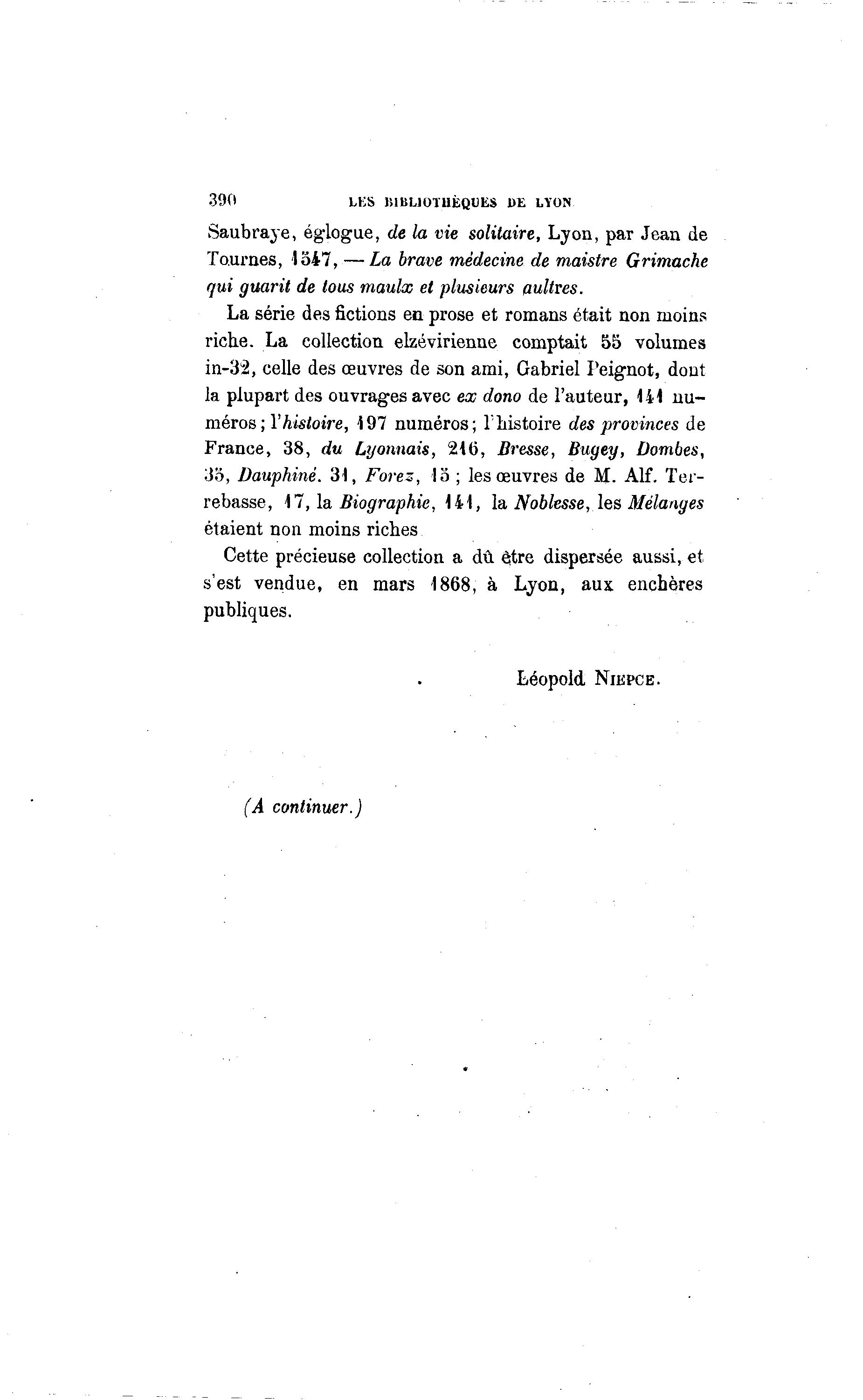 390 LKS BIBLIOTHÈQUES DE LYON Saubraye, églogue, de la vie solitaire, Lyon, par Jean de Tournes, 1547, —La brave médecine de maistre Grimache qui guarit de tous maulx et plusieurs aultres. La série des fictions en prose et romans était non moins riche. La collection elzévirienne comptait 55 volumes in-32, celle des œuvres de son ami, Gabriel Peignot, dont la plupart des ouvrages avec ex dono de l'auteur, 141 nu- méros ; Y histoire, 197 numéros; T histoire des provinces de France, 38, du Lyonnais, 216, Bresse, Bugey, Dombes, 3o, Dauphiné. 31, Forez, 15 ; les œuvres de M. Alf. Ter- rebasse, 17, la Biographie, 141, la Noblesse, les Mélanges étaient non moins riches Cette précieuse collection a dû $tre dispersée aussi, et s'est vendue, en mars 1868, à Lyon, aux enchères publiques. Léopold NIKPCE. (A continuer.)