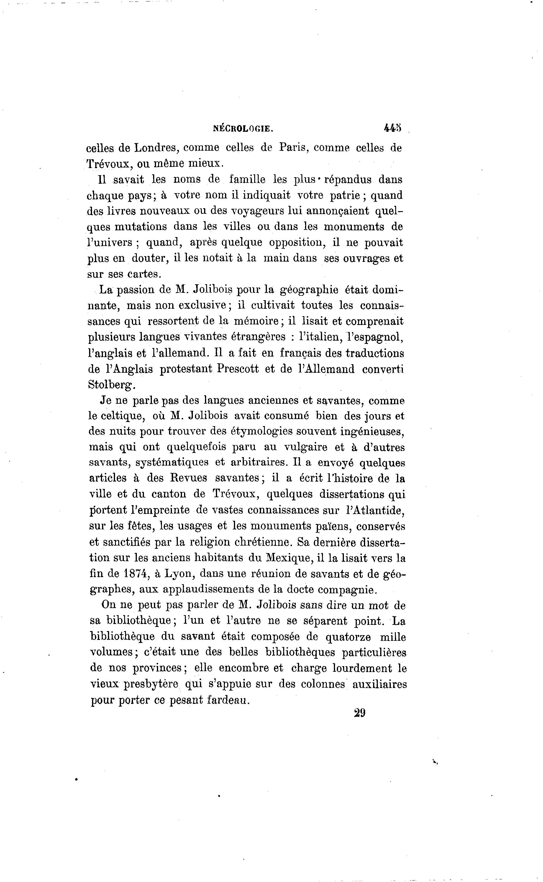 NÉCROLOGIE. 44b celles de Londres, comme celles de Paris, comme celles de Trévoux, ou même mieux. 11 savait les noms de famille les plus • répandus dans chaque pays ; à votre nom il indiquait votre patrie ; quand des livres nouveaux ou des voyageurs lui annonçaient quel- ques mutations dans les villes ou dans les monuments de l'univers ; quand, après quelque opposition, il ne pouvait plus en douter, il les notait à la main dans ses ouvrages et sur ses cartes. La passion de M. Jolibois pour la géographie était domi- nante, mais non exclusive ; il cultivait toutes les connais- sances qui ressortent de la mémoire ; il lisait et comprenait plusieurs langues vivantes étrangères : l'italien, l'espagnol, l'anglais et l'allemand. Il a fait en français des traductions de l'Anglais protestant Prescott et de l'Allemand converti Stolberg. Je ne parle pas des langues anciennes et savantes, comme le celtique, où M. Jolibois avait consumé bien des jours et des nuits pour trouver des étymologies souvent ingénieuses, mais qui ont quelquefois paru au vulgaire et à d'autres savants, systématiques et arbitraires. Il a envoyé quelques articles à des Revues savantes ; il a écrit l'histoire de la ville et du canton de Trévoux, quelques dissertations qui portent l'empreinte de vastes connaissances sur l'Atlantide, sur les fêtes, les usages et les monuments païens, conservés et sanctifiés par la religion chrétienne. Sa dernière disserta- tion sur les anciens habitants du Mexique, il la lisait vers la fin de 1874, à Lyon, dans une réunion de savants et de géo- graphes, aux applaudissements de la docte compagnie. On ne peut pas parler de M. Jolibois sans dire un mot de sa bibliothèque; l'un et l'autre ne se séparent point. La bibliothèque du savant était composée de quatorze mille volumes; c'était une des belles bibliothèques particulières de nos provinces ; elle encombre et charge lourdement le vieux presbytère qui s'appuie sur des colonnes auxiliaires pour porter ce pesant fardeau. 29