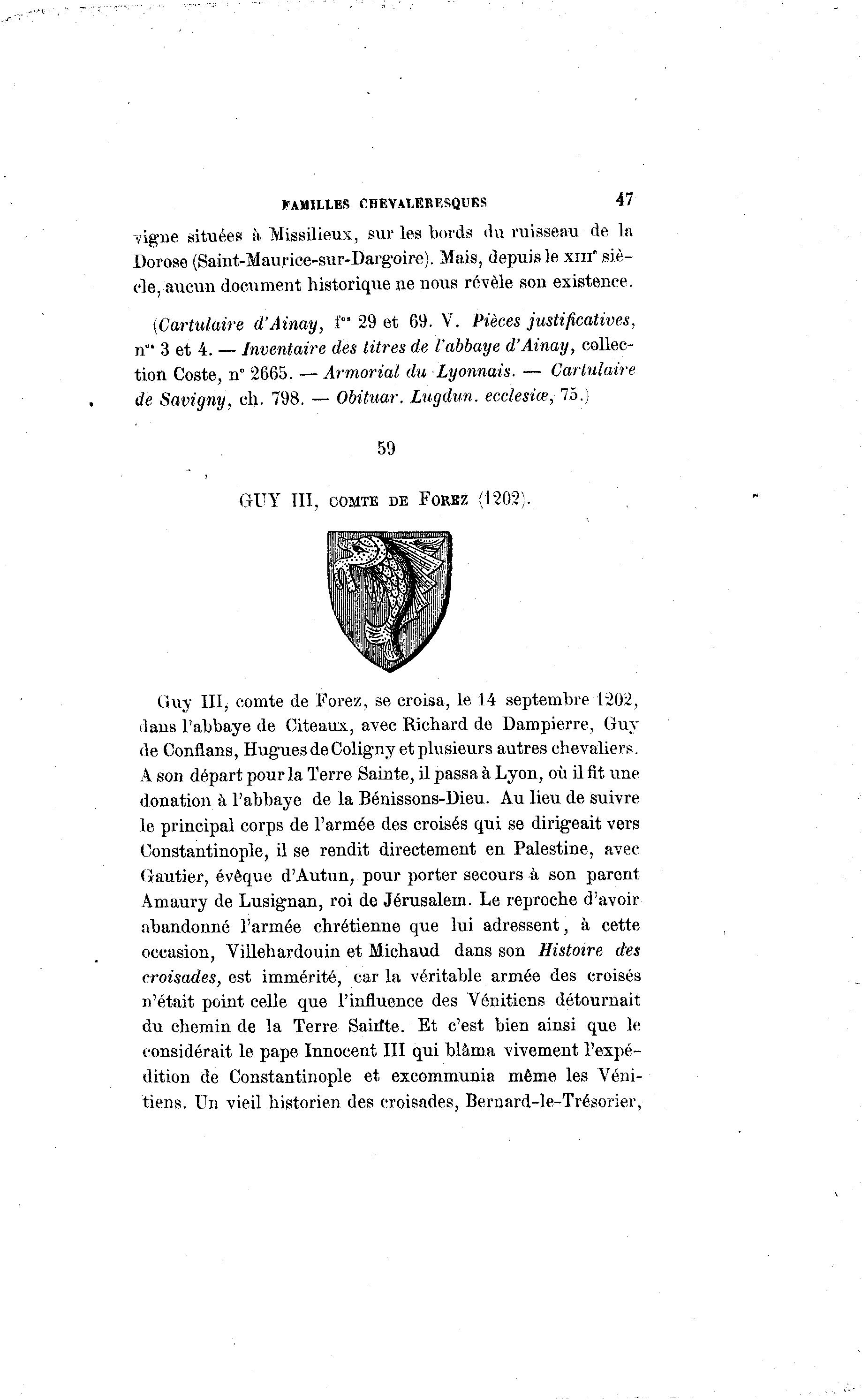 FAHULIBS CHEVALERESQUES 47 vigne situées à Missilieux, sur les bords du ruisseau de la Dorose (Saint-Maurice-sur-Dargoire). Mais, depuis le xni* siè- cle, aucun document historique ne nous révèle son existence. (Cartulaire d'Ainay, f" 29 et 69. V. Pièces justificatives, n" 3 et 4. — Inventaire des titres de l'abbaye d'Ainay, collec- tion Coste, n" 2665. — Armoriai du Lyonnais. — Cartulaire de Savigny, ch. 798. — Obituar. Lugdun. ecclesiœ, 75.) 59 GUY 111. COMTE DE FORBZ (1202). Guy III, comte de Forez, se croisa, le 14 septembre 1202, dans l'abbaye de Citeaux, avec Richard de Dampierre, Guy de Conflans, Hugues de Coligny et plusieurs autres chevaliers. A son départ pour la Terre Sainte, il passa à Lyon, où ilfitune donation à l'abbaye de la Bénissons-Dieu. Au lieu de suivre le principal corps de l'armée des croisés qui se dirigeait vers Oonstantinople, il se rendit directement en Palestine, avec Gautier, évêque d'Autun, pour porter secours à son parent Amaury de Lusignan, roi de Jérusalem. Le reproche d'avoir abandonné l'armée chrétienne que lui adressent, à cette occasion, Villehardouin et Michaud dans son Histoire des croisades, est immérité, car la véritable armée des croisés n'était point celle que l'influence des Vénitiens détournait du chemin de la Terre Saiifte. Et c'est bien ainsi que le considérait le pape Innocent III qui blâma vivement l'expé- dition de Oonstantinople et excommunia même les Véni- tiens. Un vieil historien des croisades, Bernard-le-Trésorier,