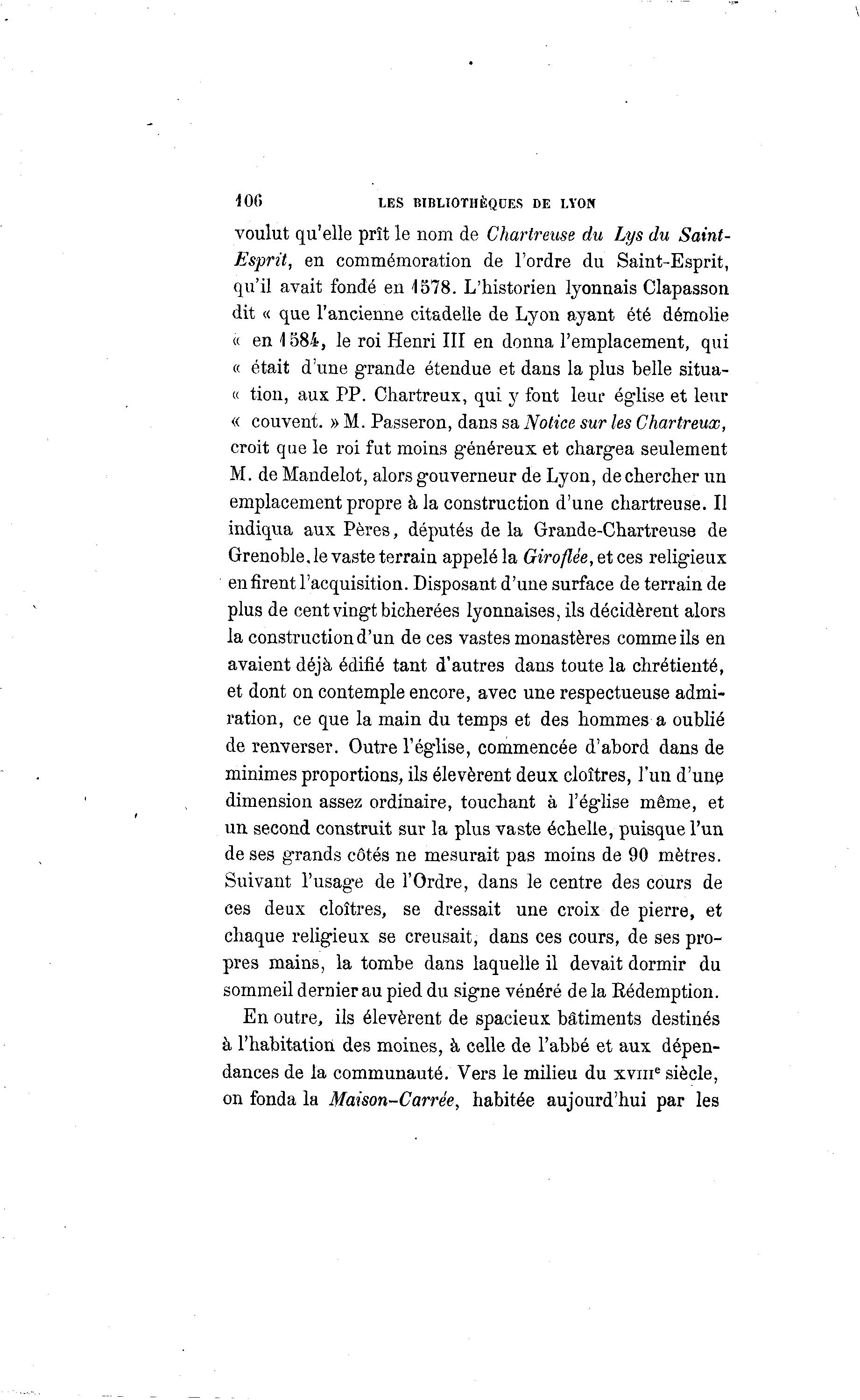 iOC> LES BIBLIOTHÈQUES DE LYON voulut qu'elle prît le nom de Chartreuse du Lys du Saint- Esprit, en commémoration de l'ordre du Saint-Esprit, qu'il avait fondé en 1578. L'historien lyonnais Clapasson dit « que l'ancienne citadelle de Lyon ayant été démolie « en 1584, le roi Henri III en donna l'emplacement, qui « était d'une grande étendue et dans la plus belle situa- « tion, aux PP. Chartreux, qui y font leur église et leur « couvent. » M. Passeron, dans sa Notice sur les Chartreux, croit que le roi fut moins g'énéreux et chargea seulement M. de Mandelot, alors gouverneur de Lyon, de chercher un emplacement propre à la construction d'une chartreuse. Il indiqua aux Pères, députés de la Grande-Chartreuse de Grenoble, le vaste terrain appelé la Giroflée, et ces religieux en firent l'acquisition. Disposant d'une surface de terrain de plus de cent vingt bicherées lyonnaises, ils décidèrent alors la construction d'un de ces vastes monastères comme ils en avaient déjà édifié tant d'autres dans toute la chrétienté, et dont on contemple encore, avec une respectueuse admi- ration, ce que la main du temps et des hommes a oublié de renverser. Outre l'église, commencée d'abord dans de minimes proportions, ils élevèrent deux cloîtres, l'un d'une dimension assez ordinaire, touchant à l'église même, et un second construit sur la plus vaste échelle, puisque l'un de ses grands côtés ne mesurait pas moins de 90 mètres. Suivant l'usage de l'Ordre, dans le centre des cours de ces deux cloîtres, se dressait une croix de pierre, et chaque religieux se creusait, dans ces cours, de ses pro- pres mains, la tombe dans laquelle il devait dormir du sommeil dernier au pied du signe vénéré de la Rédemption. En outre, ils élevèrent de spacieux bâtiments destinés à l'habitation des moines, à celle de l'abbé et aux dépen- dances de la communauté. Vers le milieu du xvme siècle, on fonda la Maison-Carrée, habitée aujourd'hui par les