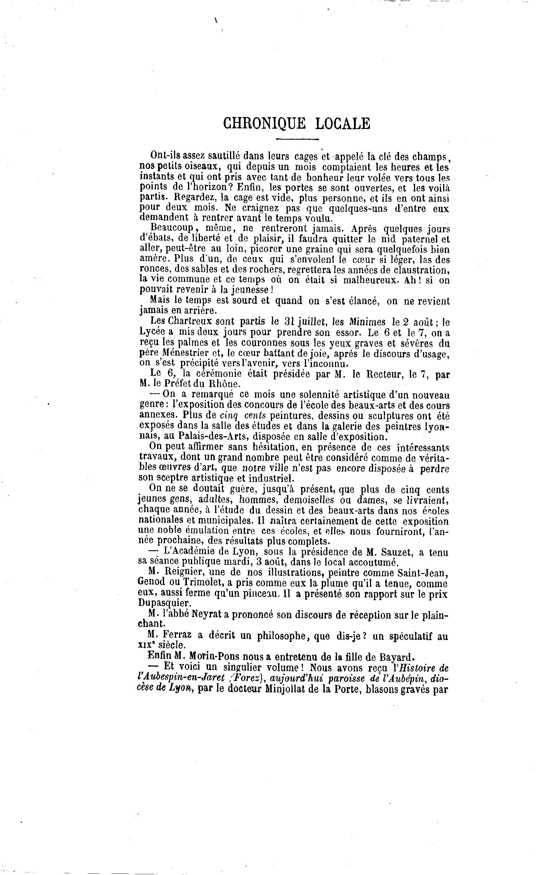 CHRONIQUE LOCALE Ont-ils assez sautillé dans leurs cages et appelé la clé des champs, nos petits oiseaux, qui depuis un mois comptaient les heures et les instants et qui ont pris avec tant de bonheur leur volée vers tous les points de l'horizon? Enfin, les portes se sont ouvertes, et les voilà partis. Regardez, la cage est vide, plus personne, et ils en ont ainsi pour deux mois. Ne craignez pas que quelques-uns d'entre eux demandent à rentrer avant le temps voulu. Beaucoup, même, ne rentreront jamais. Après quelques jours d'ébats, de liberté et de plaisir, il faudra quitter le nid paternel et aller, peut-être au loin, picorer une graine qui sera quelquefois bien amère. Plus d'un, de ceux qui s'envolenl le cœur si léger, las des ronces, des sables et des rochers, regrettera les années de claustration, la vie commune et ce temps où on était si malheureux. Ah ! si on pouvait revenir à la jeunesse ! Mais le temps est sourd et quand on s'est élancé, on ne revient jamais en arrière. Les Chartreux sont partis le 31 juillet, les Minimes le 2 août ; le Lycée a mis deux jours pour prendre son essor. Le 6 et le 7, on a reçu les palmes et les couronnes sous les yeux graves et sévères du père Ménestrier et, le cœur battant de joie, après le discours d'usage, on s'est précipité vers l'avenir, vers l'inconnu. Le 6, la cérémonie était présidée par M. le Recteur, le 7, par M. le Préfet du Rhône. — On a remarqué ce mois une solennité artistique d'un nouveau genre : l'exposition des concours de l'école des beaux-arts et des cours annexes. Plus de cinq cents peintures, dessins ou sculptures ont été exposés dans la salle des études et dans la galerie des peintres lyon- nais, au Palais-des-Arts, disposée en salle d'exposition. On peut affirmer sans hésitation, en présence de ces intéressants travaux, dont un grand nombre peut être considéré comme de vérita- bles œuvres d'art, que notre ville n'est pas encore disposée à perdre son sceptre artistique et industriel. On ne se doutait guère, jusqu'à présent, que plus de cinq cents jeunes gens, adultes, hommes, demoiselles ou dames, se livraient, chaque année, à l'étude du dessin et des beaux-arts dans nos écoles nationales et municipales. Il naîtra certainement de cette exposition une noble émulation entre ces écoles, et elles nous fourniront, l'an- née prochaine, des résultats plus complets. — L'Académie de Lyon, sous la présidence de M. Sauzet, a tenu sa séance publique mardi, 3 août, dans le local accoutumé. M. Reignier, une de nos illustrations, peintre comme Saint-Jean, Genod ou Trimolet, a pris comme eux la plume qu'il a tenue, comme eux, aussi ferme qu'un pinceau. Il a présenté son rapport sur le prix Dupasquier. M. l'abbé Neyrat a prononcé son discours de réception sur le plain- chant. M. Ferraz a décrit un philosophe, que dis-je? un spéculatif au xix" siècle. Enfin M. Morin-Pons nous a entretenu de la fille de Bayard. — Et voici un singulier volume ! Nous avons reçu l'Histoire de l'Aubespin-en-Jaret (Fores), aujourd'hui paroisse de l'Aubépin, dio- cèse de Lyon, par le docteur Minjollat de la Porte, blasons gravés par