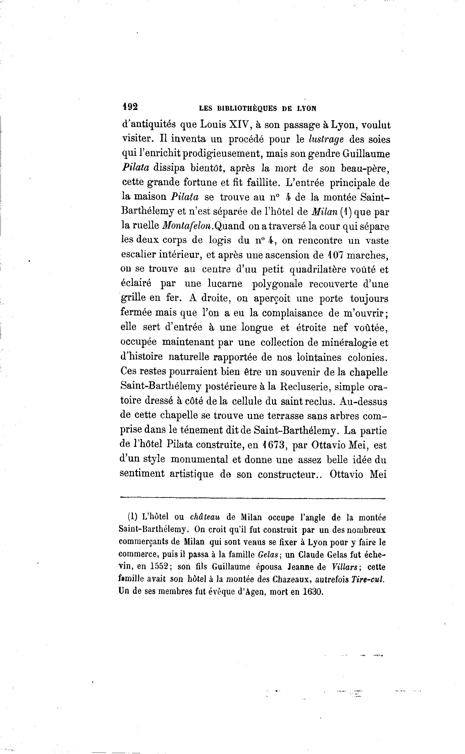 492 LES BIBLIOTHÈQUES DE LYON d'antiquités que Louis XIV, à son passage à Lyon, voulut visiter. Il inventa un procédé pour le lustrage des soies qui l'enrichit prodigieusement, mais son gendre Guillaume Pilata dissipa bientôt, après la mort de son beau-père, cette grande fortune et fit faillite. L'entrée principale de la maison Pilata se trouve au n° 4 de la montée Saint- Barthélémy et n'est séparée de l'hôtel de Milan (1) que par la ruelle Montafelon.Quand on atraversé la cour qui sépare les deux corps de logis du n° 4, on rencontre un vaste escalier intérieur, et après une ascension de 107 marches, on se trouve au centre d'uu petit quadrilatère voûté et éclairé par une lucarne polygonale recouverte d'une grille en fer. A droite, on aperçoit une porte toujours fermée mais que l'on a eu la complaisance de m'ouvrir ; elle sert d'entrée à une longue et étroite nef voûtée, occupée maintenant par une collection de minéralogie et d'histoire naturelle rapportée de nos lointaines colonies. Ces restes pourraient bien être un souvenir de la chapelle Saint-Barthélémy postérieure à la Recluserie, simple ora- toire dressé à côté delà cellule du saint reclus. Au-dessus de cette chapelle se trouve une terrasse sans arbres com- prise dans le ténement dit de Saint-Barthélémy. La partie de l'hôtel Pilata construite, en 1673, par Ottavio Mei, est d'un style monumental et donne une assez belle idée du sentiment artistique de son constructeur.. Ottavio Mei (1) L'hôtel ou château de Milan occupe l'angle de la montée Saint-Barthélémy. On croit qu'il fut construit par un des nombreux commerçants de Milan qui sont venus se fixer à Lyon pour y faire le commerce, puis il passa à la famille Gelas; un Claude Gelas fut éche- vin, en 1552; son fils Guillaume épousa Jeanne de Villars; cette famille avait son hôtel à la montée des Chazeaux, autrefois Tire-cul. Un de ses membres fut évêque d'Agen, mort en 1630.