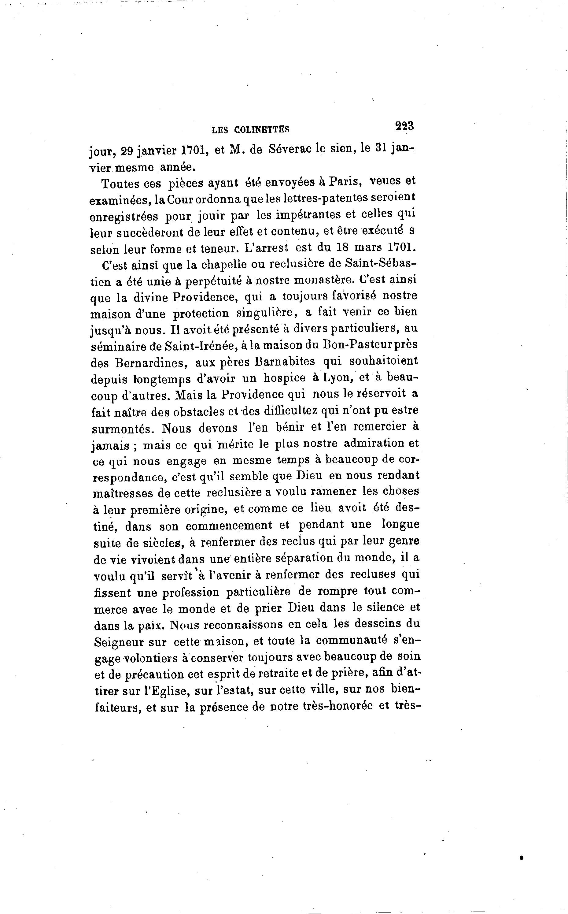 LES COLINETTES 223 jour, 29 janvier 1701, et M. de Séverac le sien, le 31 jan- vier mesme année. Toutes ces pièces ayant été envoyées à Paris, veues et examinées, la Cour ordonna que les lettres-patentes seroient enregistrées pour jouir par les impétrantes et celles qui leur succéderont de leur effet et contenu, et être exécuté s selon leur forme et teneur. L'arrest est du 18 mars 1701. C'est ainsi que la chapelle ou reclusière de Saint-Sébas- tien a été unie à perpétuité à nostre monastère. C'est ainsi que la divine Providence, qui a toujours favorisé nostre maison d'une protection singulière, a fait venir ce bien jusqu'à nous. Il avoit été présenté à divers particuliers, au séminaire de Saint-Irénée, à la maison du Bon-Pasteur près des Bernardines, aux pères Barnabites qui souhaitoient depuis longtemps d'avoir un hospice à Lyon, et à beau- coup d'autres. Mais la Providence qui nous le réservoit a fait naître des obstacles et des difficultez qui n'ont pu estre surmontés. Nous devons l'en bénir et l'en remercier à jamais ; mais ce qui mérite le plus nostre admiration et ce qui nous engage en mesme temps à beaucoup de cor- respondance, c'est qu'il semble que Dieu en nous rendant maîtresses de cette reclusière a voulu ramener les choses à leur première origine, et comme ce lieu avoit été des- tiné, dans son commencement et pendant une longue suite de siècles, à renfermer des reclus qui par leur genre de vie vivoient dans une entière séparation du monde, il a voulu qu'il servît à l'avenir à renfermer des recluses qui fissent une profession particulière de rompre tout com- merce avec le monde et de prier Dieu dans le silence et dans la paix. Nous reconnaissons en cela les desseins du Seigneur sur cette maison, et toute la communauté s'en- gage volontiers à conserver toujours avec beaucoup de soin et de précaution cet esprit de retraite et de prière, afin d'at- tirer sur l'Eglise, sur Testât, sur cette ville, sur nos bien- faiteurs, et sur la présence de notre très-honorée et très-