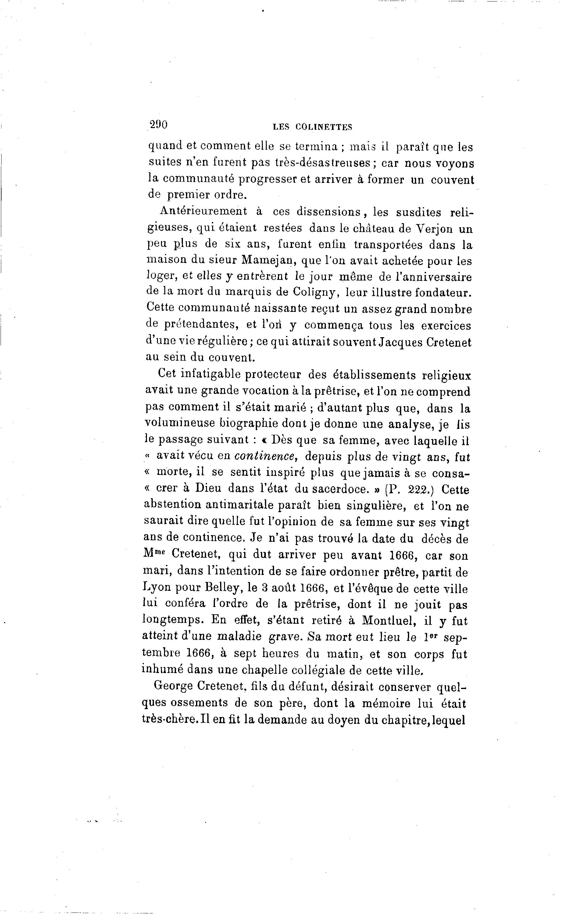 290 LES COLTNETTES quand et comment elle se termina ; mais il paraît que les suites n'en furent pas très-désastreuses; car nous voyons la communauté progresser et arriver à former un couvent de premier ordre. Antérieurement à ces dissensions, les susdites reli- gieuses, qui étaient restées dans le château de Verjon un peu plus de six ans, furent enlin transportées dans la maison du sieur Mamejan, que l'on avait achetée pour les loger, et elles y entrèrent le jour même de l'anniversaire de la mort du marquis de Coligny, leur illustre fondateur. Cette communauté naissante reçut un assez grand nombre de prétendantes, et l'on y commença tous les exercices d'une vie régulière ; ce qui attirait souvent Jacques Cretenet au sein du couvent. Cet infatigable protecteur des établissements religieux avait une grande vocation à la prêtrise, et l'on ne comprend pas comment il s'était marié ; d'autant plus que, dans la volumineuse biographie dont je donne une analyse, je lis le passage suivant : « Dès que sa femme, avec laquelle il « avait vécu en continence, depuis plus de vingt ans, fut « morte, il se sentit inspiré plus que jamais à se consa- « crer à Dieu dans l'état du sacerdoce. » (P. 222.) Cette abstention antimaritale paraît bien singulière, et l'on ne saurait dire quelle fut l'opinion de sa femme sur ses vingt ans de continence. Je n'ai pas trouvé la date du décès de Mme Cretenet, qui dut arriver peu avant 1666, car son mari, dans l'intention de se faire ordonner prêtre, partit de Lyon pour Belley, le 3 août 1666, et l'évêque de cette ville lui conféra l'ordre de la prêtrise, dont il ne jouit pas longtemps. En effet, s'étant retiré à Montluel, il y fut atteint d'une maladie grave. Sa mort eut lieu le 1 er sep- tembre 1666, à sept heures du matin, et son corps fut inhumé dans une chapelle collégiale de cette ville. George Cretenet. fils du défunt, désirait conserver quel- ques ossements de son père, dont la mémoire lui était très-chère. Il en fit la demande au doyen du chapitre, lequel