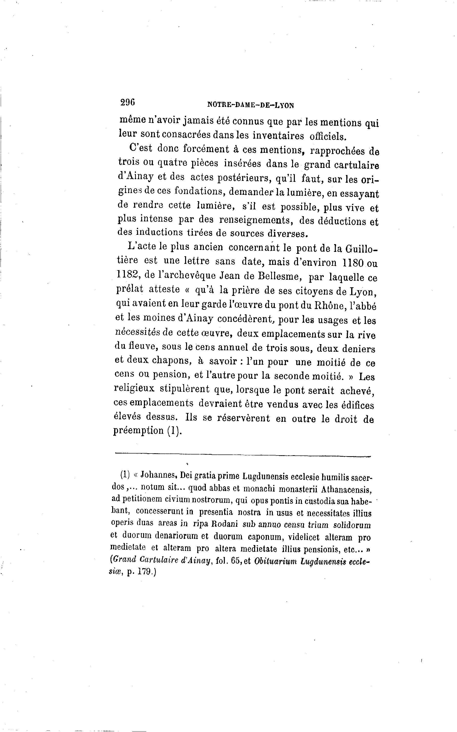 296 NOTRE-DAME-DE-LYON même n'avoir jamais été connus que par les mentions qui leur sont consacrées dans les inventaires officiels. C'est donc forcément à ces mentions, rapprochées de trois ou quatre pièces insérées dans le grand cartulaire d'Ainay et des actes postérieurs, qu'il faut, sur les ori- gines de ces fondations, demander la lumière, en essayant de rendre cette lumière, s'il est possible, plus vive et plus intense par des renseignements, des déductions et des inductions tirées de sources diverses. L'acte le plus ancien concernant le pont de la Guillo- tière est une lettre sans date, mais d'environ 1180 ou 1182, de l'archevêque Jean de Bellesme, par laquelle ce prélat atteste « qu'à la prière de ses citoyens de Lyon, qui avaient en leur garde l'œuvre du pont du Rhône, l'abbé et les moines d'Ainay concédèrent, pour les usages et les nécessités de cette œuvre, deux emplacements sur la rive du fleuve, sous le cens annuel de trois sous, deux deniers et deux chapons, à savoir : l'un pour une moitié de ce cens ou pension, et l'autre pour la seconde moitié. » Les religieux stipulèrent que, lorsque le pont serait achevé, ces emplacements devraient être vendus avec les édifices élevés dessus. Ils se réservèrent en outre le droit de préemption (1). (1) « Johannes, Dei gratia prime Lugdunensis ecclesie humilis sacer- dos,... notum sit... quod abbas et monachi monasterii Athanacensis, adpetitionem civiumnostrorum, qui opuspontisincustodiasuahabe- bant, concesserunt in presentia nostra in usus et nécessitâtes illius operis duas areas in ripa Rodani sub anrnio censu trium solidorum et duorum denariorum et duorum caponum, videlicet alteram pro medietate et alteram pro altéra medietate illius pensionis, etc.. » (Grand Cartulaire d'Ainay, fol. 65,et Qbituariwn Lugdunensi$ eccle- siœ, p. 179.)