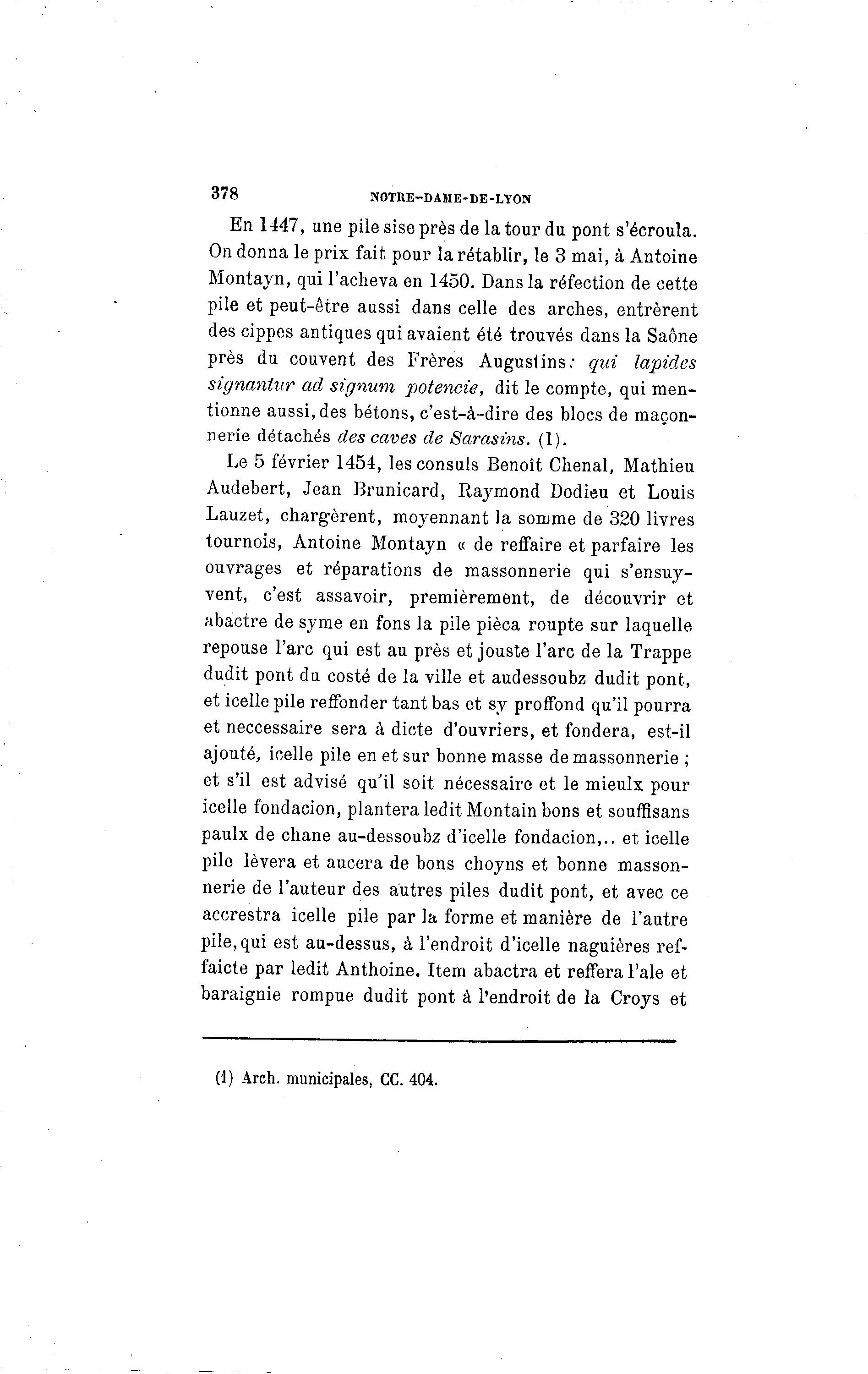 378 NOTRE-DAME-DE-LYON En 1447, une pile sise près de la tour du pont s'écroula. On donna le prix fait pour la rétablir, le 3 mai, à Antoine Montavn, qui l'acheva en 1450. Dans la réfection de cette pile et peut-être aussi dans celle des arches, entrèrent des cippcs antiques qui avaient été trouvés dans la Saône près du couvent des Frères Auguslins. - qui lapides signantur ad signum potencie, dit le compte, qui men- tionne aussi, des bétons, c'est-à -dire des blocs de maçon- nerie détachés des caves de Sarasins. (1). Le 5 février 1454, les consuls Benoît Chenal, Mathieu Audebert, Jean Brunicard, Raymond Dodieu et Louis Lauzet, chargèrent, moyennant la somme de 320 livres tournois, Antoine Montayn « de reffaire et parfaire les ouvrages et réparations de massonnerie qui s'ensuy- vent, c'est assavoir, premièrement, de découvrir et abactre de syme en fons la pile pièca roupte sur laquelle repouse l'arc qui est au près et jouste l'arc de la Trappe dudit pont du costé de la ville et audessoubz dudit pont, et icelle pile reffonder tant bas et sy proffond qu'il pourra et neccessaire sera à dicte d'ouvriers, et fondera, est-il ajouté, icelle pile en et sur bonne masse de massonnerie ; et s'il est advisé qu'il soit nécessaire et le mieulx pour icelle fondacion, plantera ledit Montain bons et souffisans paulx de chane au-dessoubz d'icelle fondacion,.. et icelle pile lèvera et aucera de bons choyns et bonne masson- nerie de l'auteur des autres piles dudit pont, et avec ce accrestra icelle pile par la forme et manière de l'autre pile, qui est au-dessus, à l'endroit d'icelle naguières ref- faicte par ledit Anthoine. Item abactra et reffera l'aie et baraignie rompue dudit pont à l'endroit de la Croys et (1) Arch. municipales, CC. 404.