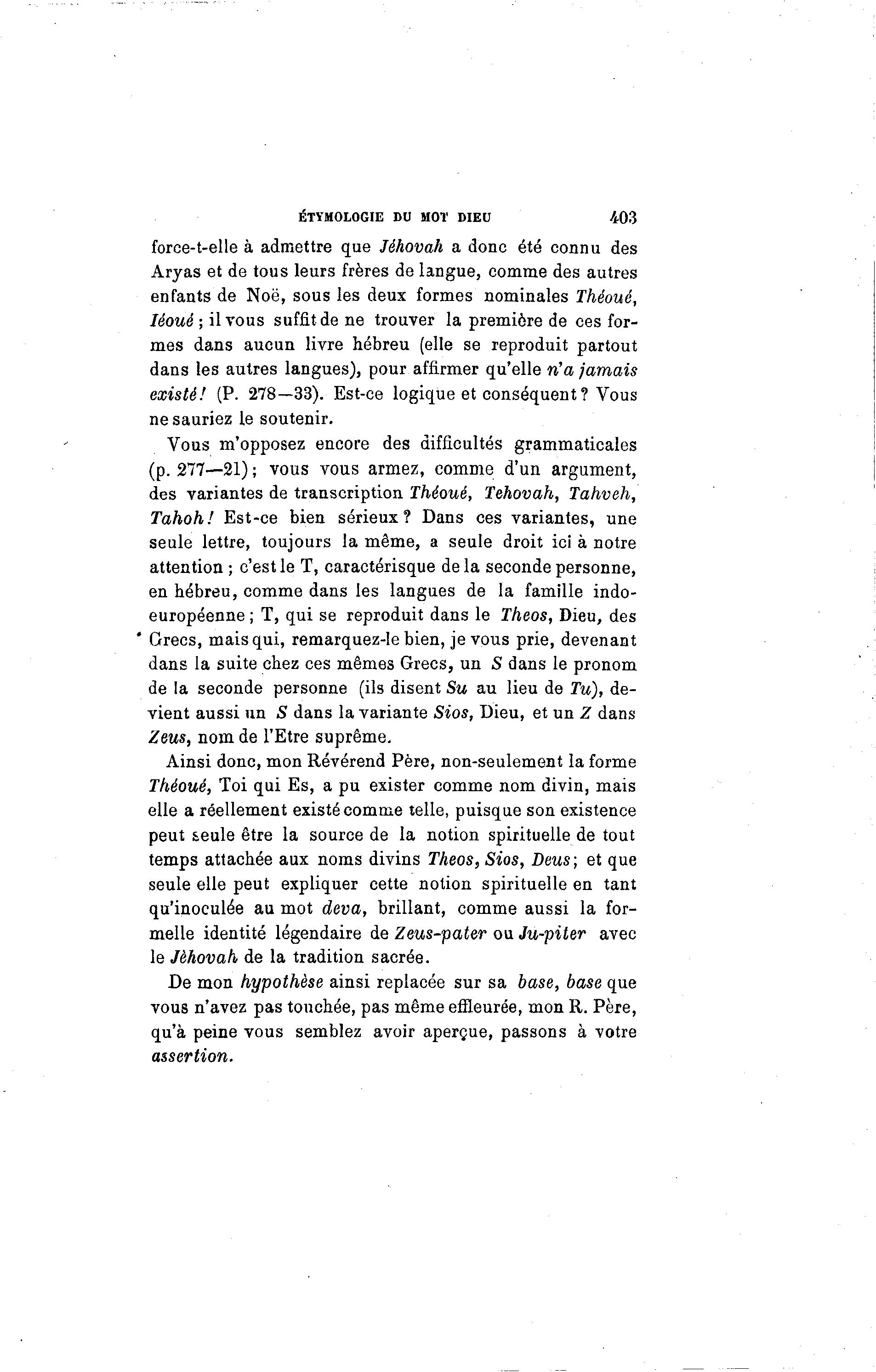 ÉTYMOLOGIE DU MOT DIEU 403 force-t-elle à admettre que Jéhovah a donc été connu des Aryas et de tous leurs frères de langue, comme des autres enfants de Noë, sous les deux formes nominales Théoué, Iéoué ; il vous suffit de ne trouver la première de ces for- mes dans aucun livre hébreu (elle se reproduit partout dans les autres langues), pour affirmer qu'elle n'a jamais existé! (P. 278—33). Est-ce logique et conséquent? Vous ne sauriez le soutenir. Vous m'opposez encore des difficultés grammaticales (p. 277—21) ; vous vous armez, comme d'un argument, des variantes de transcription Théoué, Tehovah, Tahveh, Tahoh! Est-ce bien sérieux? Dans ces variantes, une seule lettre, toujours la même, a seule droit ici à notre attention ; c'est le T, caractérisque delà seconde personne, en hébreu, comme dans les langues de la famille indo- européenne ; T, qui se reproduit dans le Theos, Dieu, des ' Grecs, mais qui, remarquez-le bien, je vous prie, devenant dans la suite chez ces mêmes Grecs, un S dans le pronom de la seconde personne (ils disent Su au lieu de Tu), de- vient aussi un S dans la variante Sios, Dieu, et un Z dans Zeus, nom de l'Etre suprême. Ainsi donc, mon Révérend Père, non-seulement la forme Théoué, Toi qui Es, a pu exister comme nom divin, mais elle a réellement existé comme telle, puisque son existence peut seule être la source de la notion spirituelle de tout temps attachée aux noms divins Theos, Sios, Deus; et que seule elle peut expliquer cette notion spirituelle en tant qu'inoculée au mot deva, brillant, comme aussi la for- melle identité légendaire de Zeus-pater ou Ju-piter avec le Jéhovah de la tradition sacrée. De mon hypothèse ainsi replacée sur sa base, base que vous n'avez pas touchée, pas même effleurée, mon R. Père, qu'à peine vous semblez avoir aperçue, passons à votre assertion.