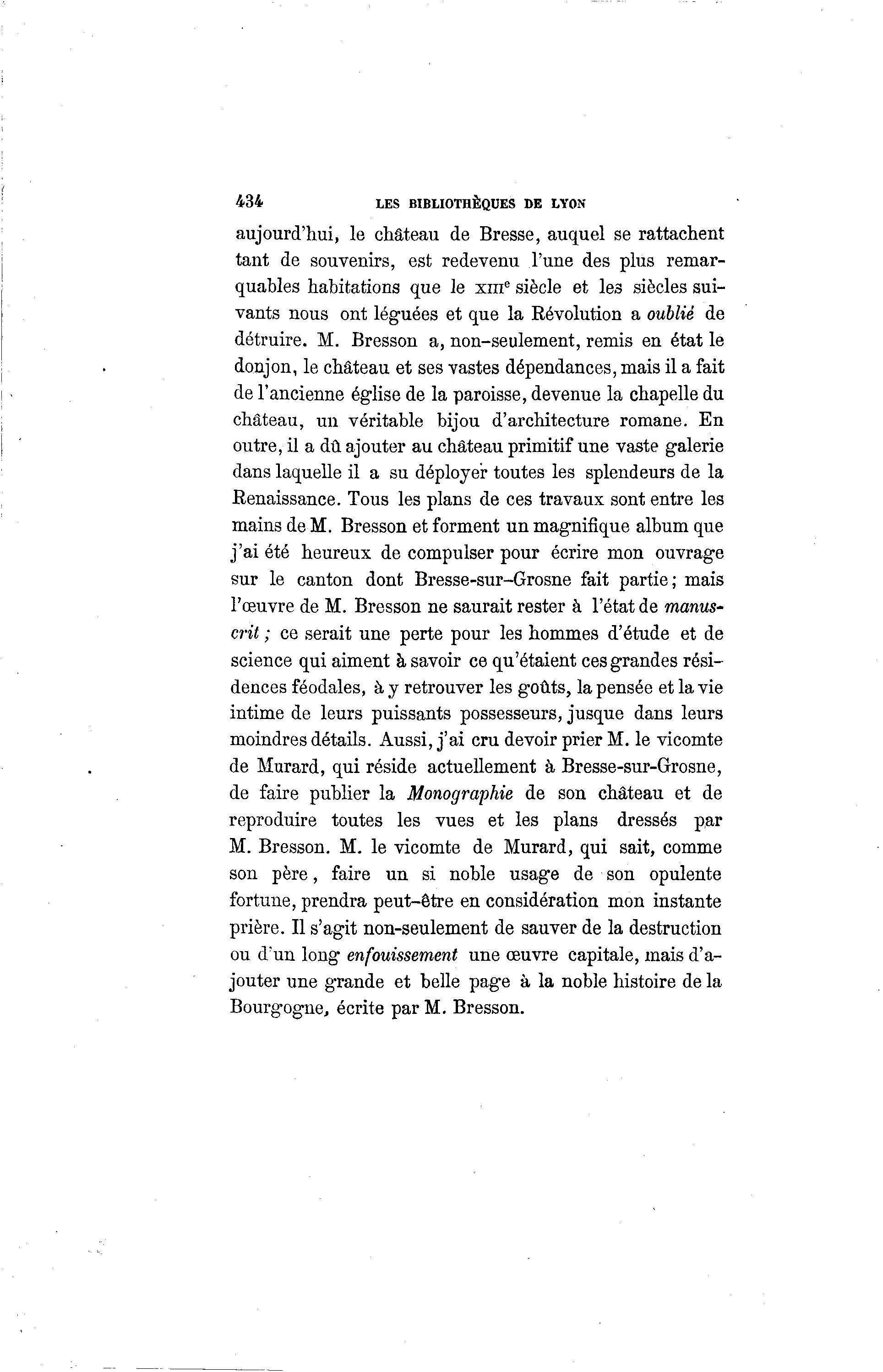 434 LES BIBLIOTHÈQUES DE LYON aujourd'hui, le château de Bresse, auquel se rattachent tant de souvenirs, est redevenu l'une des plus remar- quables habitations que le xm e siècle et les siècles sui- vants nous ont léguées et que la Révolution a oublié de détruire. M. Bresson a, non-seulement, remis en état le donjon, le château et ses vastes dépendances, mais il a fait de l'ancienne église de la paroisse, devenue la chapelle du château, un véritable bijou d'architecture romane. En outre, il a dû ajouter au château primitif une vaste galerie dans laquelle il a su déployer toutes les splendeurs de la Renaissance. Tous les plans de ces travaux sont entre les mains de M. Bresson et forment un magnifique album que j'ai été heureux de compulser pour écrire mon ouvrage sur le canton dont Bresse-sur-Grosne fait partie; mais l'œuvre de M. Bresson ne saurait rester à l'état de manus- crit ; ce serait une perte pour les hommes d'étude et de science qui aiment à savoir ce qu'étaient ces grandes rési- dences féodales, à y retrouver les goûts, la pensée et la vie intime de leurs puissants possesseurs, jusque dans leurs moindres détails. Aussi, j'ai cru devoir prier M. le vicomte de Murard, qui réside actuellement à Bresse-sur-Grosne, de faire publier la Monographie de son château et de reproduire toutes les vues et les plans dressés par M. Bresson. M. le vicomte de Murard, qui sait, comme son père, faire un si noble usage de son opulente fortune, prendra peut-être en considération mon instante prière. Il s'agit non-seulement de sauver de la destruction ou d'un long enfouissement une œuvre capitale, mais d'a- jouter une gTande et belle page à la noble histoire de la Bourgogne, écrite par M. Bresson.