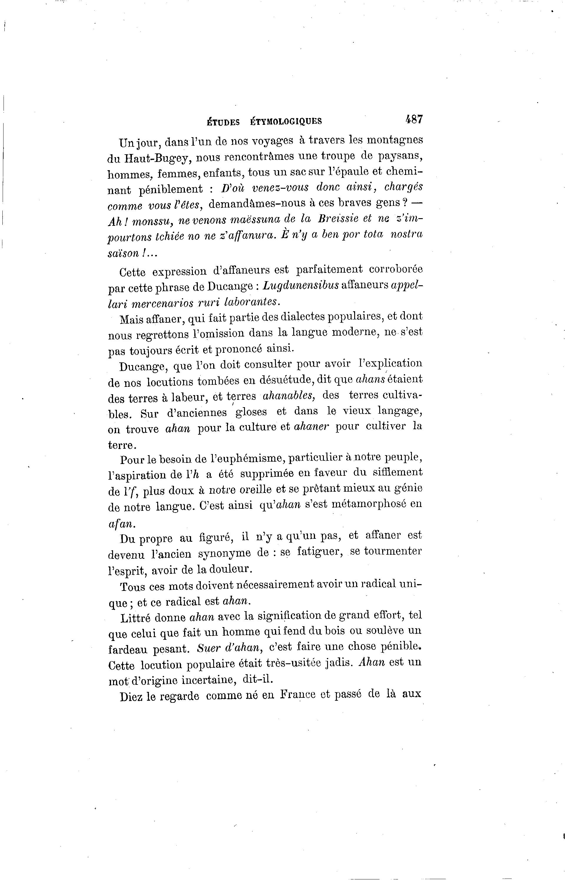 ÉTUDES ÉTYMOLOGIQUES 487 Un jour, dans l'un de nos voyages à travers les montagnes du Haut-Bug-ey, nous rencontrâmes une troupe de paysans, hommes, femmes, enfants, tous un sac sur l'épaule et chemi- nant péniblement : D'où venez-vous donc ainsi, chargés comme vous l'êtes, demandâmes-nous à ces braves gens ? — Ah ! monssu, ne venons maëssuna de la Breissie et ne z'im- pourtons tchiée no ne z'affanura. E n'y a ben por tota nostra saison!... Cette expression d'affaneurs est parfaitement corroborée par cette phrase de Ducange : Lugdunensibus affaneurs appel- lari mercenarios ruri laborantes. Mais affaner, qui fait partie des dialectes populaires, et dont nous regrettons l'omission dans la langue moderne, ne s'est pas toujours écrit et prononcé ainsi. Ducange, que l'on doit consulter pour avoir l'explication de nos locutions tombées en désuétude, dit que ahans étaient des terres à labeur, et terres ahanables, des terres cultiva- bles. Sur d'anciennes gloses et dans le vieux langage, on trouve ahan pour la culture et ahaner pour cultiver la terre. Pour le besoin de l'euphémisme, particulier à notre peuple, l'aspiration de Y h a été supprimée en faveur du sifflement de Vf, plus doux à notre oreille et se prêtant mieux au génie de notre langue. C'est ainsi qu.'ahan s'est métamorphosé en a fan. Du propre au figuré, il n'y a qu'un pas, et affaner est devenu l'ancien synonyme de : se fatiguer, se tourmenter l'esprit, avoir de la douleur. Tous ces mots doivent nécessairement avoir un radical uni- que ; et ce radical est ahan. Littré donne ahan avec la signification de grand effort, tel que celui que fait un homme qui fend du bois ou soulève un fardeau pesant. Suer d'ahan, c'est faire une chose pénible» Cette locution populaire était très-usitée jadis. Ahan est un mot d'origine incertaine, dit-il. Diez le regarde comme né en France et passé de là aux