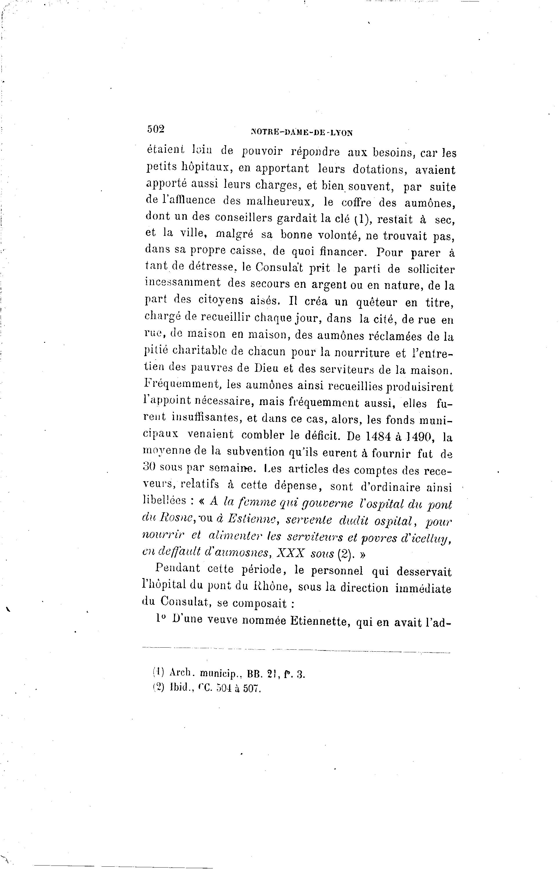 502 HOTRE-DA'ME-DE -LYON étaient loin de pouvoir répondre aux besoins, car les petits hôpitaux, en apportant leurs dotations, avaient apporté aussi leurs charges, et bien souvent, par suite de l'afïluence des malheureux, le coffre des aumônes, dont un des conseillers gardait la clé (1), restait à sec, et la ville, malgré sa bonne volonté, ne trouvait pas, dans sa propre caisse, de quoi financer. Pour parer à tant de détresse, le Consulat prit le parti de solliciter incessamment des secours en argent ou en nature, de la part des citoyens aisés. Il créa un quêteur en titre, chargé de recueillir chaque jour, dans la cité, de rue en rue, do maison en maison, des aumônes réclamées de la pitié charitable de chacun pour la nourriture et l'entre- tien des pauvres de Dieu et des serviteurs de la maison. Fréquemment, les aumônes ainsi recueillies produisirent l'appoint nécessaire, mais fréquemment aussi, elles fu- rent insuffisantes, et dans ce cas, alors, les fonds muni- cipaux venaient combler le déficit. De 1484 à 1490, la moyenne de la subvention qu'ils eurent à fournir fut de 30 sous par semaine. Les articles des comptes des rece- veurs, relatifs à cette dépense, sont d'ordinaire ainsi libellées : « A la femme qui gouverne Vospital du pont du Rosne, -ou à Estienne, servenle dudil ospilal, pour nourrir et alimenter les serviteurs et povres d'icelluy, en cleffà ult d'aumosnes, XXX sous (2). » Pendant cette période, le personnel qui desservait l'hôpital du pont du Rhône, sous la direction immédiate du Consulat, se composait : 1° D'une veuve nommée Etiennette, qui en avait l'ad- (1) Arch. municip., BB. 2!, P. 3. (2) Ibid., <"C. 504 à 507.