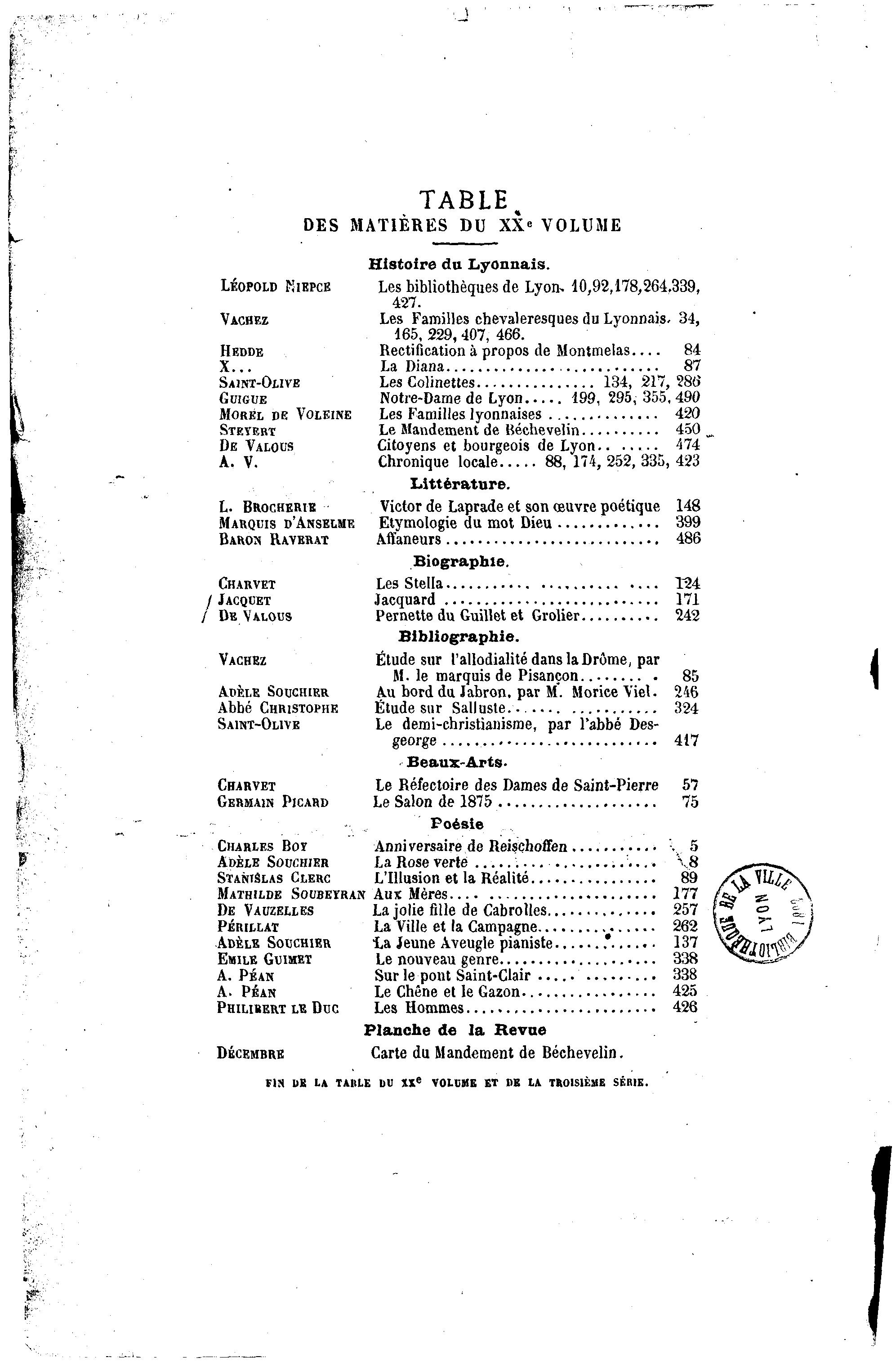 TABLE, DES MATIÈRES DU XX• VOLUME Histoire du Lyonnais. LÉOPOLD EIEPCE Les bibliothèques de Lyon, 10,92,178,264.339, 427. VACHEZ Les Familles chevaleresques du Lyonnais. 34, 165, 229, 407, 466. HEDDE Rectification à propos de Montmelas.... 84 X... La Diana 87 SAINT-OLIVE Les Colinettes 134, 217, ?8(> GUIGUE Notre-Dame de Lyon 199, 295, 355, 490 MOREL DE VOLEINE Les Familles lyonnaises 420 STEYEBT Le Mandement de Béchevelin 450 DE VALOUS Citoyens et bourgeois de Lyon 474 A. V. Chronique locale 88, 174, 252, 335, 423 Littérature. L. BROCHERIB Victor de Laprade et son Å“uvre poétique 148 MARQUIS D'ANSELME Etymologie du mot Dieu 399 BARON RAVERAT Affaneurs 486 Biographie. CHARVET Les Stella 124 / JACQUET Jacquard 171 / DE VALOUS Pernette du Guillet et Grolier 242 Bibliographie. VACHEZ Étude sur l'allodialitédanslaDrôme, par M. le marquis de Pisançon 85 ADÈLE SOUCHIER Au bord du Jabron, par M". Morice Viel. 246 Abbé CHRISTOPHE Étude sur Saliuste. 324 SAINT-OLIVE Le demi-christianisme, par Pabbé Des- george 417 Beaux-Arts- CHARVET Le Réfectoire des Dames de Saint-Pierre 57 GERMAIN PICARD Le Salon de 1875 75 Poésie CHARLES BOY Anniversaire de Reischoifen V5 ADÈLE SOUCHIER La Rose verte \8 STANISLAS CLERC L'Illusion et la Réalité 89 MATHILDE SOUBEÃRAN Au% Mères 177 DE VAUZELLES La jolie fille de Cabrolles 257 PÉRILLAT La Ville et la Campagne 262 ADÈLE SOUCHIER La Jeune Aveugle pianiste .* 137 EMILE GUIMET Le nouveau genre 338 A. PÉAN Sur le pont Saint-Clair . 338 A. PÉAN Le Chêne et le Gazon 425 PHILIBERT LE DUC Les Hommes 426 Planche de l a Revue DÉCEMHRE Carte du Mandement de Béchevelin. FIN UE LA TAULE DU I X e VOLUME ET DE LA TROISIÈME SÉRIE.