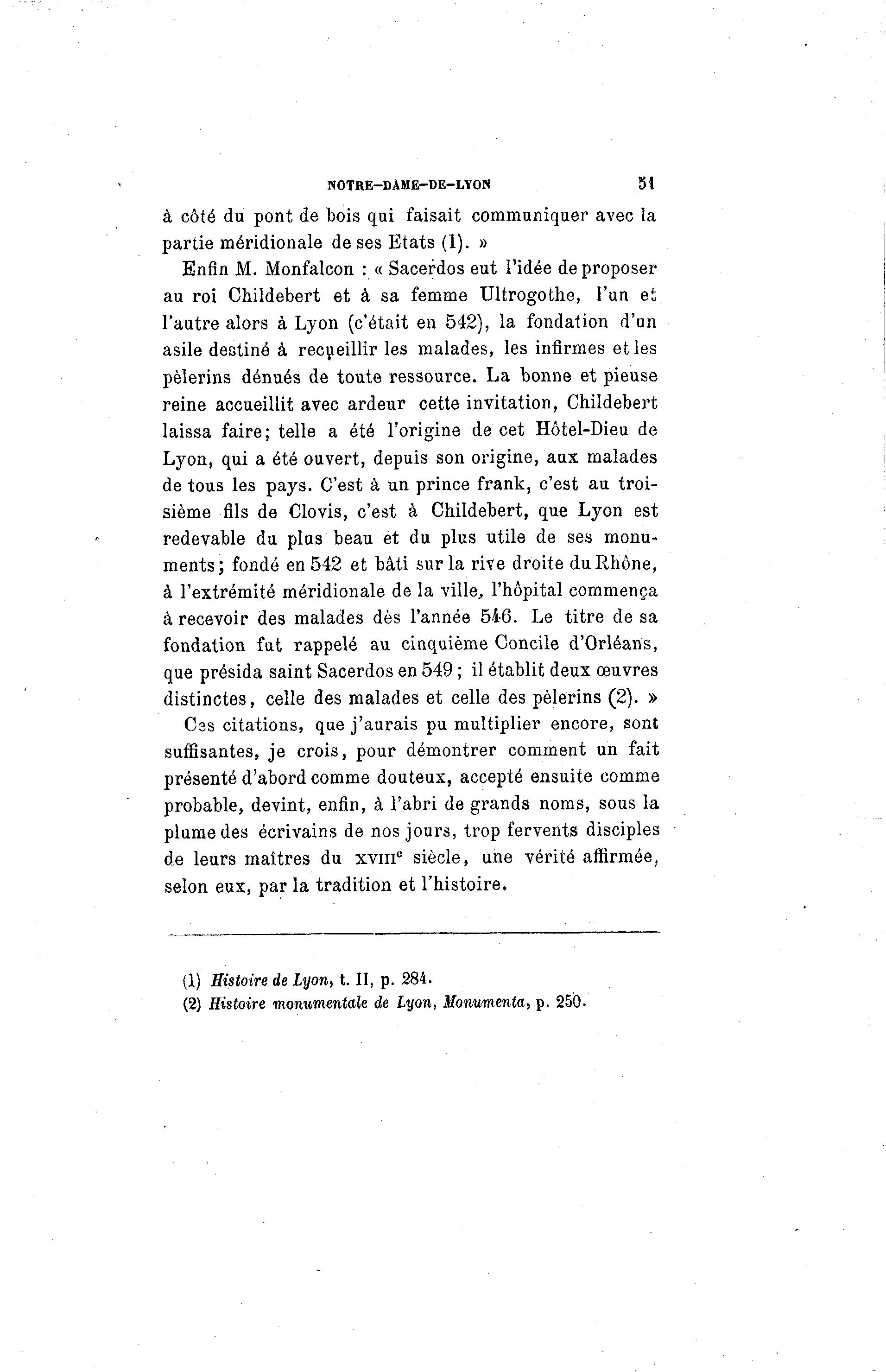 NOTRE-DAME-DE-LYON 51 à côté du pont de bois qui faisait communiquer avec la partie méridionale de ses Etats (1). » Enfin M. Monfalcon : « Sacerdos eut l'idée de proposer au roi Childebert et à sa femme Ultrogothe, l'un et l'autre alors à Lyon (c'était en 542), la fondation d'un asile destiné à recueillir les malades, les infirmes et les pèlerins dénués de toute ressource. La bonne et pieuse reine accueillit avec ardeur cette invitation, Childebert laissa faire; telle a été l'origine de cet Hôtel-Dieu de Lyon, qui a été ouvert, depuis son origine, aux malades de tous les pays. C'est à un prince frank, c'est au troi- sième fils de Clovis, c'est à Childebert, que Lyon est redevable du plus beau et du plus utile de ses monu- ments; fondé en 542 et bâti sur la rive droite du Rhône, à l'extrémité méridionale de la ville, l'hôpital commença à recevoir des malades dès l'année 546. Le titre de sa fondation fut rappelé au cinquième Concile d'Orléans, que présida saint Sacerdos en 549 ; il établit deux œuvres distinctes, celle des malades et celle des pèlerins (2). » Css citations, que j'aurais pu multiplier encore, sont suffisantes, je crois, pour démontrer comment un fait présenté d'abord comme douteux, accepté ensuite comme probable, devint, enfin, à l'abri de grands noms, sous la plume des écrivains de nos jours, trop fervents disciples de leurs maîtres du xvni e siècle, une vérité affirmée, selon eux, par la tradition et l'histoire. (1) Histoire de Lyon, t. II, p. 284. (2) Histoire monumentale de Lyon, Monumenta, p. 250-