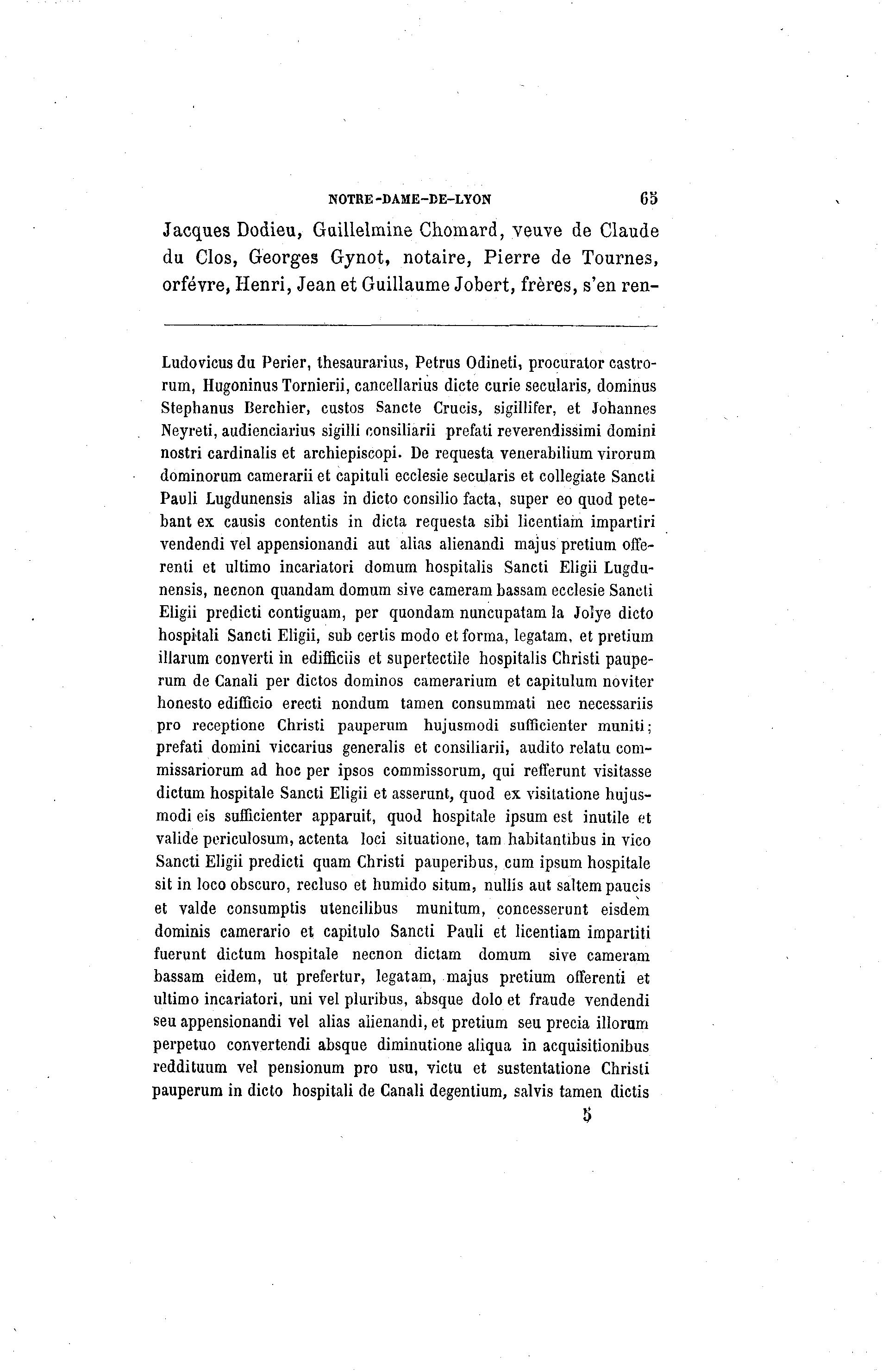 NOTRE -DAME-DE-LYON 65 Jacques Dodieu, Gaillelmme Ciiomard, veuve de Claude du Clos, Georges Gynot, notaire, Pierre de Tournes, orfèvre, Henri, Jean et Guillaume Jobert, frères, s'en ren- Ludovicus du Perier, thesaurarius, Petrus Odineti, procurator castro- rum, Hugoninus Tornierii, cancellarius dicte curie secularis, dominus Stephanus Berchier, custos Sancte Crucis, sigillifer, et Johannes Neyreti, audienciarius sigilli consiliarii prefati reverendissimi domini nostri cardinalis et archiepiscopi. De requesta veuerabilium virorum dominorum camerarii et capituli ecclesie secularis et collegiate Sancti Pauli Lugdunensis alias in dicto consilio facta, super eo quod pete- bant ex causis contentis in dicta requesta sibi licentiam impartiri vendendi Tel appensionandi aut alias alienandi majus pretium offe- renti et ultimo incariatori domum hospitalis Sancti Eligii Lugdu- nensis, necnon quandam domum sive cameram bassam ecclesie Sancti Eligii predicti contiguam, per quondam nuncupatam la Joîye dicto hospitali Sancti Eligii, sub certis modo et forma, legatam, et pretium illarum converti in edimciis et supertectile hospitalis Christi paupe- rum de Canali per dictos dominos camerarium et capitulum noviter honesto edifficio erecti nondum tamen consummati nec necessariis pro receptione Christi pauperum hujusmodi sufficienter muniti; prefati domini viccarius generalis et consiliarii, audito relatu com- missariorum ad hoc per ipsos commissorum, qui refferunt visitasse dictum hospitale Sancti Eligii et asserunt, quod ex visitatione hujus- modi eis sufficienter apparuit, quod hospitale ipsum est inutile et valide periculosum, actenta loci situatione, tam habitantibus in vico Sancti Eligii predicti quam Christi pauperibus, cum ipsum hospitale sit in loco obscuro, recluso et humido situm, nullis aut saltem paucis et valde consumptis utencilibus munitum, concesserunt eisdem dominis camerario et capitulo Sancti Pauli et licentiam impartit! fuerunt dictum hospitale necnon dictam domum sive cameram bassam eidem, ut prefertur, legatam, majus pretium offerenti et ultimo incariatori, uni vel pluribus, absque dolo et fraude vendendi seu appensionandi vel alias alienandi, et pretium seu precia illorum perpetuo convertendi absque diminutione aliqua in acquisitionibus reddituum vel pensionum pro usu, victu et sustentations Christi pauperum in dicto hospitali de Canali degentium, salvis tamen dictis