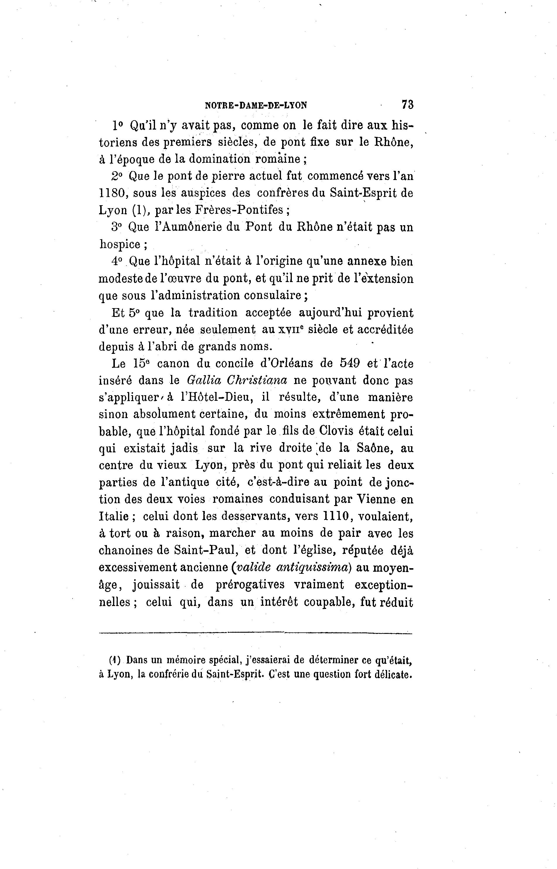 NOTRE-DAME-DE-LYON 73 1° Qu'il n'y avait pas, comme on le fait dire aux his- toriens des premiers siècles, de pont fixe sur le Rhône, à l'époque de la domination romaine ; 2° Que le pont de pierre actuel fut commencé vers l'an 1180, sous les auspices des confrères du Saint-Esprit de Lyon (1), parles Frères-Pontifes ; 3° Que l'Aumônerie du Pont du Rhône n'était pas un hospice ; 4° Que l'hôpital n'était à l'origine qu'une annexe bien modeste de l'œuvre du pont, et qu'il ne prit de l'extension que sous l'administration consulaire ; Et 5° que la tradition acceptée aujourd'hui provient d'une erreur, née seulement au xvne siècle et accréditée depuis à l'abri de grands noms. Le 15e canon du concile d'Orléans de 549 et l'acte inséré dans le Gallia Christiana ne pouvant donc pas s'appliquer'à l'Hôtel-Dieu, il résulte, d'une manière sinon absolument certaine, du moins extrêmement pro- bable, que l'hôpital fondé par le fils de Clovis était celui qui existait jadis sur la rive droite ^de la Saône, au centre du vieux Lyon, près du pont qui reliait les deux parties de l'antique cité, c'est-à -dire au point de jonc- tion des deux voies romaines conduisant par Vienne en Italie ; celui dont les desservants, vers 1110, voulaient, à tort ou à raison, marcher au moins de pair avec les chanoines de Saint-Paul, et dont l'église, re'putée déjà excessivement ancienne (valide antiquissima) au moyen- âge, jouissait de prérogatives vraiment exception- nelles ; celui qui, dans un intérêt coupable, fut réduit (1) Dans un mémoire spécial, j'essaierai de déterminer ce qu'était, à Lyon, la confrérie du Saint-Esprit. C'est une question fort délicate.