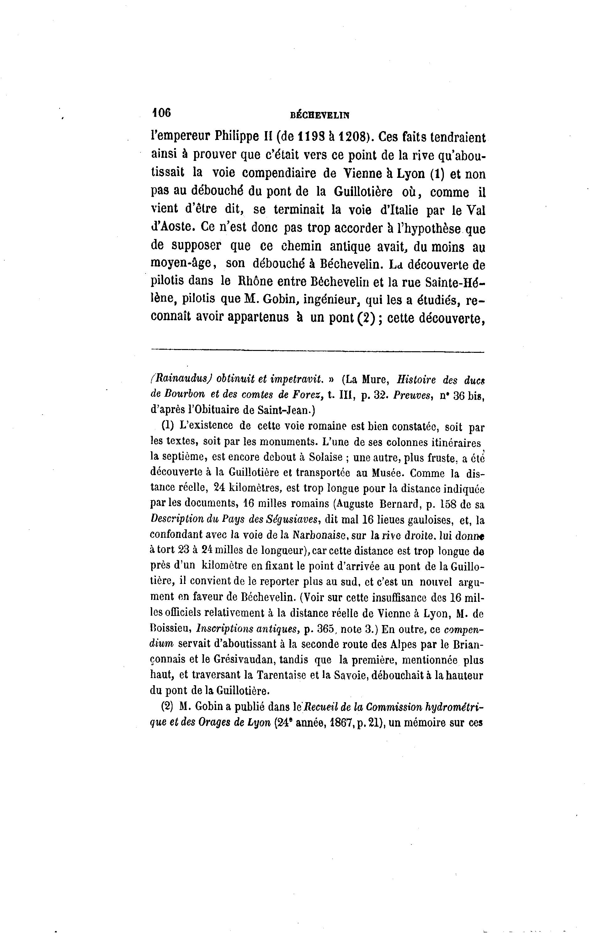106 BÉCHEVELIN l'empereur Philippe H (de 1198 à 1208). Ces faits tendraient ainsi à prouver que c'était vers ce point de la rive qu'abou- tissait la voie compendiaire de Vienne à Lyon (1) et non pas au débouché du pont de la Guillotière où, comme il vient d'être dit, se terminait la voie d'Italie par le Val d'Aoste. Ce n'est donc pas trop accorder à l'hypothèse que de supposer que ce chemin antique avait, du moins au moyen-âge, son débouché à Béchevelin. La découverte de pilotis dans le Rhône entre Béchevelin et la rue Sainte-Hé- lène, pilotis que M. Gobin, ingénieur, qui les a étudiés, re- connaît avoir appartenus à un pont (2) ; cette découverte, fRainaudusJ obtinuit et impetravit. » (La Mure, Histoire des ducs de Bourbon et des comtes de Forez, t. III, p. 32. Preuves, n* 36 bis, d'après l'Obituaire de Saint-Jean.) (1) L'existence de cette voie romaine est bien constatée, soit par les textes, soit par les monuments. L'une de ses colonnes itinéraires la septième, est encore debout à Solaise ; une autre, plus fruste, a été découverte à la Guillotière et transportée au Musée. Comme la dis- tance réelle, 24 kilomètres, est trop longue pour la distance indiquée parles documents, 16 milles romains (Auguste Bernard, p. 158 de sa Description du Pays des Ségusiaves, dit mal 16 lieues gauloises, et, la confondant avec la voie de la Narbonaise, sur la rive droite, lui donne à tort 23 à 24 milles de longueur), car cette distance est trop longue d« près d'un kilomètre en fixant le point d'arrivée au pont de la Guillo- tière, il convient de le reporter plus au sud, et c'est un nouvel argu- ment en faveur de Béchevelin. (Voir sur cette insuffisance des 16 mil- les officiels relativement à la distance réelle de Vienne à Lyon, M. do Boissieu, Inscriptions antiques, p. 365, note 3.) En outre, ce compen- dium servait d'aboutissant à la seconde route des Alpes par le Brian- çonnais et le Grésivaudan, tandis que la première, mentionnée plus haut, et traversant la Tarentaise et la Savoie, débouchait à la hauteur du pont de la Guillotière. (2) M. Gobin a publié dans h'Recueil de la Commission hydrométri- que et des Orages de Lyon (24* année, 1867, p. 21), un mémoire sur ces