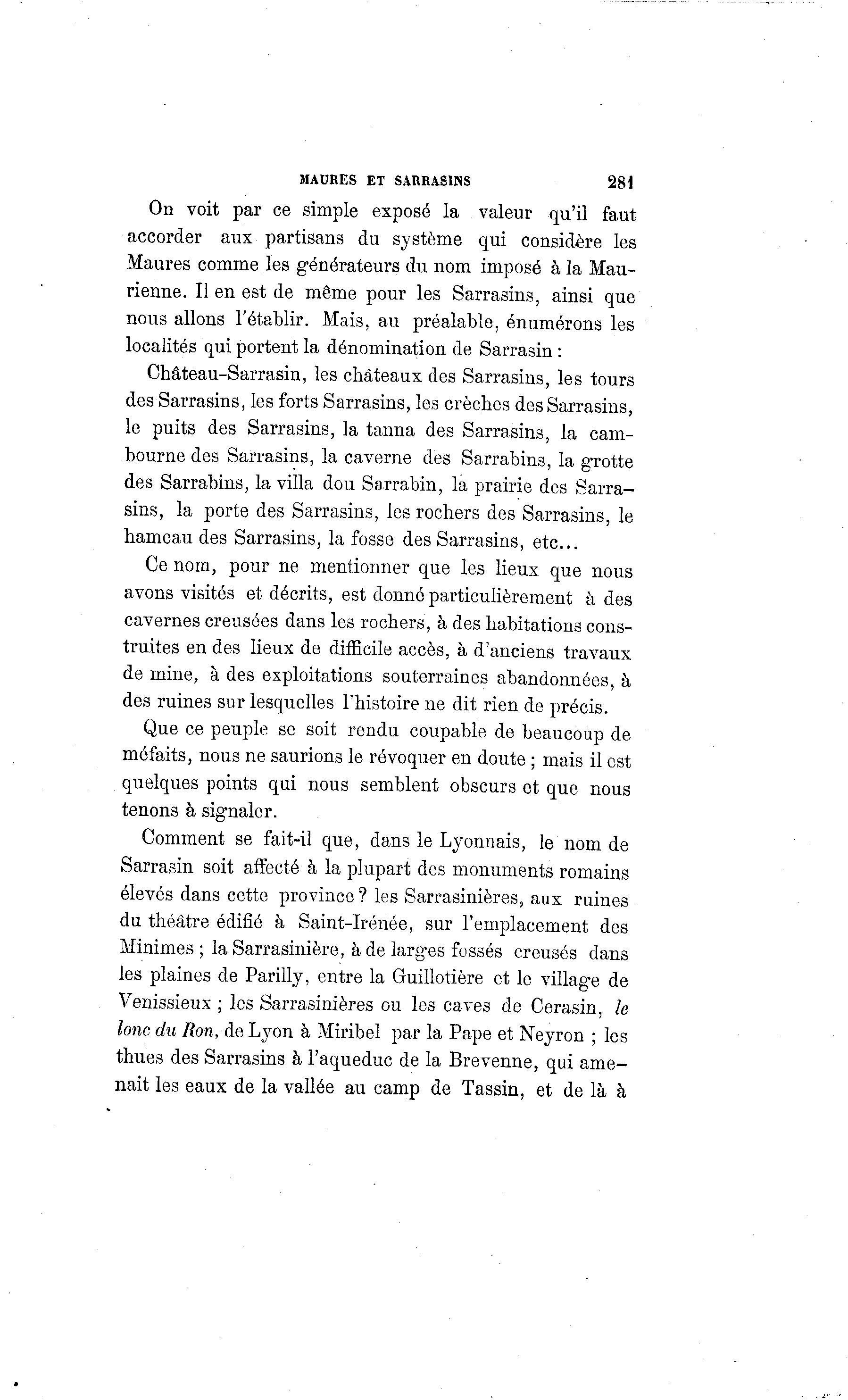 MAURES ET SARRASINS 281 On voit par ce simple exposé la valeur qu'il faut accorder aux partisans du système qui considère les Maures comme les générateurs du nom imposé à la Mau- rienne. Il en est de même pour les Sarrasins, ainsi que nous allons l'établir. Mais, au préalable, énumérons les localités qui portent la dénomination de Sarrasin : Château-Sarrasin, les châteaux des Sarrasins, les tours des Sarrasins, les forts Sarrasins, les crèches des Sarrasins, le puits des Sarrasins, la tanna des Sarrasins, la cam- bourne des Sarrasins, la caverne des Sarrabins, la grotte des Sarrabins, la villa dou Sarrabin, la prairie des Sarra- sins, la porte des Sarrasins, les rochers des Sarrasins, le hameau des Sarrasins, la fosse des Sarrasins, etc.. Ce nom, pour ne mentionner que les lieux que nous avons visités et décrits, est donné particulièrement à des cavernes creusées dans les rochers, à des habitations cons- truites en des lieux de difficile accès, à d'anciens travaux de mine, à des exploitations souterraines abandonnées, à des ruines sur lesquelles l'histoire ne dit rien de précis. Que ce peuple se soit rendu coupable de beaucoup de méfaits, nous ne saurions le révoquer en doute ; mais il est quelques points qui nous semblent obscurs et que nous tenons à signaler. Comment se fait-il que, dans le Lyonnais, le nom de Sarrasin soit affecté à la plupart des monuments romains élevés dans cette province ? les Sarrasinières, aux ruines du théâtre édifié à Saint-Irénée, sur l'emplacement des Minimes ; la Sarrasinière, à de larges fossés creusés dans les plaines de Parilly, entre la Guillotière et le village de Venissieux ; les Sarrasinières ou les caves de Cerasin, le lonc du Ron,à e Lyon à Miribel par la Pape et Neyron ; les thues des Sarrasins à l'aqueduc de la Brevenne, qui ame- nait les eaux de la vallée au camp de Tassin, et de là Ã