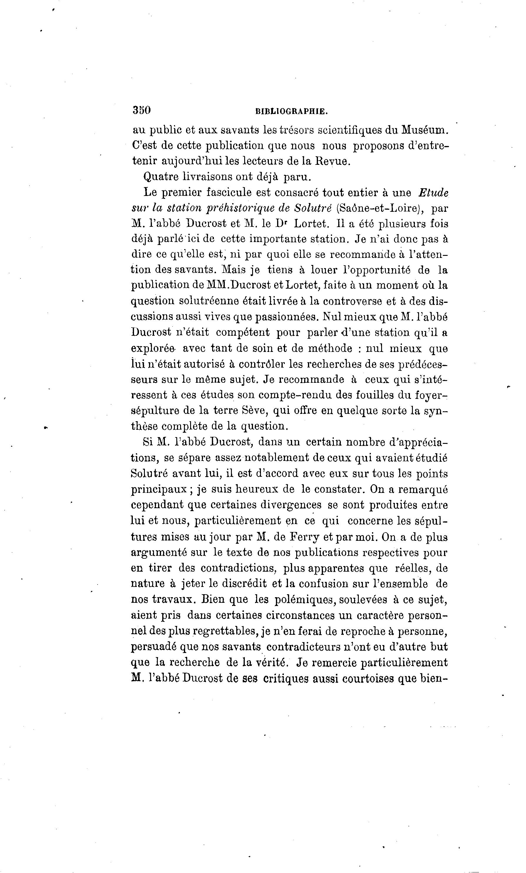 350 BIBLIOGRAPHIE. au public et aux savants les trésors scientifiques du Muséum. C'est de cette publication que nous nous proposons d'entre- tenir aujourd'hui les lecteurs de la Revue. Quatre livraisons ont déjà paru. Le premier fascicule est consacré tout entier à une Etude sur la station préhistorique de Solutré (Saône-et-Loire), par M. l'abbé Ducrost et M. le Dr Lortet. 11 a été plusieurs fois déjà parlé'ici de cette importante station. Je n'ai donc pas à dire ce qu'elle est, ni par quoi elle se recommande à l'atten- tion des savants. Mais je tiens à louer l'opportunité de la publication de MM.Ducrost et Lortet, faite à un moment où la question solutréenne était livrée à la controverse et à des dis- cussions aussi vives que passionnées. Nul mieux que M. l'abbé Ducrost n'était compétent pour parler d'une station qu'il a explorée- avec tant de soin et de méthode : nul mieux que lui n'était autorisé à contrôler les recherches de ses prédéces- seurs sur le même sujet. Je recommande à ceux qui s'inté- ressent à ces études son compte-rendu des fouilles du foyer- sépulture de la terre Sève, qui offre en quelque sorte la syn- thèse complète de la question. Si M. l'abbé Ducrost, dans un certain nombre d'apprécia- tions, se sépare assez notablement de ceux qui avaient étudié Solutré avant lui, il est d'accord avec eux sur tous les points principaux ; je suis heureux de le constater. On a remarqué cependant que certaines divergences se sont produites entre lui et nous, particulièrement en ce qui concerne les sépul- tures mises au jour par M. de Ferry et par moi. On a de plus argumenté sur le texte de nos publications respectives pour en tirer des contradictions, plus apparentes que réelles, de nature à jeter le discrédit et la confusion sur l'ensemble de nos travaux. Bien que les polémiques, soulevées à ce sujet, aient pris dans certaines circonstances un caractère person- nel des plus regrettables, je n'en ferai de reproche à personne, persuadé que nos savants contradicteurs n'ont eu d'autre but que la recherche de la vérité. Je remercie particulièrement M. l'abbé Ducrost de ses critiques aussi courtoises que bien-