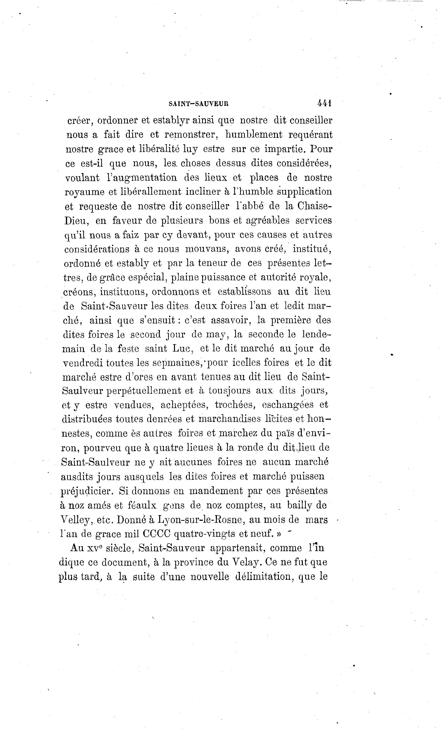 SAINT-SAUVEUU 441 créer, ordonner et establyr ainsi que nostre dit conseiller nous a fait dire et remonstrer, humblement requérant nostre grâce et libéralité luy estre sur ce impartie. Pour ce est-il que nous, les. choses dessus dites considérées, voulant l'augmentation des lieux et places de nostre royaume et libérallement incliner à l'humble supplication et requeste de nostre dit conseiller l'abbé de la Chaise- Dieu, en faveur de plusieurs bons et agréables services qu'il nous a faiz par cy devant, pour ces causes et autres considérations à ce nous mouvans, avons créé, institué, ordonné et estably et par la teneur de ces présentes let- tres, de grâce espécial, plaine puissance et autorité royale, créons, instituons, ordonnons et establissons au dit lieu de Saint-Sauveur les dites deux foires l'an et ledit mar- ché, ainsi que s'ensuit : c'est assavoir, la première des dites foires le second jour de may, la seconde le lende- main d e l à feste saint Luc, et le dit marché au jour de vendredi toutes les sepmaines, - pour icelles foires et le dit marché estre d'ores en avant tenues au dit lieu de Saint- Saulveur perpétuellement et à tousjours aux dits jours, et y estre vendues, acheptées, trochées, eschangées et distribuées toutes denrées et marchandises licites et h o n - nestes, comme es autres foires et marchez du païs d'envi- ron, pourveu que à quatre lieues à la ronde du dit dieu de Saint-Saulveur ne y ait aucunes foires ne aucun marché ausdits jours ausquels les dites foires et marché puissen préjudicier. Si donnons en mandement par ces présentes à noz amés et féaulx gens de noz comptes, au bailly de Velley,.etc. Donné à Lyon-sur-le-Rosne, au mois de mars l'an de grâce mil CCCC quatre-vingts et neuf. » ' Au xv e siècle, Saint-Sauveur appartenait, comme l'în dique ce document, à la province du Velay. Ce ne fut que plus tard., à la suite d'une nouvelle délimitation, que le