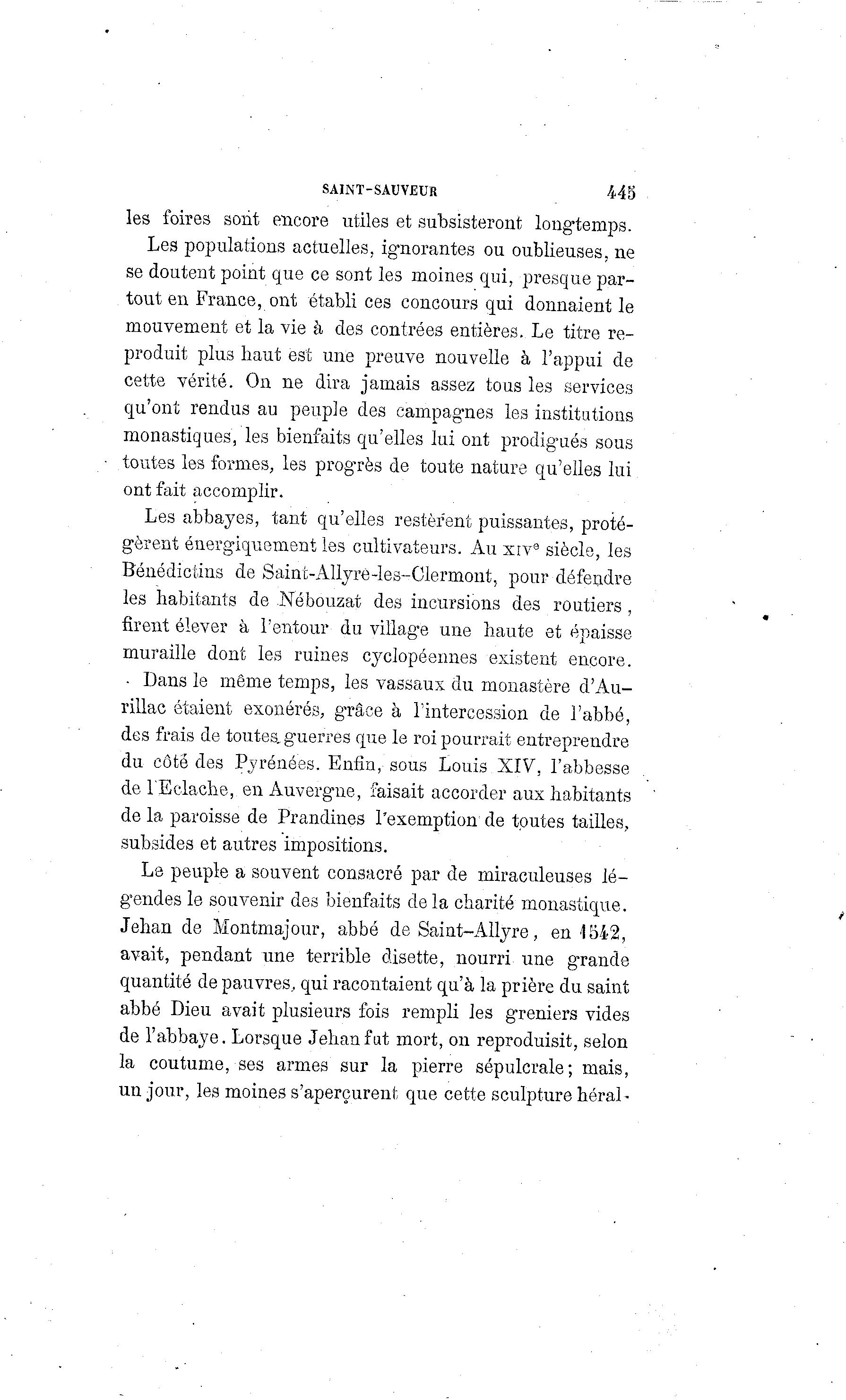 SAINT-SAUVEUR 445 les foires sont encore utiles et subsisteront longtemps. Les populations actuelles, ignorantes ou oublieuses, ne se doutent point que ce sont les moines qui, presque par- tout en France, ont établi ces concours qui donnaient le mouvement et la vie à des contrées entières. Le titre re- produit plus haut est une preuve nouvelle à l'appui de cette vérité. On ne dira jamais assez tous les services qu'ont rendus au peuple des campagnes les institutions monastiques, les bienfaits qu'elles lui ont prodigués sous toutes les formes, les progrès de toute nature qu'elles lui ont fait accomplir. Les abbayes, tant qu'elles restèrent puissantes, proté- gèrent énergiquement les cultivateurs. Au xrv 8 siècle, les Bénédictins de Saint-Allyré-les-Clermont, pour défendre les habitants de .Nébouzat des incursions des routiers , firent élever à l'entour du village une haute et épaisse muraille dont les ruines cyclopéennes existent encore. • Dans le même temps, les vassaux du monastère d'Au- rillac étaient exonérés, grâce à l'intercession de l'abbé, des frais de toutes, guerres que le roi pourrait entreprendre du côté des Pyrénées. Enfin, sous Louis XIV, l'abbesse de l'Eclache, en Auvergne, faisait accorder aux habitants de la paroisse de Prandines l'exemption de toutes tailles, subsides et autres impositions. Le peuple a souvent consacré par de miraculeuses l é - gendes le souvenir des bienfaits de la charité monastique. Jehan de Montmajour, abbé de Saint-AUyre, en 1542, avait, pendant une terrible disette, nourri une grande quantité de pauvres, qui racontaient qu'à la prière du saint abbé Dieu avait plusieurs fois rempli les greniers vides de l'abbaye. Lorsque Jehan fut mort, on reproduisit, selon la coutume, ses armes sur la pierre sépulcrale; mais, un jour, les moines s'aperçurent que cette sculpture héral-