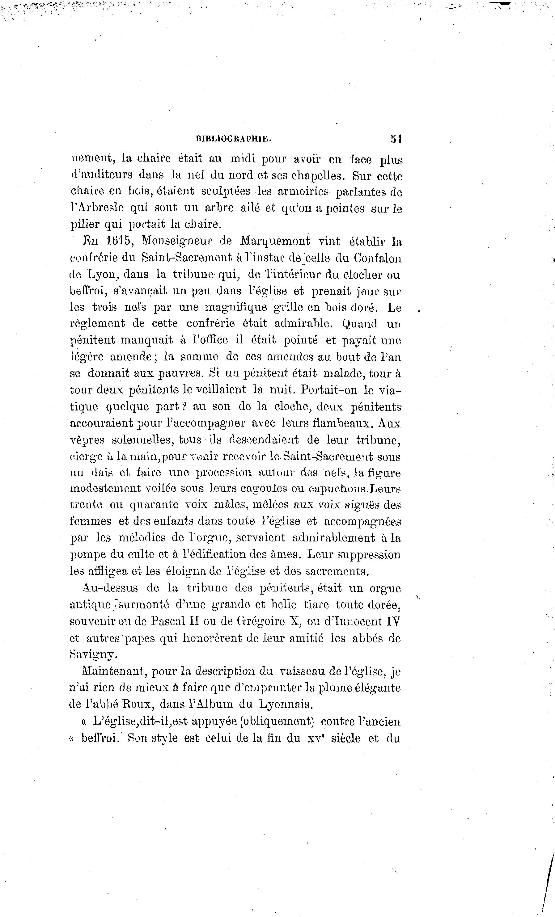 HIBM0GRAPH1E. 51 nement, la chaire était au midi pour avoir en face plus d'auditeurs dans la nef du nord et ses chapelles. Sur cette chaire en bois, étaient sculptées les armoiries parlantes de l'Àrbresle qui sont un arbre ailé et qu'on a peintes sur le pilier qui portait la chaire. En 1615, Monseigneur de Marquemont vint établir la confrérie du Saint-Sacrement à l'instar de celle du Confalon de Lyon, dans la tribune- qui, de l'intérieur du clocher ou beffroi, s'avançait un peu dans l'église et prenait jour sur les trois nefs par une magnifique grille en bois doré. Le règlement de cette confrérie était admirable. Quand un pénitent manquait à Foffîce il était pointé et payait une légère amende ; la somme de ces amendes au bout de l'an se donnait aux pauvres. Si un pénitent était malade, tour à tour deux pénitents le veillaient la nuit. Portait-on le via- tique quelque part ? au son de la cloche, deux pénitents accouraient pour l'accompagner avec leurs flambeaux. Aux vêpres solennelles, tous ils descendaient de leur tribune, cierge à la main,pour voair recevoir le Saint-Sacrëment sous un dais et faire une procession autour des nefs, la figure modestement voilée sous leurs cagoules ou capuchons.Leurs trente ou quarante voix mâles, mêlées aux voix aiguës des femmes et des enfants dans toute l'église et accompagnées par les mélodies de l'orgue, servaient admirablement à la pompe du culte et à l'édification des âmes. Leur suppression les affligea et les éloigna de l'église et des sacrements. Au-dessus de la tribune des pénitents, était un orgue antique "surmonté d'une grande et belle tiare toute dorée, souvenir ou de Pascal II ou de Grégoire X, ou d'Innocent IV et autres papes qui honorèrent de leur amitié les abbés de Savigny. Maintenant, pour la description du vaisseau de l'église, je n'ai rien de mieux à faire que d'emprunter la plume élégante de l'abbé Roux, dans l'Album du Lyonnais. s L'église,dit-il,est appuyée, (obliquement) contre l'ancien « beffroi. Son style est celui de la fin du xv" siècle et du