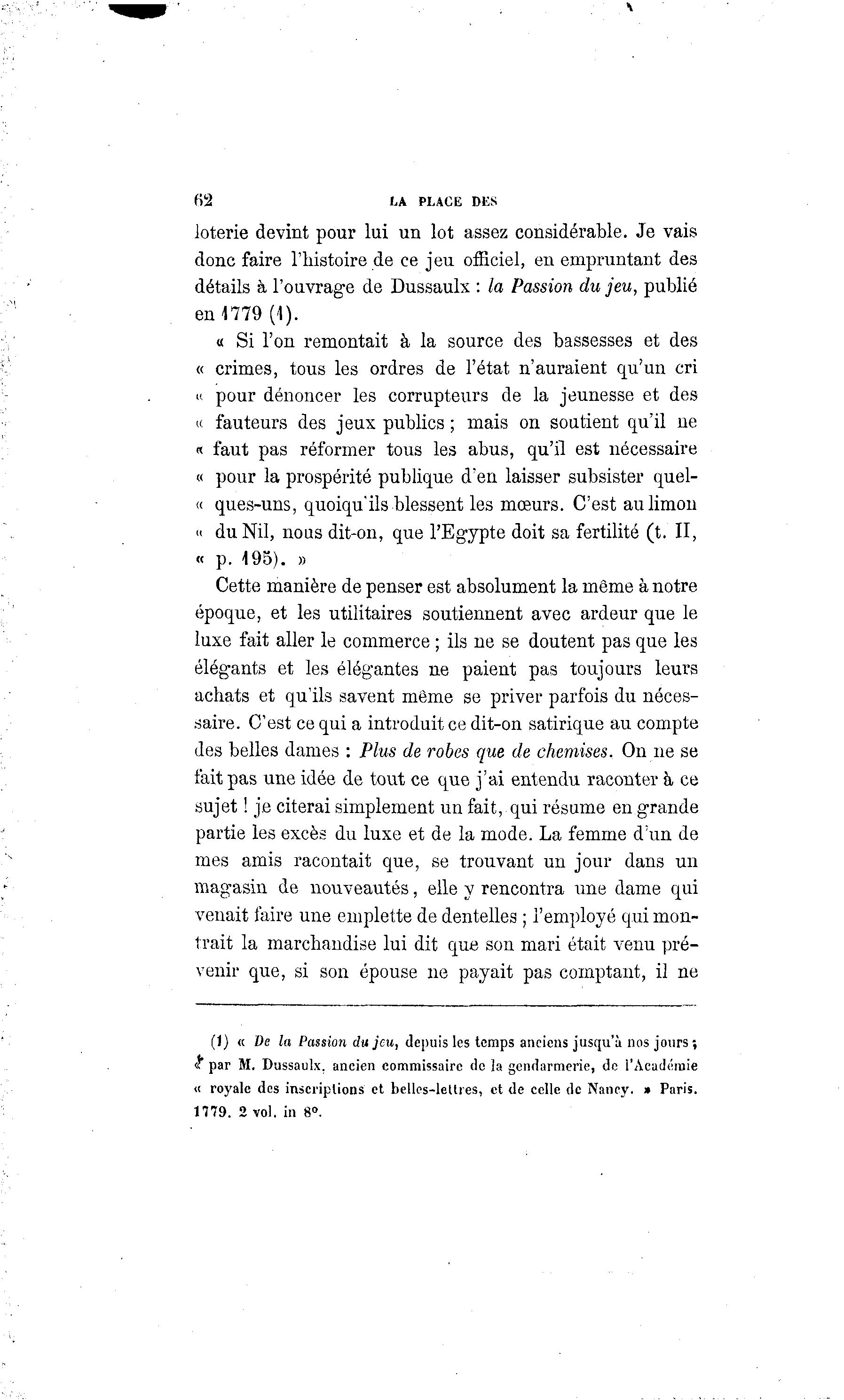 f)2 LA PLACE DES loterie devint pour lui un lot assez considérable. Je vais donc faire l'histoire de ce jeu officiel, en empruntant des détails à l'ouvrage de Dussaulx : la Passion du jeu, publié en 1779(1). « Si l'on remontait à la source des bassesses et des « crimes, tous les ordres de l'état n'auraient qu'un cri « pour dénoncer les corrupteurs de la jeunesse et des « fauteurs des jeux publics ; mais on soutient qu'il ne « faut pas réformer tous les abus, qu'il est nécessaire « pour la prospérité publique d'en laisser subsister quel- c ques-uns, quoiqu'ils blessent les mœurs. C'est au limon e « du Nil, nous dit-on, que l'Egypte doit sa fertilité (t. II, « p. 195). » Cette manière de penser est absolument la même à notre époque, et les utilitaires soutiennent avec ardeur que le luxe fait aller le commerce ; ils ne se doutent pas que les élégants et les élégantes ne paient pas toujours leurs achats et qu'ils savent même se priver parfois du néces- saire. C'est ce qui a introduit ce dit-on satirique au compte des belles dames : Plus de robes que de chemises. On ne se fait pas une idée de tout ce que j'ai entendu raconter à ce sujet ! je citerai simplement un fait, qui résume en grande partie les excès du luxe et de la mode. La femme d'un de mes amis racontait que, se trouvant un jour dans un magasin de nouveautés, elle y rencontra une dame qui venait faire une emplette de dentelles ; l'employé qui mon- trait la marchandise lui dit que son mari était venu pré- venir que, si son épouse ne payait pas comptant, il ne (1) « De la Passion du jeu, depuis les temps anciens jusqu'à nos jours ; « par M. Dussaulx. ancien commissaire de la gendarmerie, de l'Académie « royale des inscriptions et belles-lettres, et de celle de Nancy. » Paris. 1779. 2 vol. in 8°.