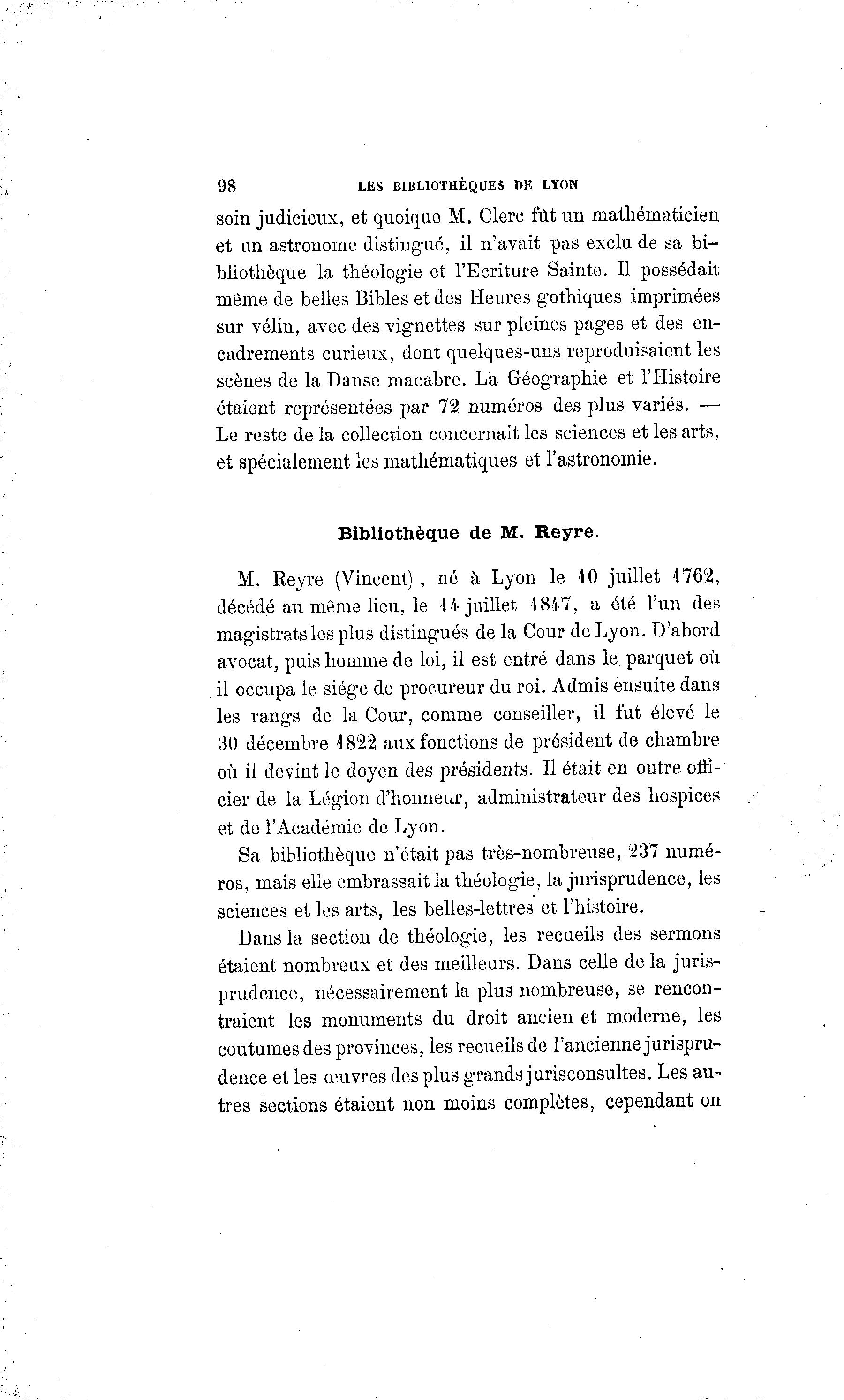 98 LES BIBLIOTHÈQUES DE LYON soin judicieux, et quoique M. Clerc fût un mathématicien et un astronome distingué, il n'avait pas exclu de sa bi- bliothèque la théologie et l'Ecriture Sainte. Il possédait môme de belles Bibles et des Heures gothiques imprimées sur vélin, avec des vignettes sur pleines pages et des en- cadrements curieux, dont quelques-uns reproduisaient les scènes de la Danse macabre. La Géographie et l'Histoire étaient représentées par 72 numéros des plus variés. — Le reste de la collection concernait les sciences et les arts, et spécialement les mathématiques et l'astronomie. Bibliothèque de M. Reyre. M. Reyre (Vincent) , né à Lyon le 10 juillet 1762, décédé au infime lieu, le 14 juillet 1847, a été l'un des magistrats les plus distingués de la Cour de Lyon. D'abord avocat, puis homme de loi, il est entré dans le parquet où il occupa le siège de procureur du roi. Admis ensuite dans les rangs de la Cour, comme conseiller, il fut élevé le 'M) décembre 1822 aux fonctions de président de chambre où il devint le doyen des présidents. Il était en outre offi- cier de la Légion d'honneur, administrateur des hospices et de l'Académie de Lyon. Sa bibliothèque n'était pas très-nombreuse, 237 numé- ros, mais elle embrassait la théologie, la jurisprudence, les sciences et les arts, les belles-lettres et l'histoire. Dans la section de théologie, les recueils des sermons étaient nombreux et des meilleurs. Dans celle de la juris- prudence, nécessairement la plus nombreuse, se rencon- traient les monuments du droit ancien et moderne, les coutumes des provinces, les recueils de l'ancienne jurispru- dence et les œuvres des plus grands jurisconsultes. Les au- tres sections étaient non moins complètes, cependant on
