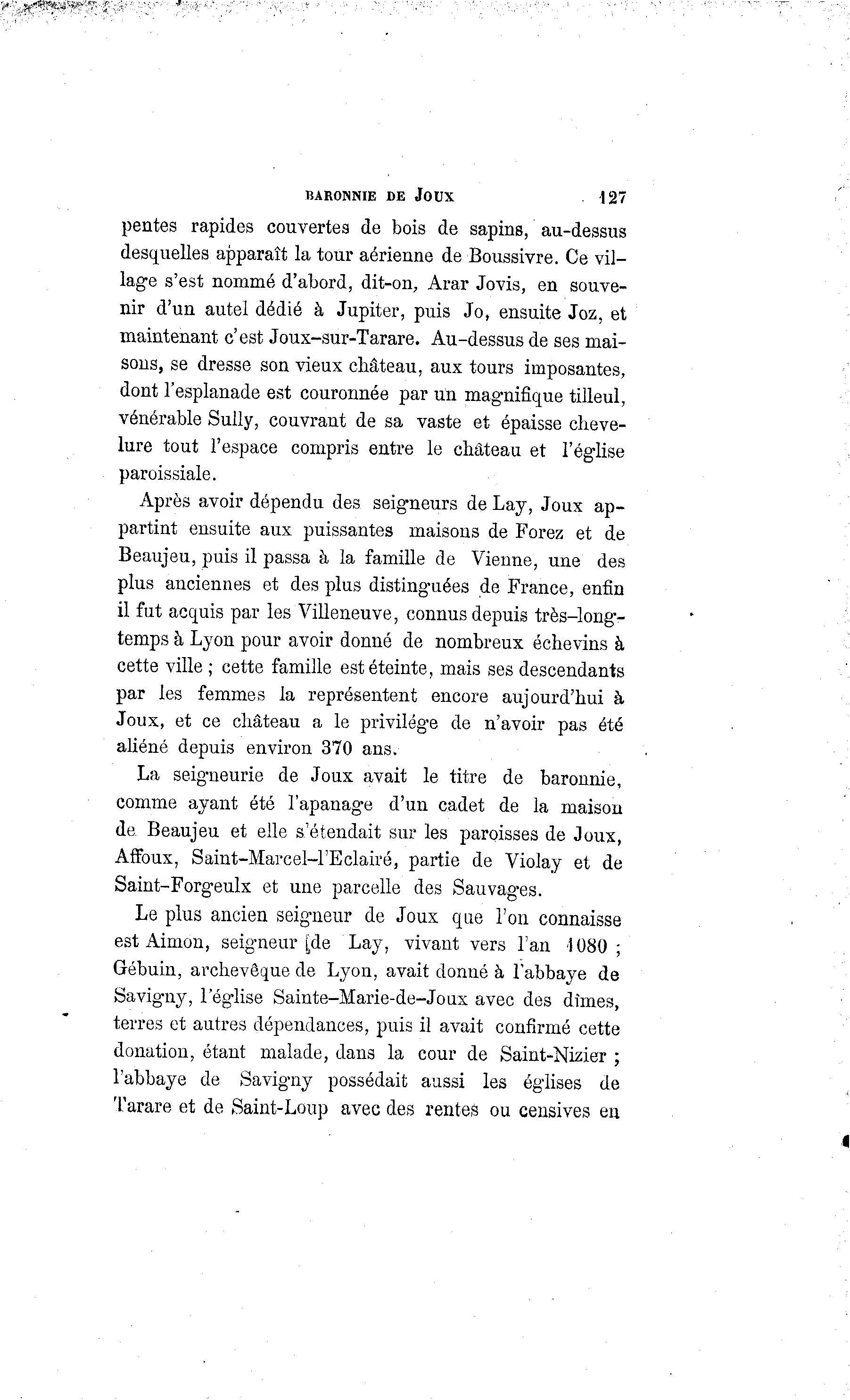BARONNIE DE JOUX 127 pentes rapides couvertes de bois de sapins, au-dessus desquelles apparaît la tour aérienne de Boussivre. Ce vil- lage s'est nommé d'abord, dit-on, Arar Jovis, en souve- nir d'un autel dédié à Jupiter, puis Jo, ensuite Joz, et maintenant c'est Joux-sur-Tarare. Au-dessus de ses mai- sons, se dresse son vieux château, aux tours imposantes, dont l'esplanade est couronnée par un magnifique tilleul, vénérable Sully, couvrant de sa vaste et épaisse cheve- lure tout l'espace compris entre le château et l'église paroissiale. Après avoir dépendu des seigneurs de Lay, Joux ap- partint ensuite aux puissantes maisons de Forez et de Beaujeu, puis il passa à la famille de Vienne, une des plus anciennes et des plus distinguées de France, enfin il fut acquis par les Villeneuve, connus depuis très-long- temps à Lyon pour avoir donné de nombreux échevins à cette ville ; cette famille est éteinte, mais ses descendants par les femmes la représentent encore aujourd'hui à Joux, et ce château a le privilège de n'avoir pas été aliéné depuis environ 370 ans. La seigneurie de Joux avait le titre de baronnie, comme ayant été l'apanage d'un cadet de la maison de. Beaujeu et elle s'étendait sur les paroisses de Joux, Affoux, Saint-Marcel-l'Eclairé, partie de Violay et de Saint-Forgeulx et une parcelle des Sauvages. Le plus ancien seigneur de Joux que l'on connaisse est Aimon, seigneur [de Lay, vivant vers l'an 1080 ; Gébuin, archevêque de Lyon, avait donné à l'abbaye de Savigny, l'église Sainte-Marie-de-Joux avec des dîmes, terres et autres dépendances, puis il avait confirmé cette donation, étant malade, dans la cour de Saint-Nizier ; l'abbaye de Savigny possédait aussi les églises de Tarare et de Saint-Loup avec des rentes ou censives en