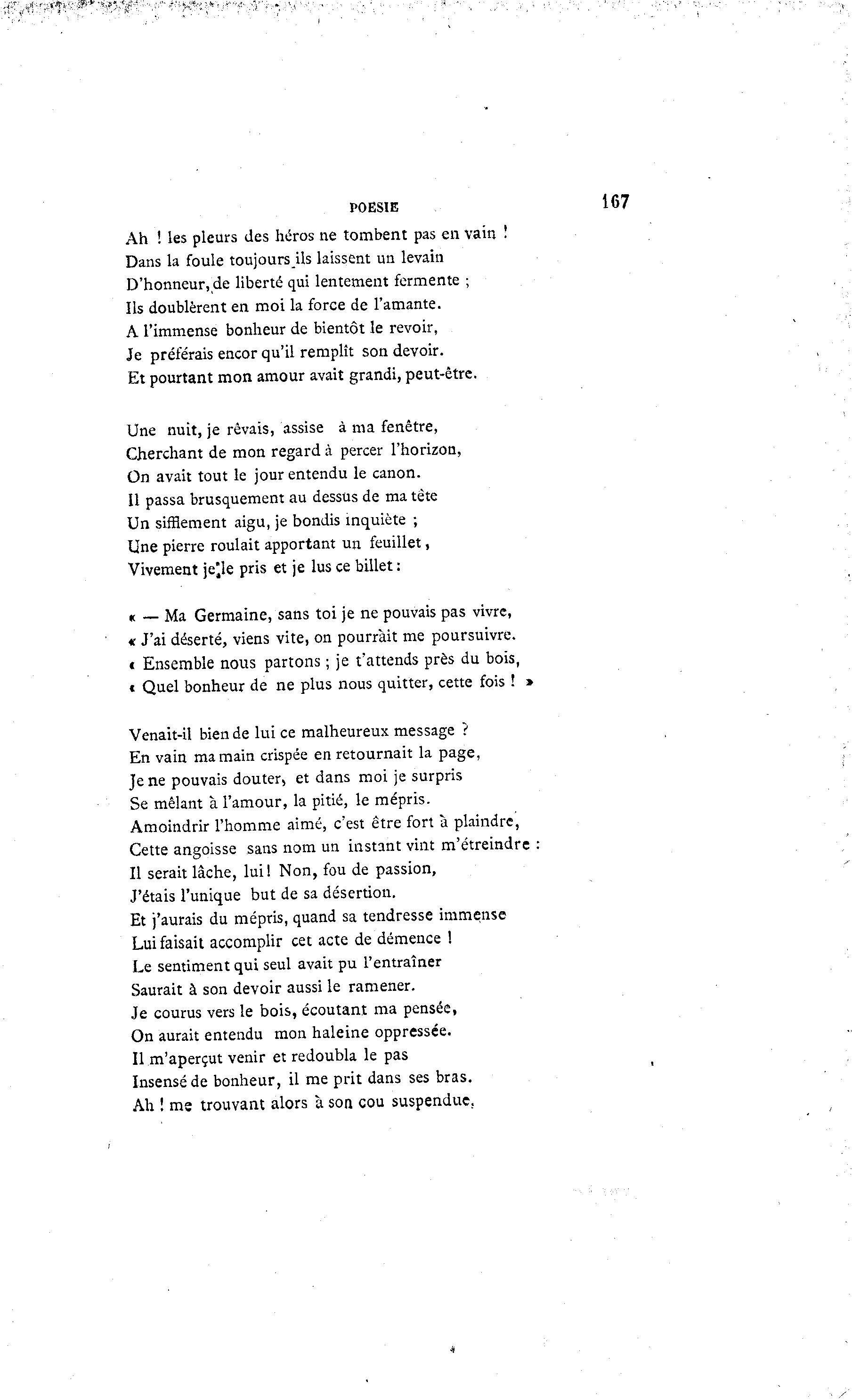 POESIE Ah ! les pleurs des héros ne tombent pas en vain ! Dans la foule toujours ils laissent un levain D'honneur, de liberté qui lentement fermente ; Us doublèrent en moi la force de l'amante. A l'immense bonheur de bientôt le revoir, Je préférais encor qu'il remplît son devoir. Et pourtant mon amour avait grandi, peut-être. Une nuit, je rêvais, assise à ma fenêtre, Cherchant de mon regard à percer l'horizon, On avait tout le jour entendu le canon. Il passa brusquement au dessus de ma tête Un sifflement aigu, je bondis inquiète ; Une pierre roulait apportant un feuillet, Vivement je^le pris et je lus ce billet: « — Ma Germaine, sans toi je ne pouvais pas vivre, « J'ai déserté, viens vite, on pourrait me poursuivre, t Ensemble nous partons ; je t'attends près du bois, « Quel bonheur de ne plus nous quitter, cette fois ! » Venait-il bien de lui ce malheureux message ? En vain ma main crispée en retournait la page, Je ne pouvais douter, et dans moi je surpris Se mêlant à l'amour, la pitié, le mépris. Amoindrir l'homme aimé, c'est être fort à plaindre, Cette angoisse sans nom un instant vint m'étreindre : Il serait lâche, lui! Non, fou de passion, J'étais l'unique but de sa désertion. Et j'aurais du mépris, quand sa tendresse immense Lui faisait accomplir cet acte de démence ! Le sentiment qui seul avait pu l'entraîner Saurait à son devoir aussi le ramener. Je courus vers le bois, écoutant ma pensée, On aurait entendu mon haleine oppressée. Il m'aperçut venir et redoubla le pas Insensé de bonheur, il me prit dans ses bras. Ah ! ms trouvant alors à son cou suspendue.