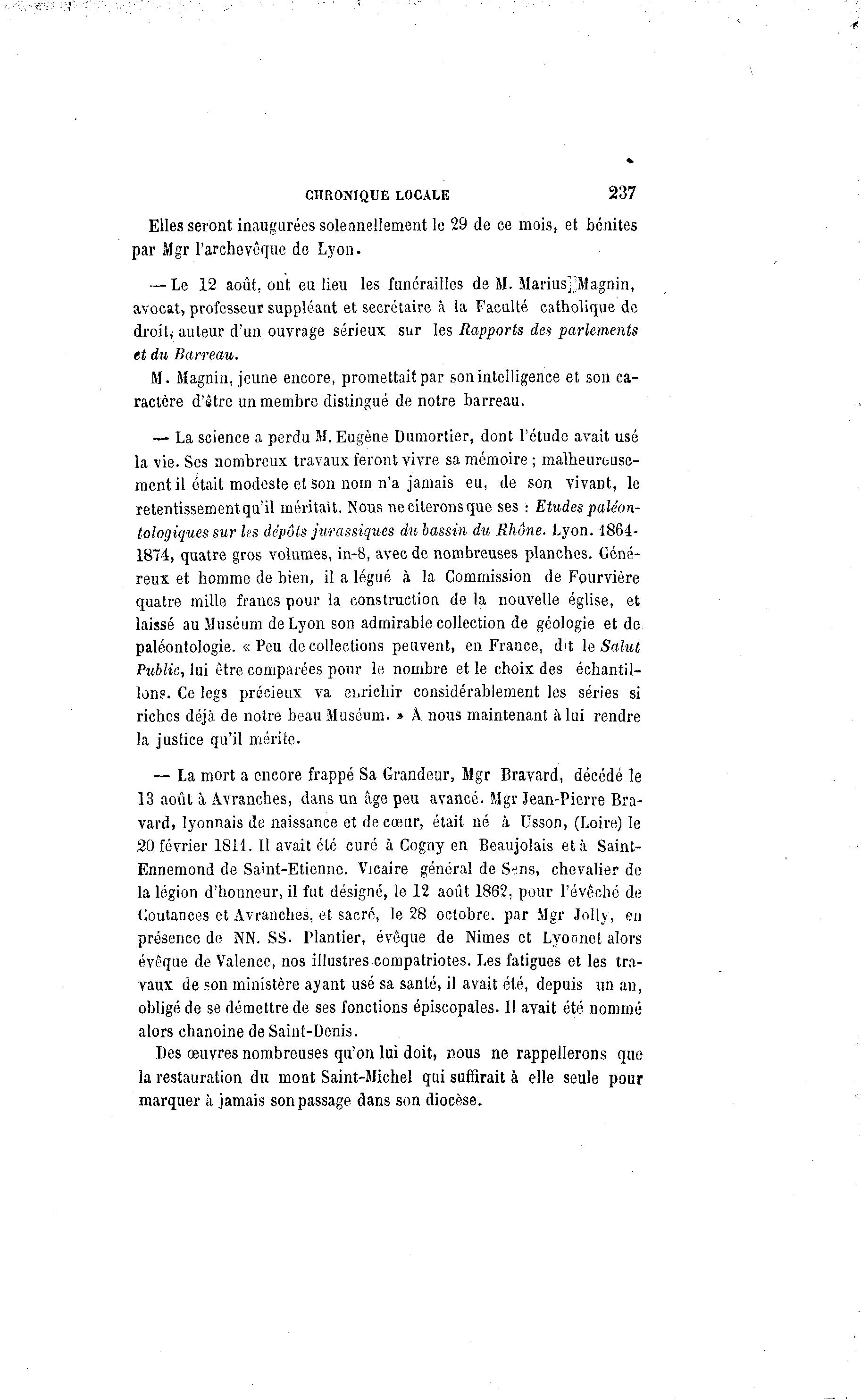 CHRONIQUE LOCALE 237 Elles seront inaugurées solennellement le 29 de ce mois, et bénites par Mgr l'archevêque de Lyon. — Le 12 août, ont eu lieu les funérailles de M. Marius^Magnin, avocat, professeur suppléant et secrétaire à la Faculté catholique de droit; auteur d'un ouvrage sérieux sur les Rapports des parlements et du Barreau. M. Magnin, jeune encore, promettait par son intelligence et son ca- ractère d'être un membre distingué de notre barreau. — La science a perdu M. Eugène Dumortier, dont l'étude avait usé la vie. Ses nombreux travaux feront vivre sa mémoire ; malheureuse- ment il était modeste et son nom n'a jamais eu, de son vivant, le retentissement qu'il méritait. Nous ne citerons que ses : Etudes paléon- tologiques sur les dépôts jurassiques du bassin du Rhône. Lyon. 1864- 1874, quatre gros volumes, irt-8, avec de nombreuses planches. Géné- reux et homme de bien, il a légué à la Commission de Fourvière quatre mille francs pour la construction de la nouvelle église, et laissé au Muséum de Lyon son admirable collection de géologie et de paléontologie. « Peu de collections peuvent, en France, dit le Salut Publie, lui être comparées pour le nombre et le choix des échantil- lons. Ce legs précieux va ei.richir considérablement les séries si riches déjà de notre beau Muséum. » Â nous maintenant à lui rendre la justice qu'il mérite. — La mort a encore frappé Sa Grandeur, Mgr Bravard, décédé le 13 août à Arranches, dans un âge peu avancé. Mgr Jean-Pierre Bra- vard, lyonnais de naissance et de cœur, était né à Usson, (Loire) le 20 février 1811. Il avait été curé à Cogny en Beaujolais et à Saint- Ennemond de Saint-Etienne. Vicaire général de S^ns, chevalier de la légion d'honneur, il fut désigné, le 12 août 1862. pour l'évêché de Coutances et Avranches, et sacré, le 28 octobre, par Mgr Jolly, en présence de NN. SS. Plantier, évêque de Nimes et Lyoonet alors évèque de Valence, nos illustres compatriotes. Les fatigues et les tra- vaux de son ministère ayant usé sa santé, il avait été, depuis un au, obligé de se démettre de ses fonctions épiscopales. Il avait été nommé alors chanoine de Saint-Denis. Des œuvres nombreuses qu'on lui doit, nous ne rappellerons que la restauration du mont Saint-Michel qui suffirait à elle seule pour marquer à jamais son passage dans son diocèse.